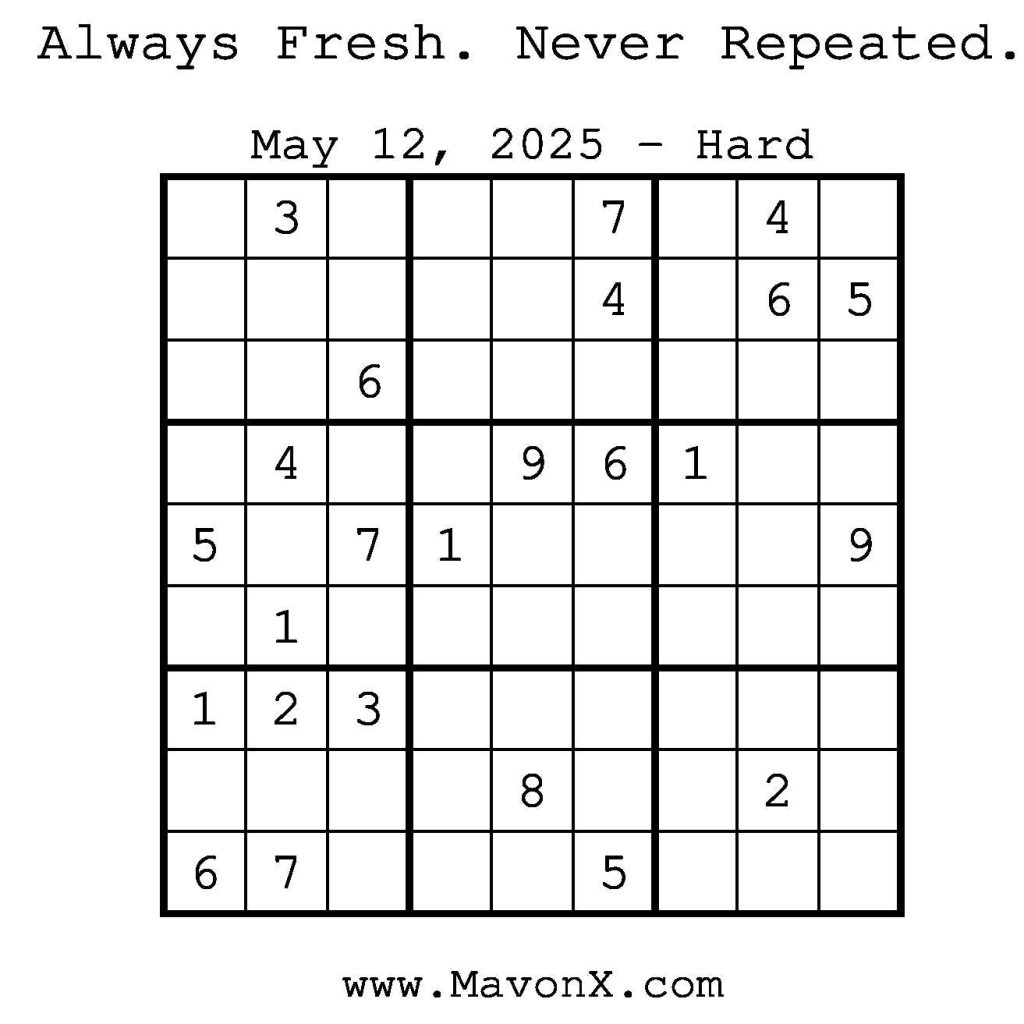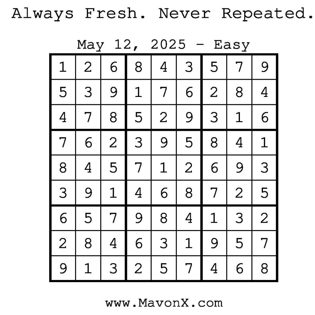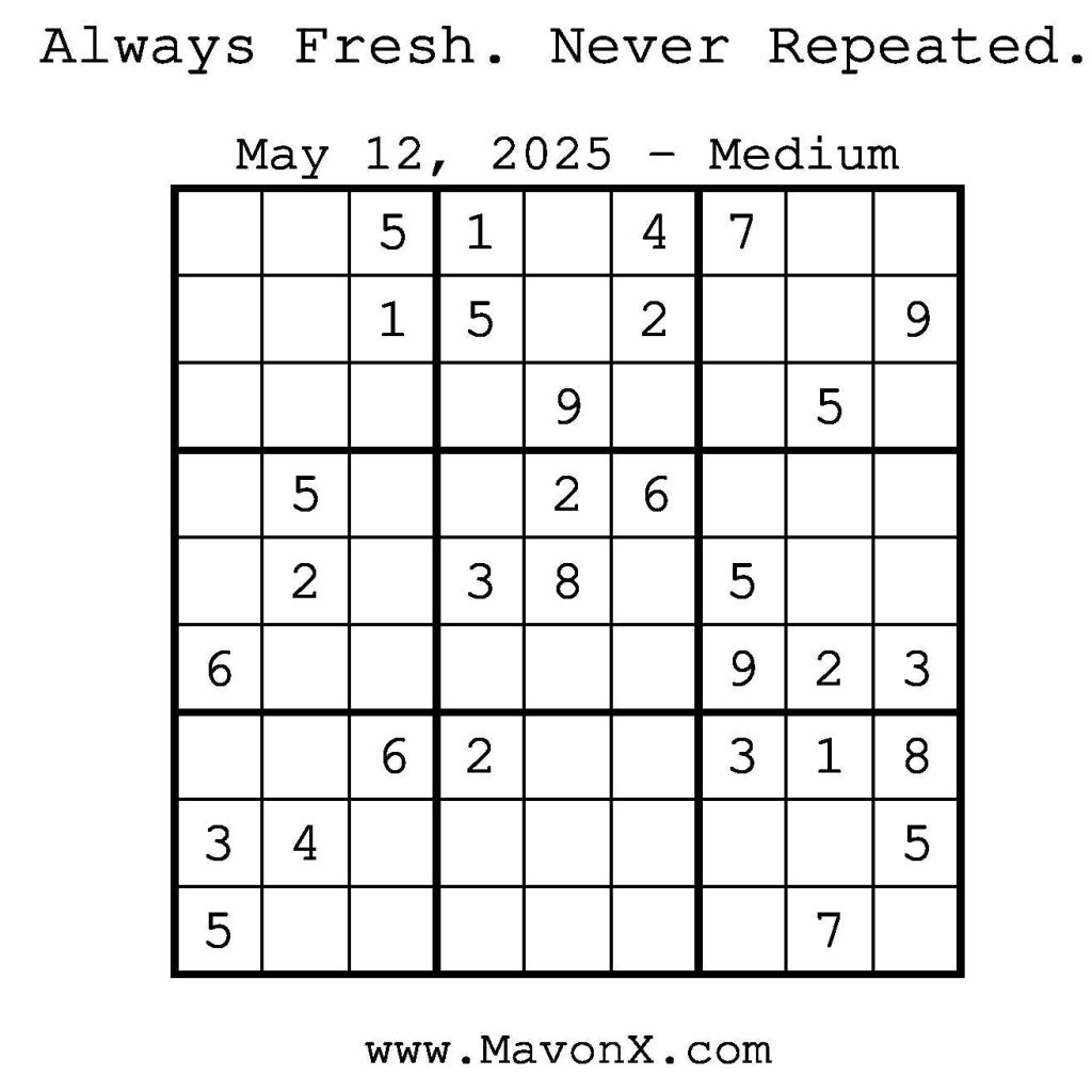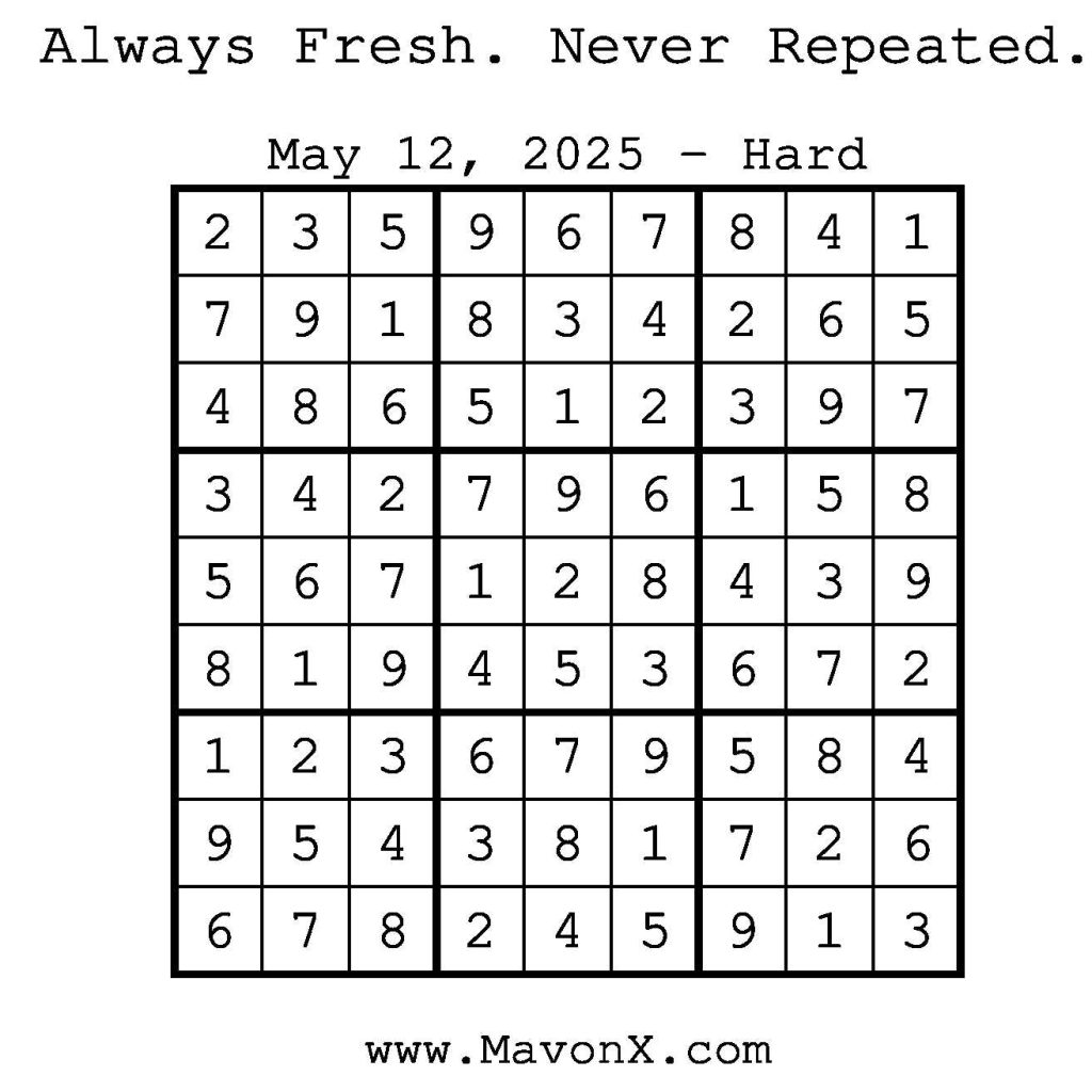 Puzzles of the Day – May 12, 2025 Post author:admin Post published:May 12, 2025 Post category:Free Stuff / Puzzle of the Day / Puzzle of the Day Solutions / Solutions Post comments:0 Comments Check out our books on Amazon! Check out our books on Barnes and Noble! Check out our books on Etsy! Easy Sudoku Coach Link Medium Sudoku Coach Link Hard Sudoku Coach Link Show Solution You Might Also Like Puzzles of the Day – October 16, 2024 October 16, 2024 Puzzles of the Day – February 3, 2025 February 3, 2025 Puzzles of the Day – January 12, 2026 January 12, 2026 Leave a Reply Cancel replyCommentEnter your name or username to comment Enter your email address to comment Enter your website URL (optional) Save my name, email, and website in this browser for the next time I comment.