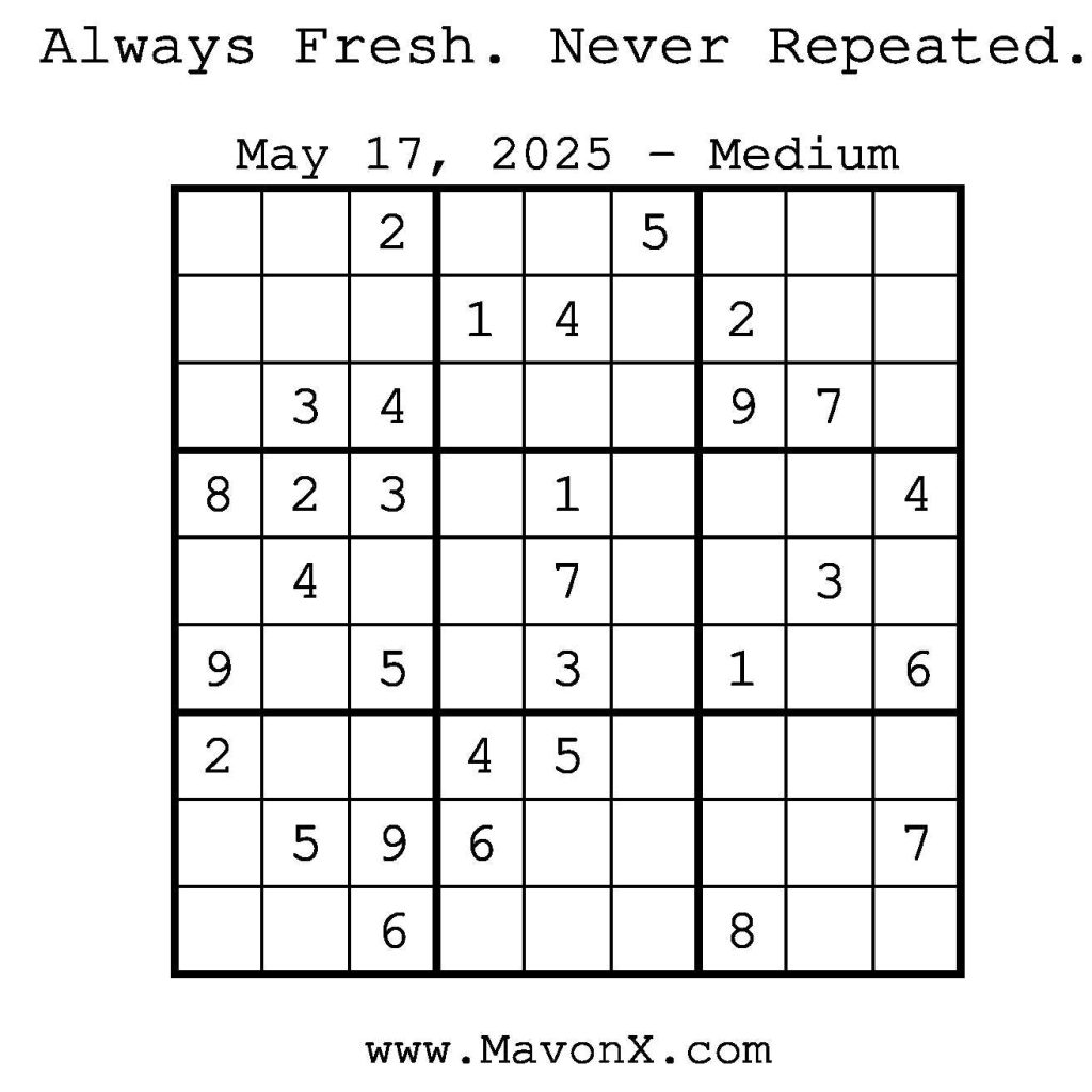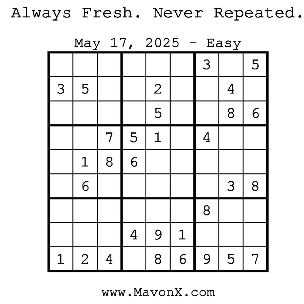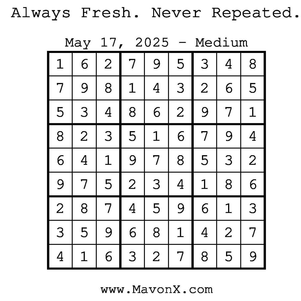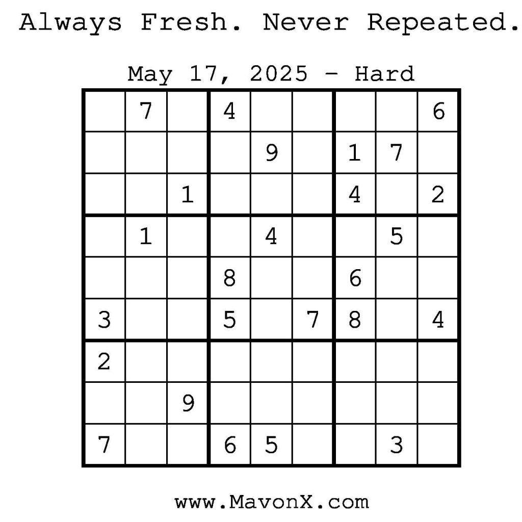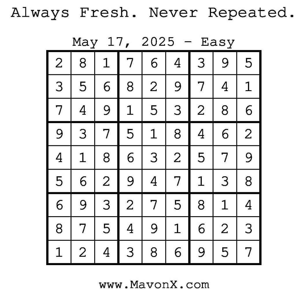 Puzzles of the Day – May 17, 2025 Post author:admin Post published:May 16, 2025 Post category:Free Stuff / Puzzle of the Day / Puzzle of the Day Solutions / Solutions Post comments:0 Comments Check out our books on Amazon! Check out our books on Barnes and Noble! Check out our books on Etsy! Easy Sudoku Coach Link Medium Sudoku Coach Link Hard Sudoku Coach Link Show Solution You Might Also Like Puzzles of the Day – October 4, 2025 October 3, 2025 Exciting News: MavonX’s Sudoku Expedition: The Double Monthly Challenge – Issue 2: 216 Puzzles for Daily Fun! #2 July 31, 2024 Puzzles of the Day – September 21, 2024 September 21, 2024 Leave a Reply Cancel replyCommentEnter your name or username to comment Enter your email address to comment Enter your website URL (optional) Save my name, email, and website in this browser for the next time I comment.