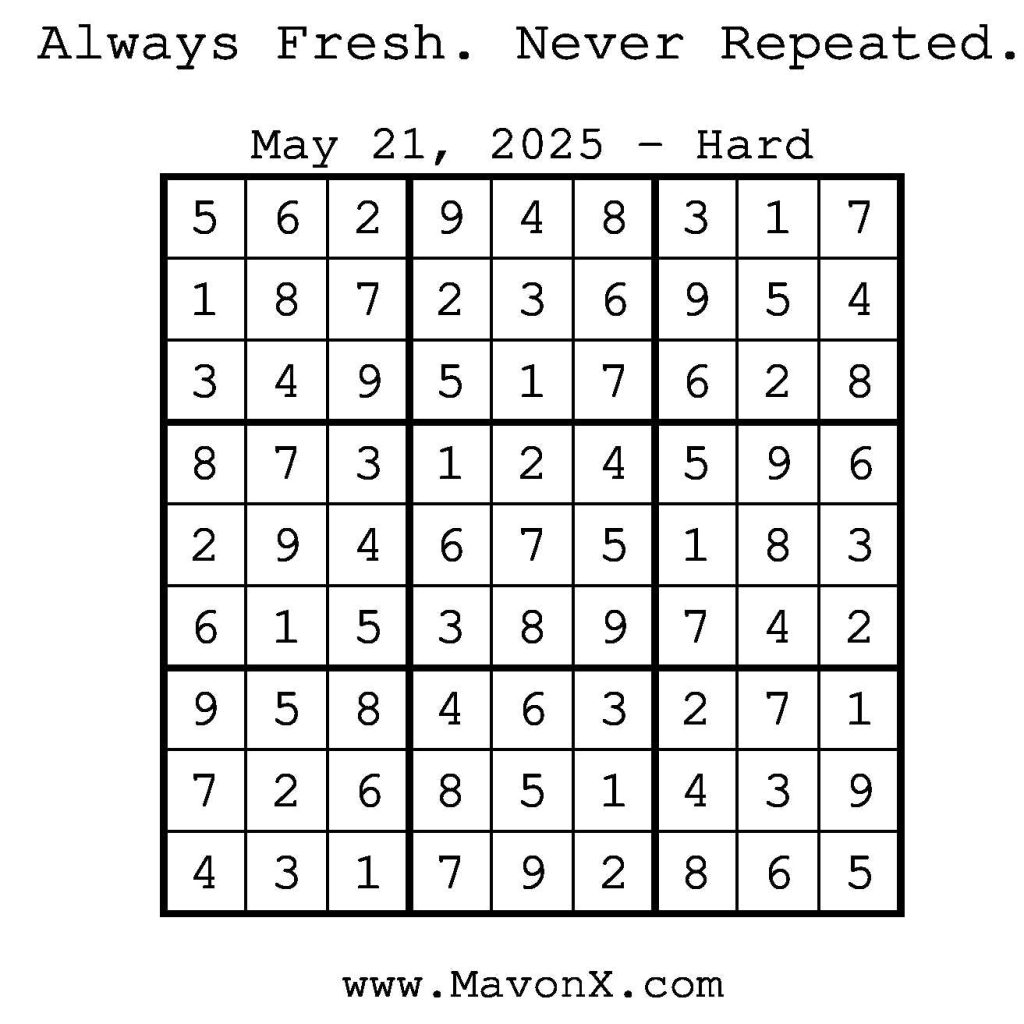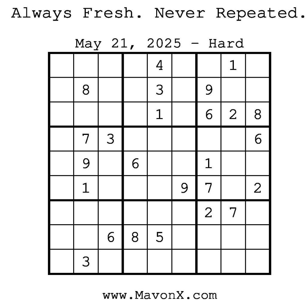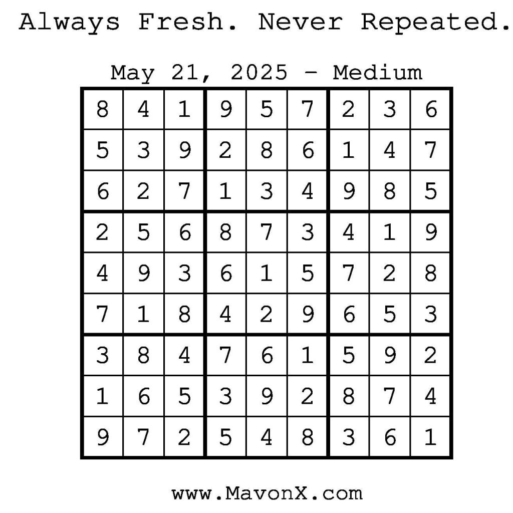 Puzzles of the Day – May 21, 2025 Post author:admin Post published:May 20, 2025 Post category:Free Stuff / Puzzle of the Day / Puzzle of the Day Solutions / Solutions Post comments:0 Comments Check out our books on Amazon! Check out our books on Barnes and Noble! Check out our books on Etsy! Easy Sudoku Coach Link Medium Sudoku Coach Link Hard Sudoku Coach Link Show Solution You Might Also Like Puzzles of the Day – September 24, 2024 September 24, 2024 Puzzles of the Day – February 10, 2025 February 12, 2025 Puzzle of the Day – July 19, 2024 July 19, 2024 Leave a Reply Cancel replyCommentEnter your name or username to comment Enter your email address to comment Enter your website URL (optional) Save my name, email, and website in this browser for the next time I comment.