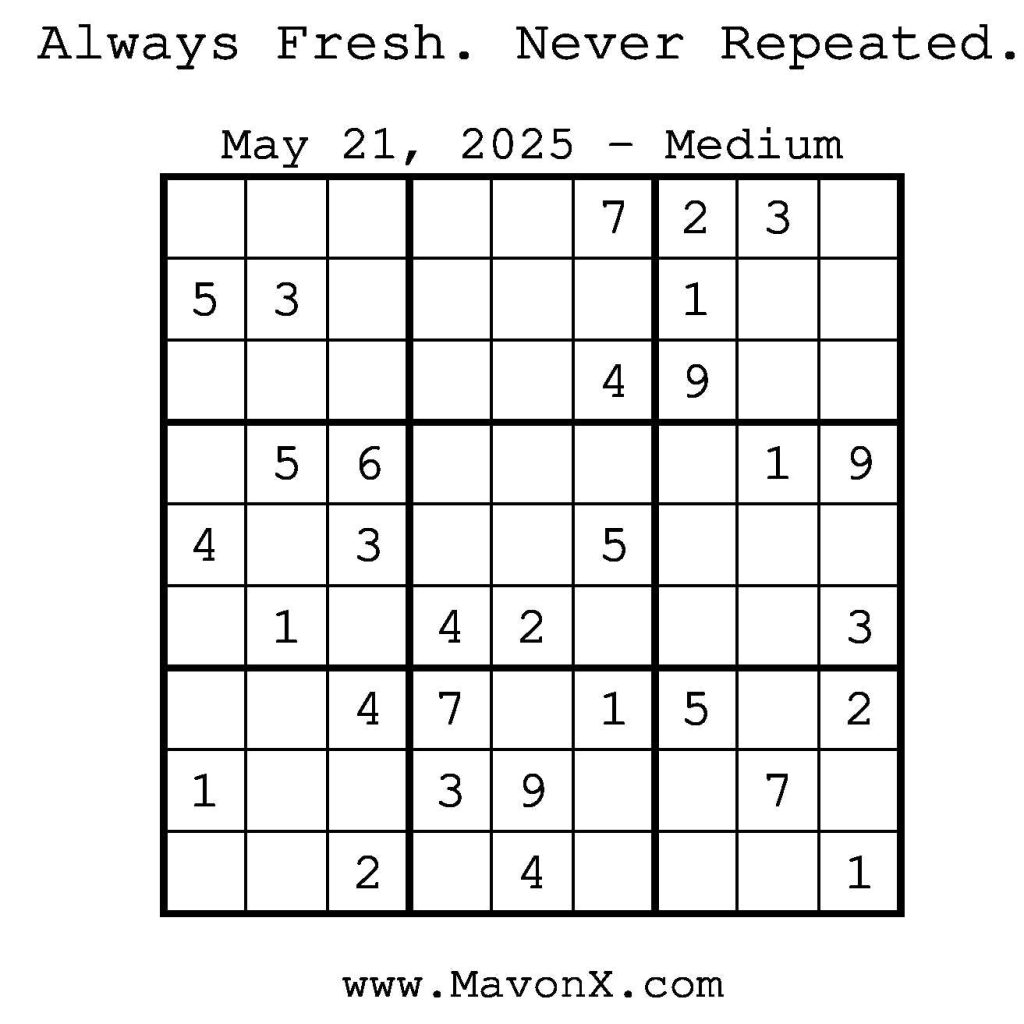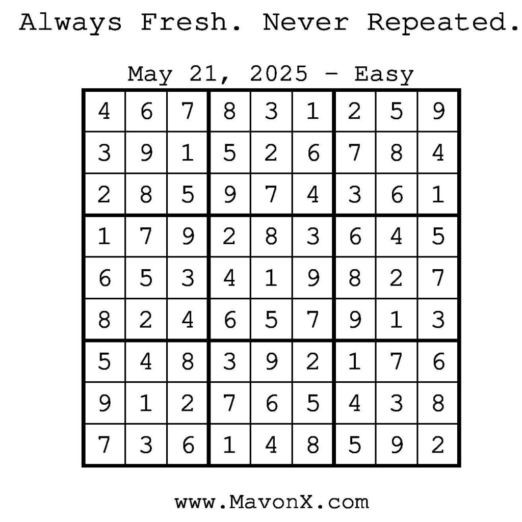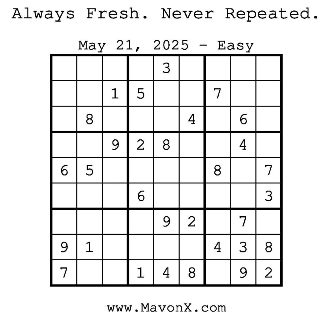 Puzzles of the Day – May 21, 2025 Post author:admin Post published:May 20, 2025 Post category:Free Stuff / Puzzle of the Day / Puzzle of the Day Solutions / Solutions Post comments:0 Comments Check out our books on Amazon! Check out our books on Barnes and Noble! Check out our books on Etsy! Easy Sudoku Coach Link Medium Sudoku Coach Link Hard Sudoku Coach Link Show Solution You Might Also Like Puzzles of the Day – September 24, 2024 September 24, 2024 Puzzles of the Day – February 10, 2025 February 12, 2025 Puzzle of the Day – July 19, 2024 July 19, 2024 Leave a Reply Cancel replyCommentEnter your name or username to comment Enter your email address to comment Enter your website URL (optional) Save my name, email, and website in this browser for the next time I comment.
