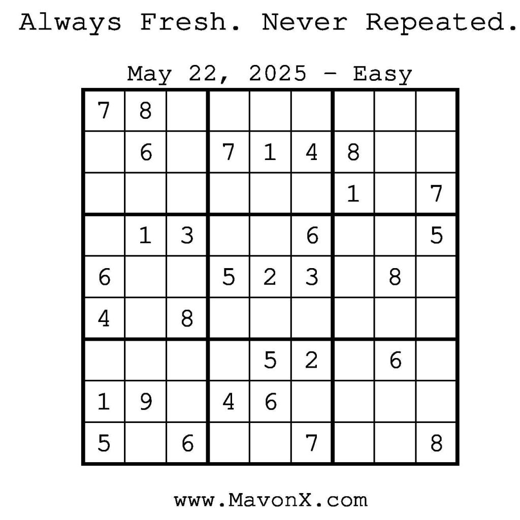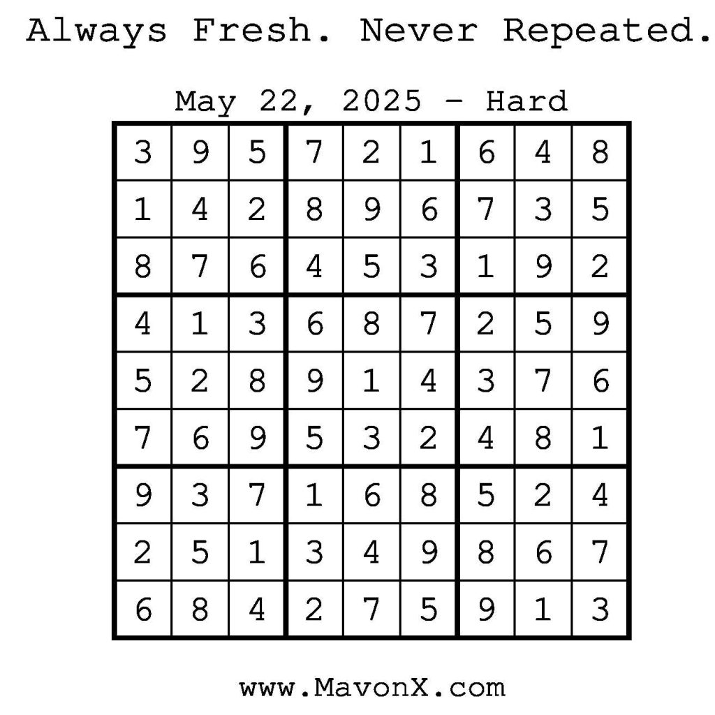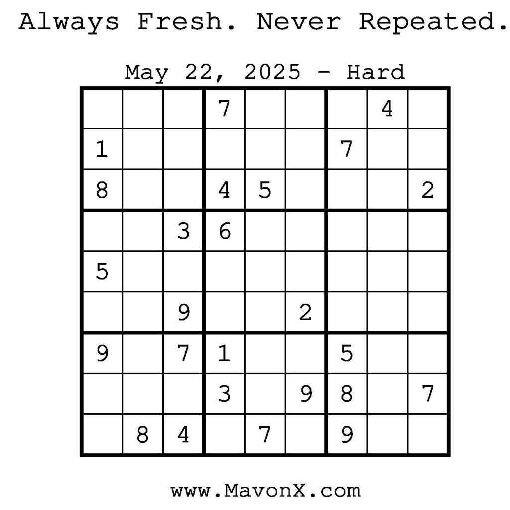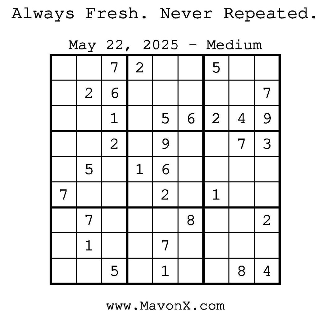 Puzzles of the Day – May 22, 2025 Post author:admin Post published:May 22, 2025 Post category:Free Stuff / Puzzle of the Day / Puzzle of the Day Solutions / Solutions Post comments:0 Comments Check out our books on Amazon! Check out our books on Barnes and Noble! Check out our books on Etsy! Easy Sudoku Coach Link Medium Sudoku Coach Link Hard Sudoku Coach Link Show Solution You Might Also Like Puzzles of the Day – November 21, 2024 November 21, 2024 Puzzles of the Day – April 4, 2026 April 3, 2026 Puzzles of the Day – October 23, 2024 October 23, 2024 Leave a Reply Cancel replyCommentEnter your name or username to comment Enter your email address to comment Enter your website URL (optional) Save my name, email, and website in this browser for the next time I comment.
