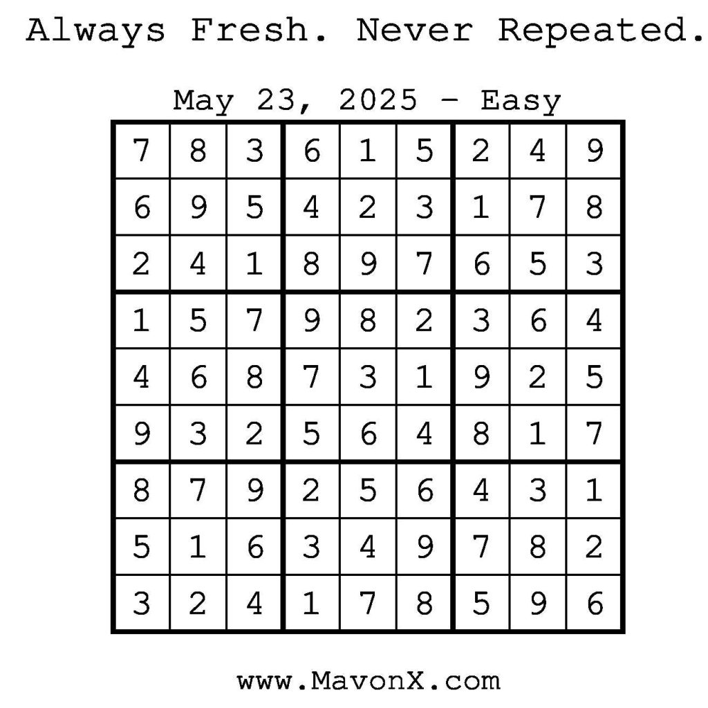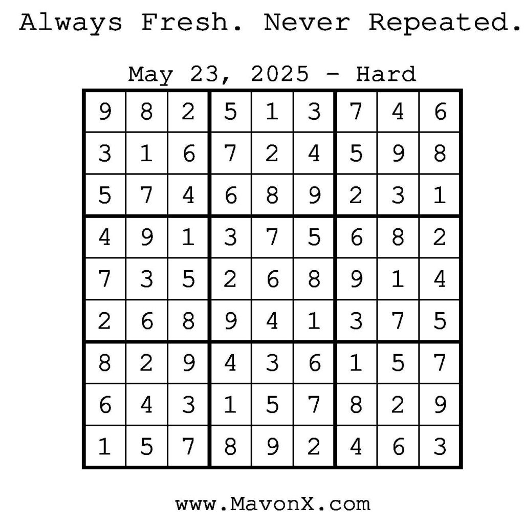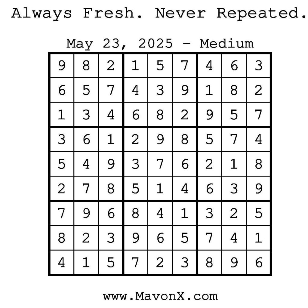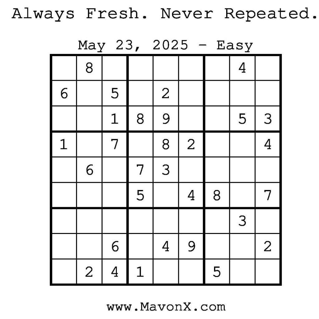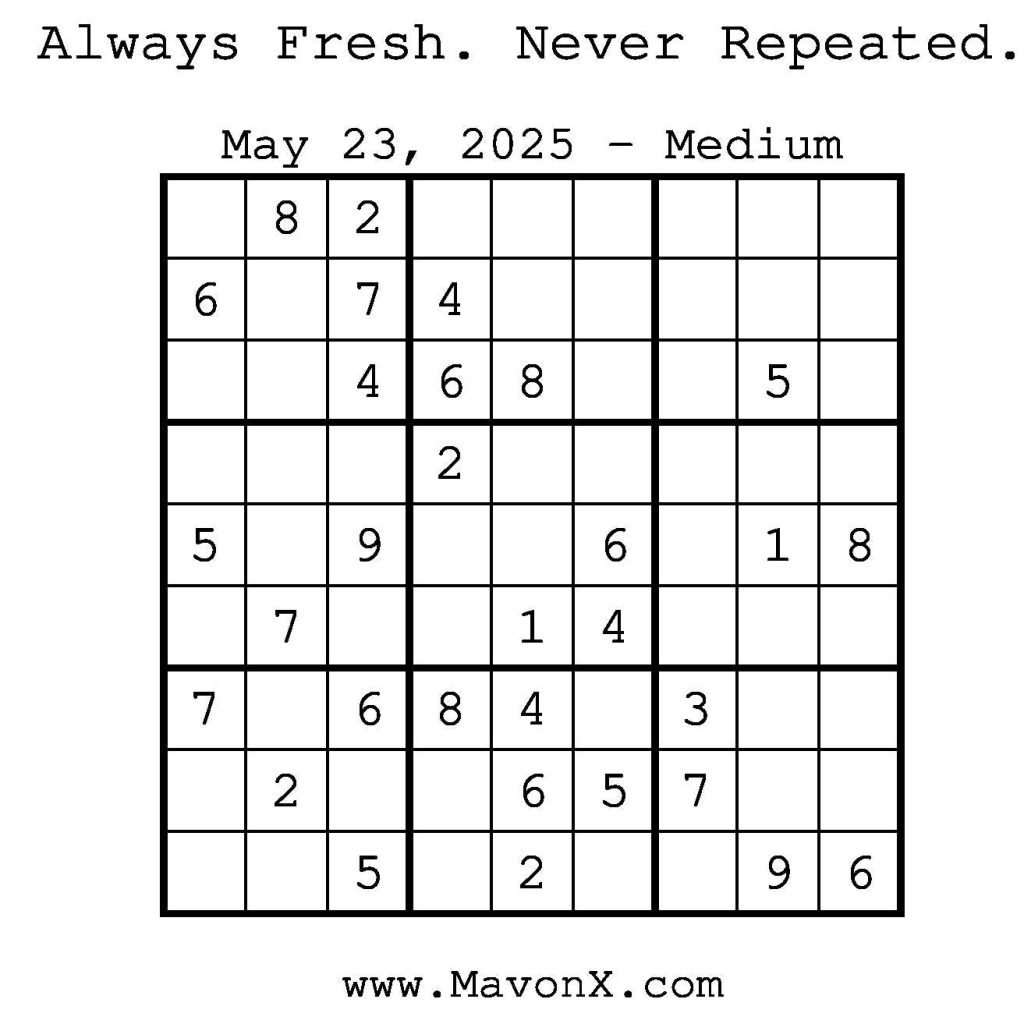 Puzzles of the Day – May 23, 2025 Post author:admin Post published:May 22, 2025 Post category:Free Stuff / Puzzle of the Day / Puzzle of the Day Solutions / Solutions Post comments:0 Comments Check out our books on Amazon! Check out our books on Barnes and Noble! Check out our books on Etsy! Easy Sudoku Coach Link Medium Sudoku Coach Link Hard Sudoku Coach Link Show Solution You Might Also Like Puzzles of the Day – February 5, 2025 February 4, 2025 Puzzles of the Day – May 17, 2025 May 16, 2025 Puzzles of the Day – April 1, 2026 March 31, 2026 Leave a Reply Cancel replyCommentEnter your name or username to comment Enter your email address to comment Enter your website URL (optional) Save my name, email, and website in this browser for the next time I comment.