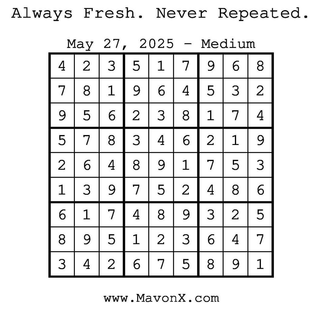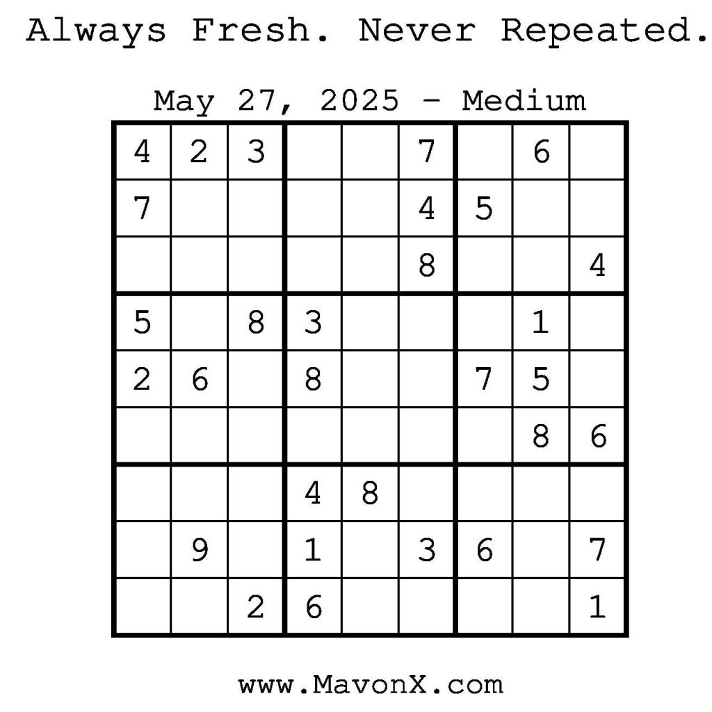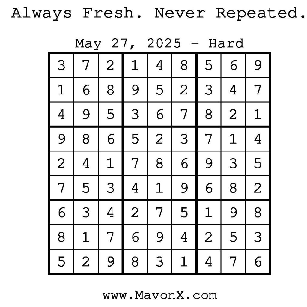 Puzzles of the Day – May 27, 2025 Post author:admin Post published:May 26, 2025 Post category:Free Stuff / Puzzle of the Day / Puzzle of the Day Solutions / Solutions Post comments:0 Comments Check out our books on Amazon! Check out our books on Barnes and Noble! Check out our books on Etsy! Easy Sudoku Coach Link Medium Sudoku Coach Link Hard Sudoku Coach Link Show Solution You Might Also Like Puzzles of the Day – March 23, 2026 March 22, 2026 Puzzles of the Day – December 04, 2025 December 3, 2025 Puzzles of the Day – June 27, 2025 June 27, 2025 Leave a Reply Cancel replyCommentEnter your name or username to comment Enter your email address to comment Enter your website URL (optional) Save my name, email, and website in this browser for the next time I comment.