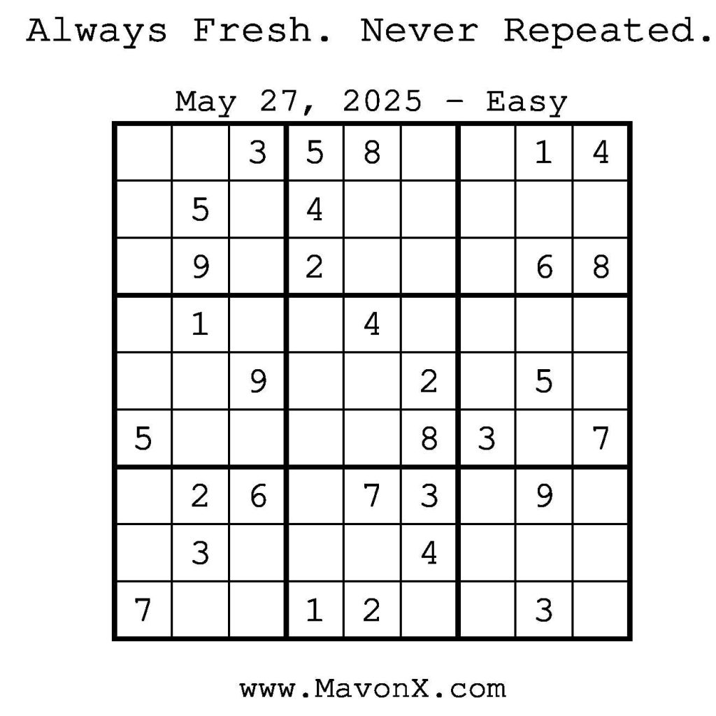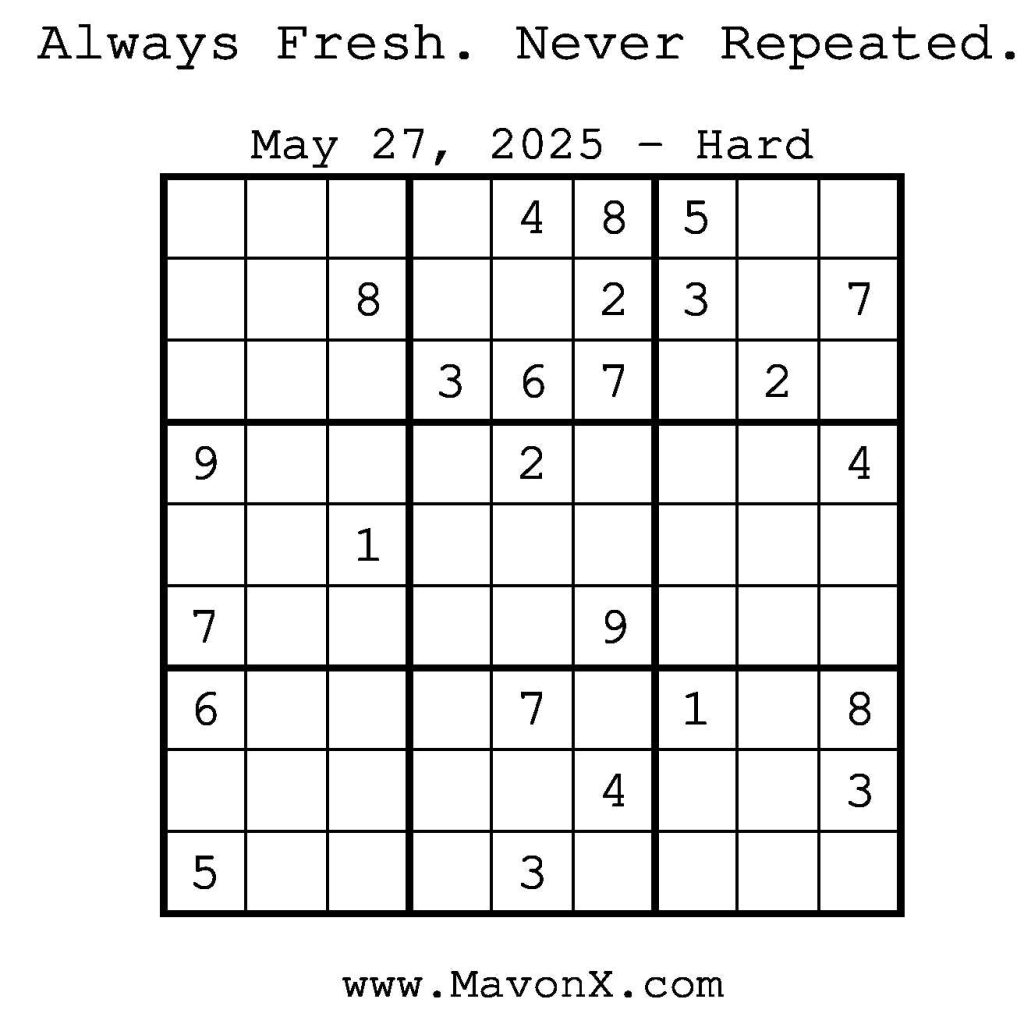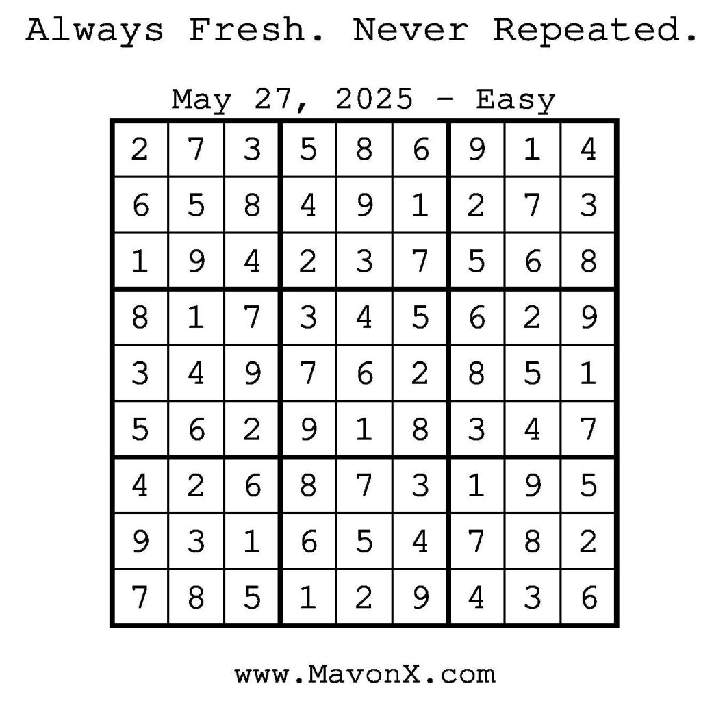 Puzzles of the Day – May 27, 2025 Post author:admin Post published:May 26, 2025 Post category:Free Stuff / Puzzle of the Day / Puzzle of the Day Solutions / Solutions Post comments:0 Comments Check out our books on Amazon! Check out our books on Barnes and Noble! Check out our books on Etsy! Easy Sudoku Coach Link Medium Sudoku Coach Link Hard Sudoku Coach Link Show Solution You Might Also Like Puzzles of the Day – March 23, 2026 March 22, 2026 Puzzles of the Day – December 04, 2025 December 3, 2025 Puzzles of the Day – June 27, 2025 June 27, 2025 Leave a Reply Cancel replyCommentEnter your name or username to comment Enter your email address to comment Enter your website URL (optional) Save my name, email, and website in this browser for the next time I comment.