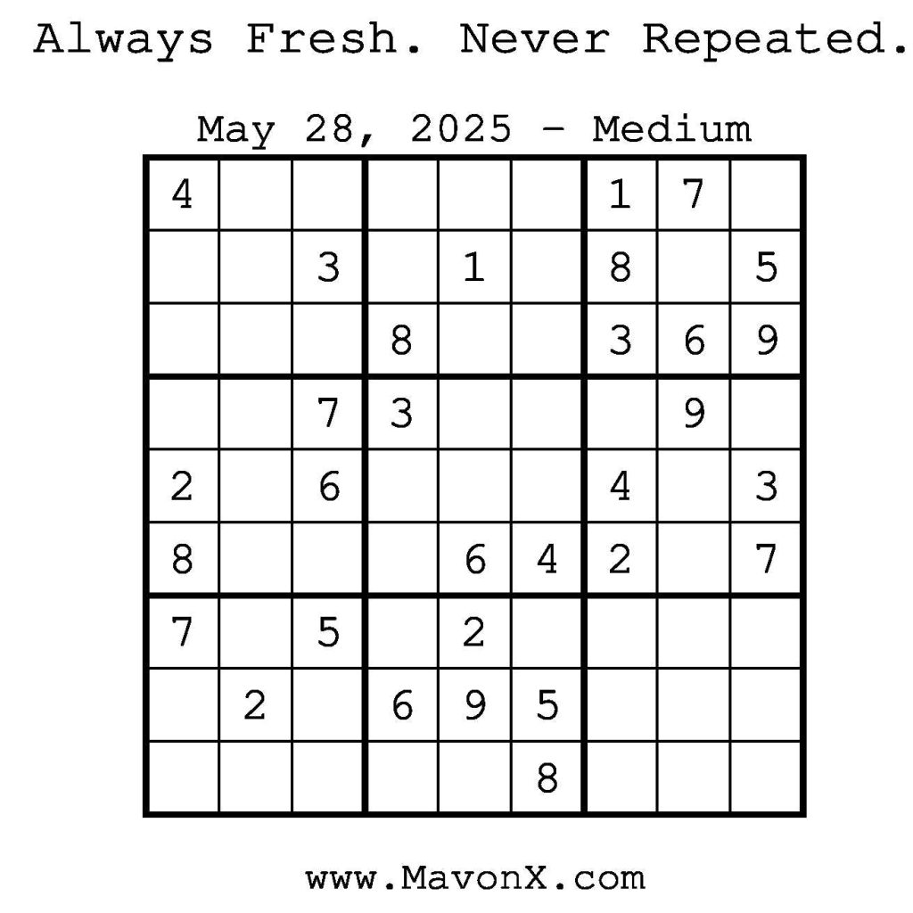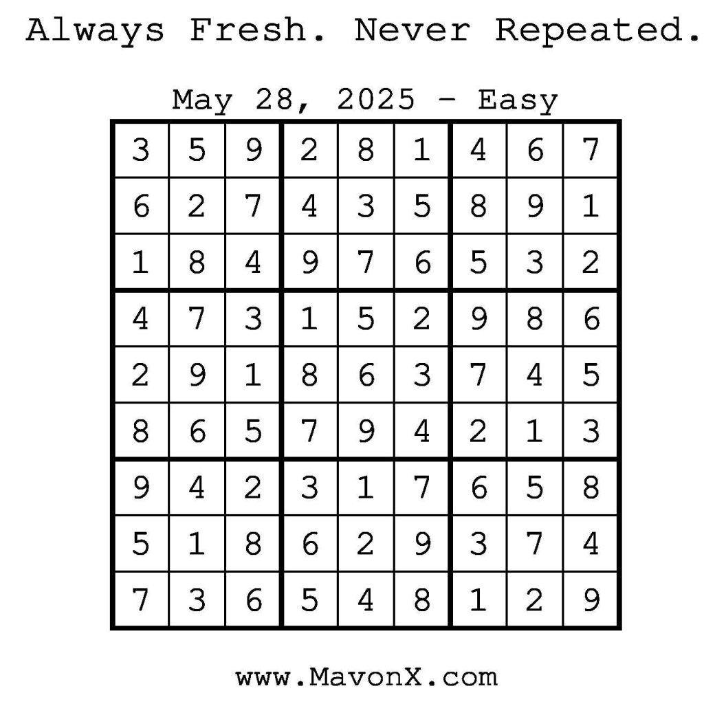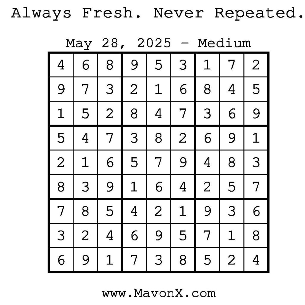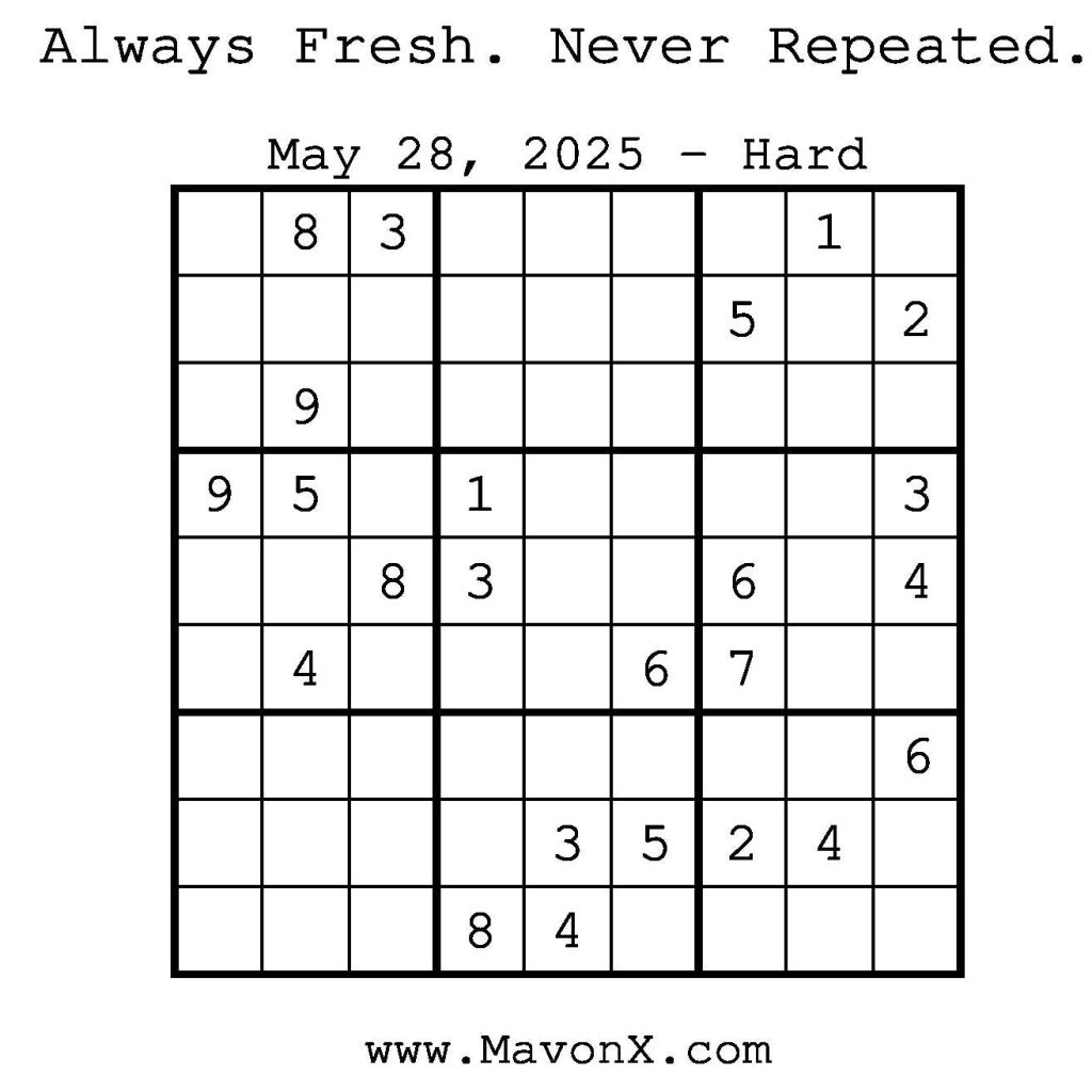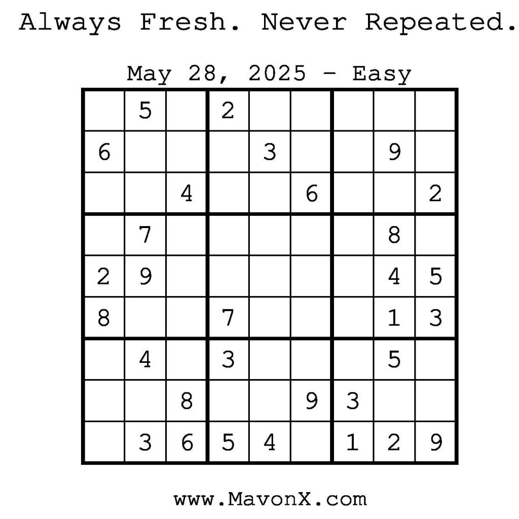 Puzzles of the Day – May 28, 2025 Post author:admin Post published:May 27, 2025 Post category:Free Stuff / Puzzle of the Day / Puzzle of the Day Solutions / Solutions Post comments:0 Comments Check out our books on Amazon! Check out our books on Barnes and Noble! Check out our books on Etsy! Easy Sudoku Coach Link Medium Sudoku Coach Link Hard Sudoku Coach Link Show Solution You Might Also Like Puzzles of the Day – March 28, 2026 March 28, 2026 Puzzle of the Day – July 11, 2024 July 11, 2024 Puzzles of the Day – March 14, 2026 March 14, 2026 Leave a Reply Cancel replyCommentEnter your name or username to comment Enter your email address to comment Enter your website URL (optional) Save my name, email, and website in this browser for the next time I comment.