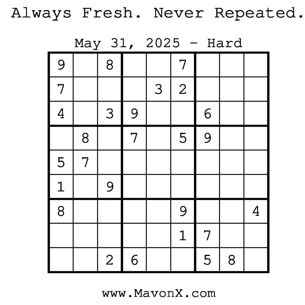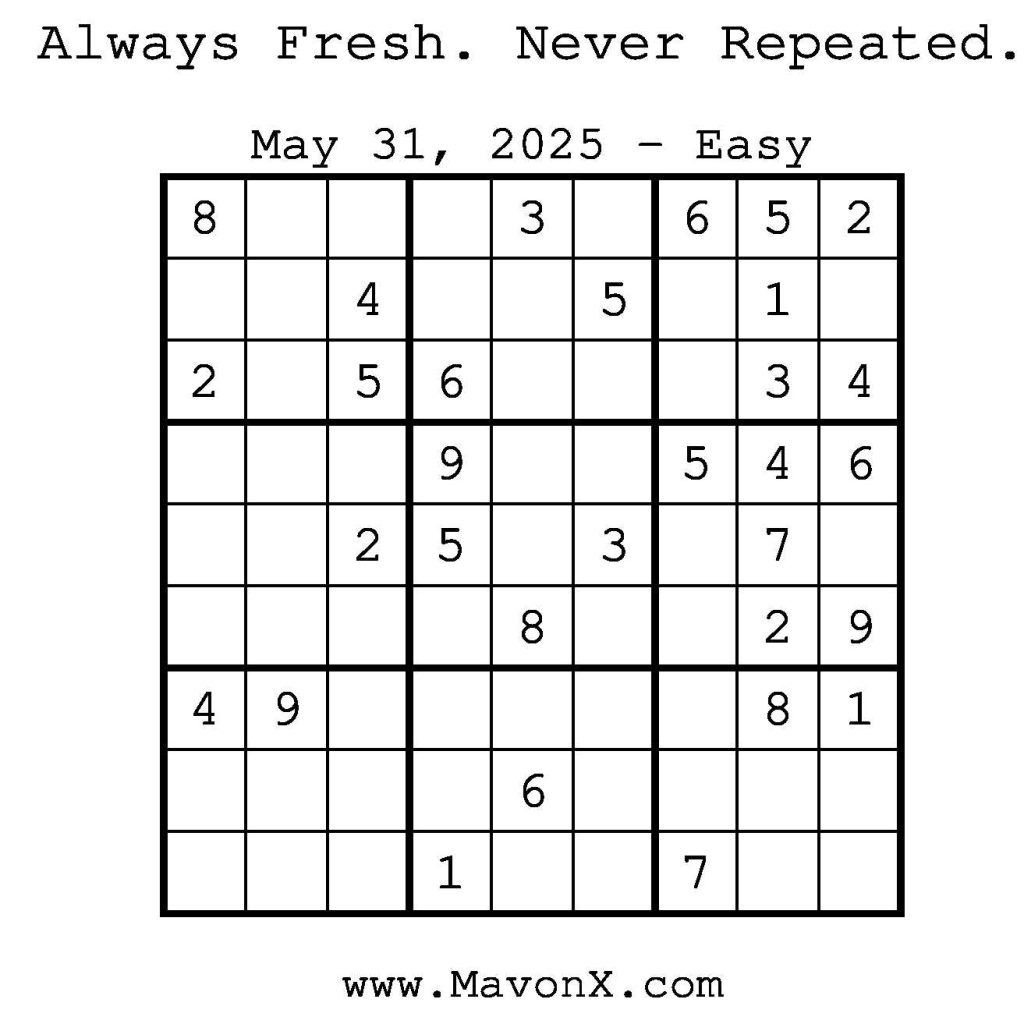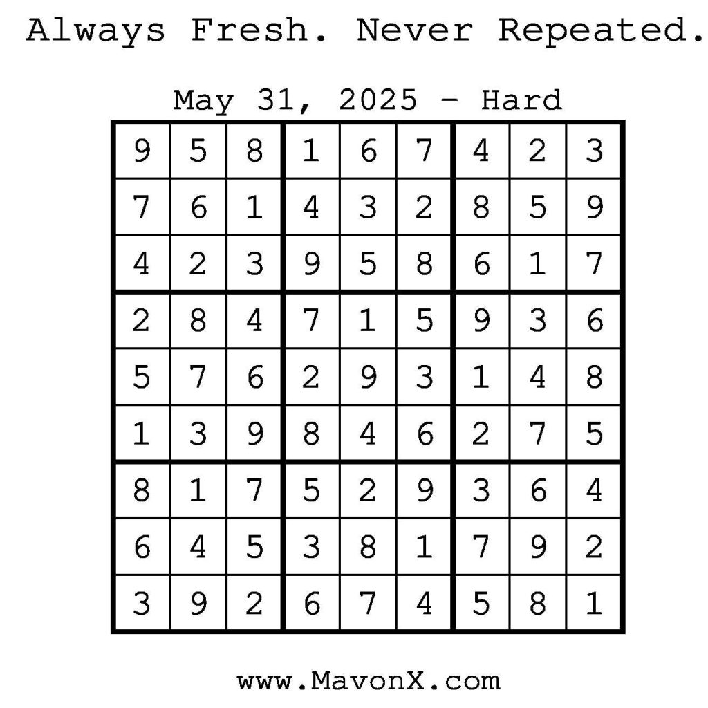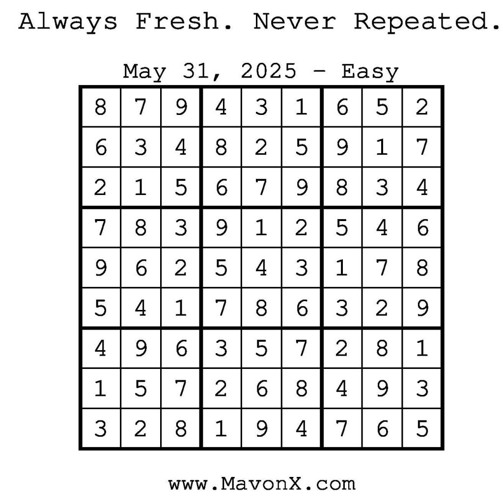 Puzzles of the Day – May 31, 2025 Post author:admin Post published:May 30, 2025 Post category:Free Stuff / Puzzle of the Day / Puzzle of the Day Solutions / Solutions Post comments:0 Comments Check out our books on Amazon! Check out our books on Barnes and Noble! Check out our books on Etsy! Easy Sudoku Coach Link Medium Sudoku Coach Link Hard Sudoku Coach Link Show Solution You Might Also Like Puzzles of the Day – October 30, 2025 October 29, 2025 Puzzles of the Day – September 12, 2025 September 11, 2025 Puzzles of the Day – January 20, 2025 January 21, 2025 Leave a Reply Cancel replyCommentEnter your name or username to comment Enter your email address to comment Enter your website URL (optional) Save my name, email, and website in this browser for the next time I comment.