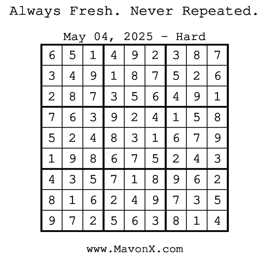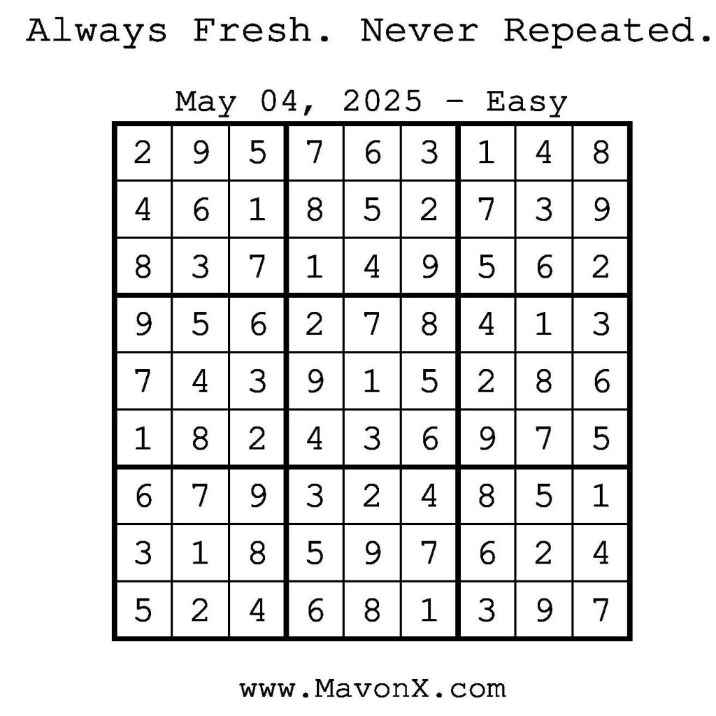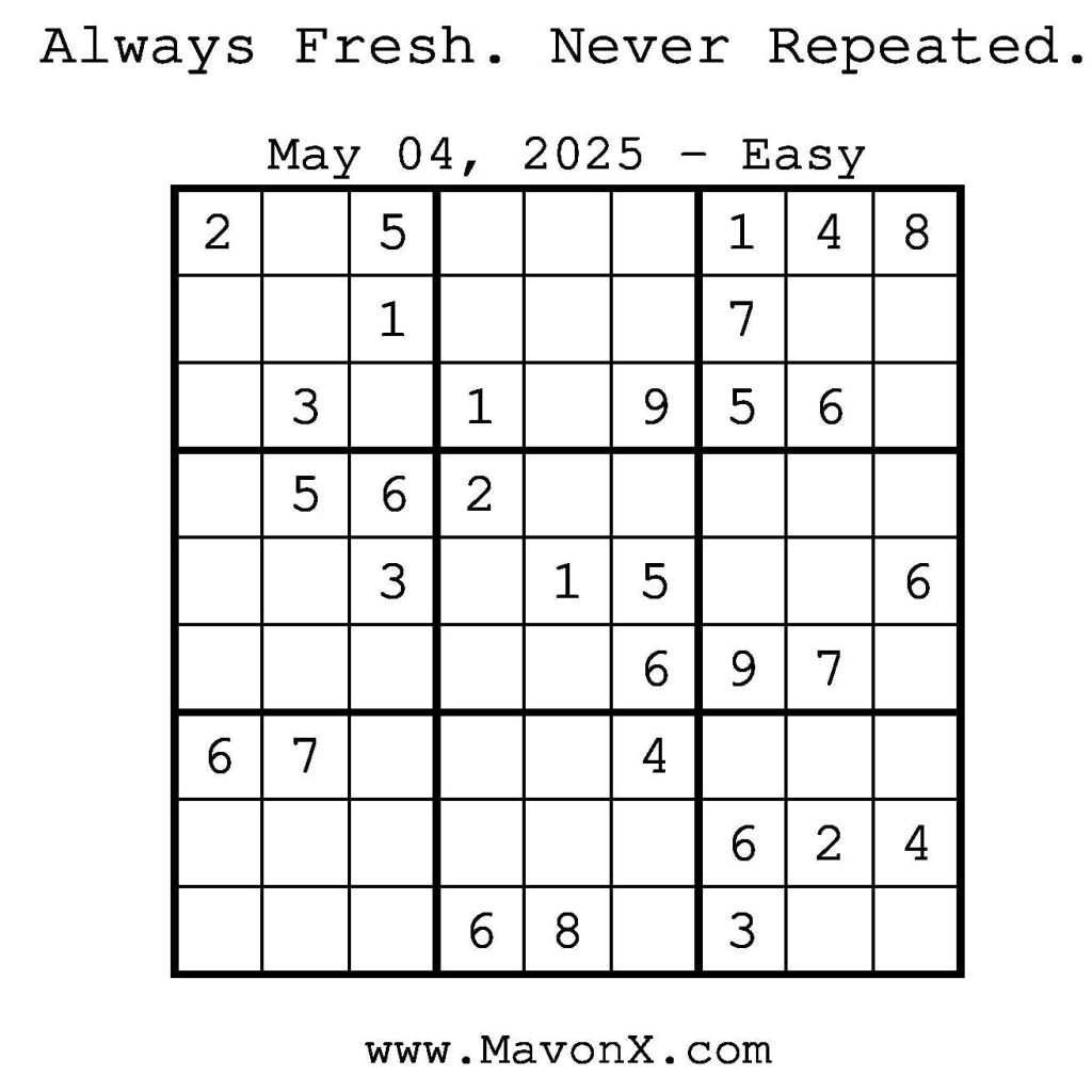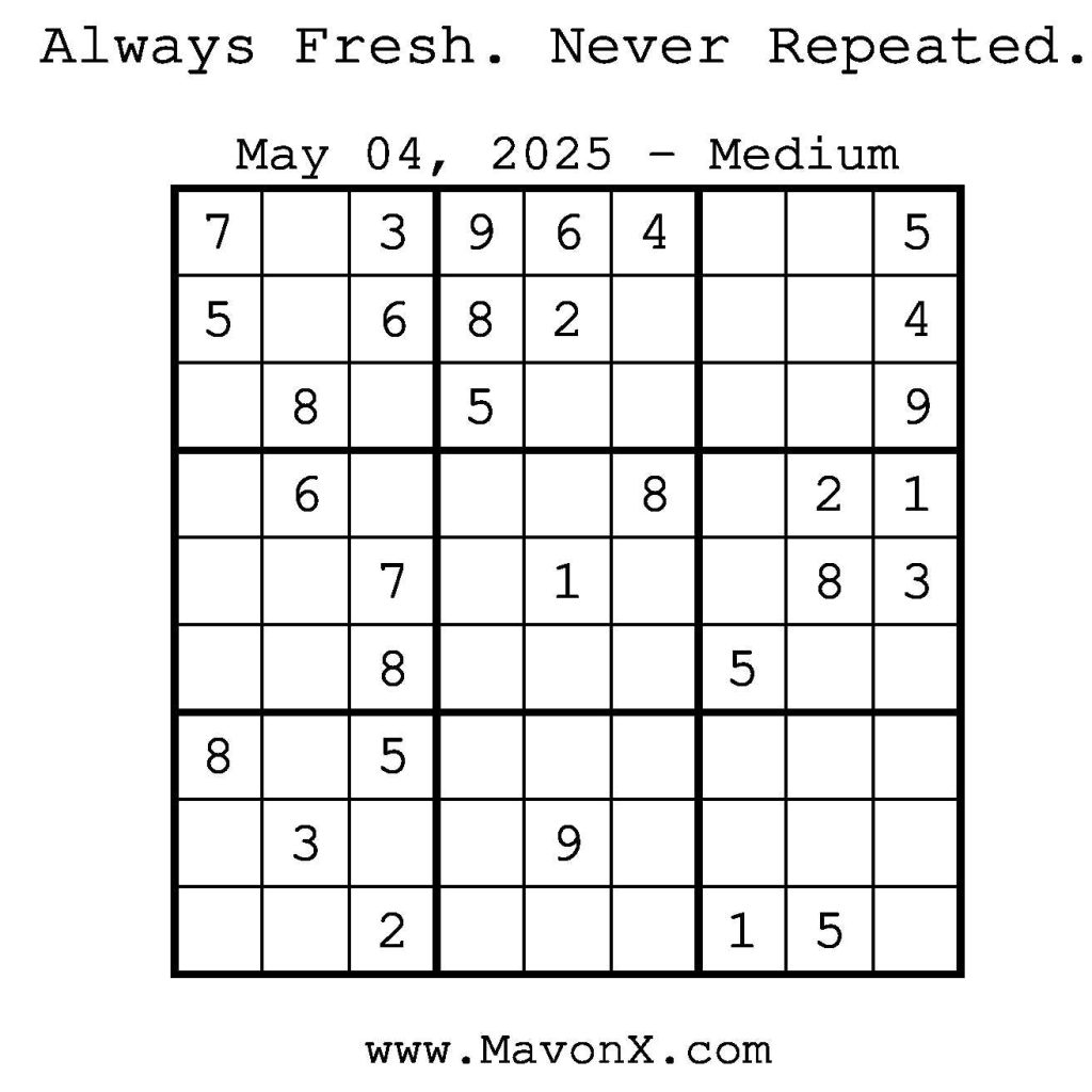 Puzzles of the Day – May 4, 2025 Post author:admin Post published:May 4, 2025 Post category:Free Stuff / Puzzle of the Day / Puzzle of the Day Solutions / Solutions Post comments:0 Comments Check out our books on Amazon! Check out our books on Barnes and Noble! Check out our books on Etsy! Easy Sudoku Coach Link Medium Sudoku Coach Link Hard Sudoku Coach Link Show Solution You Might Also Like Puzzles of the Day – January 6, 2026 January 5, 2026 Puzzles of the Day – March 13, 2025 March 14, 2025 Puzzles of the Day – March 1, 2026 February 28, 2026 Leave a Reply Cancel replyCommentEnter your name or username to comment Enter your email address to comment Enter your website URL (optional) Save my name, email, and website in this browser for the next time I comment.
