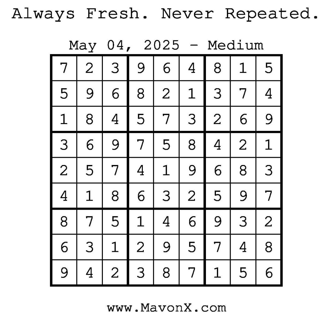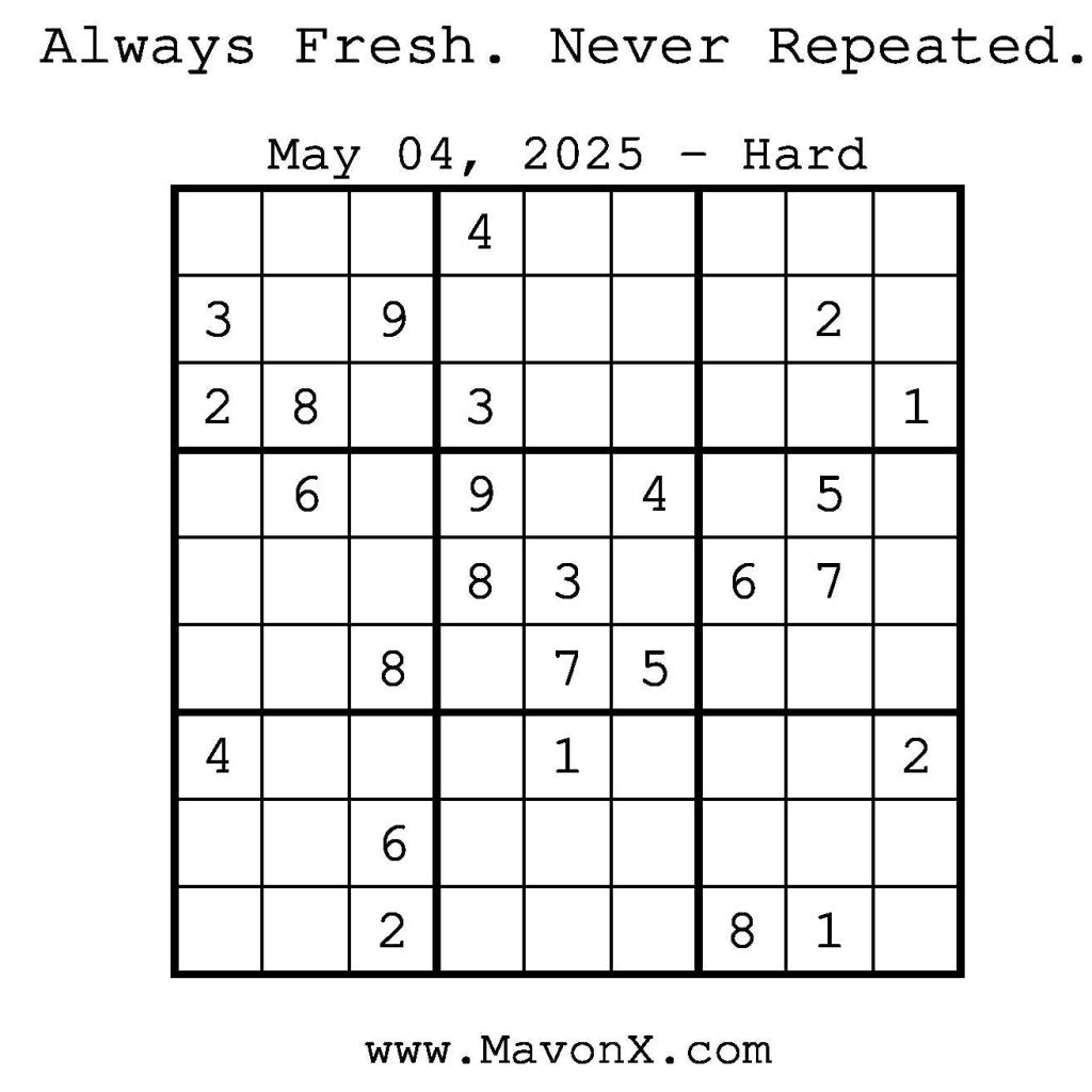 Puzzles of the Day – May 4, 2025 Post author:admin Post published:May 4, 2025 Post category:Free Stuff / Puzzle of the Day / Puzzle of the Day Solutions / Solutions Post comments:0 Comments Check out our books on Amazon! Check out our books on Barnes and Noble! Check out our books on Etsy! Easy Sudoku Coach Link Medium Sudoku Coach Link Hard Sudoku Coach Link Show Solution You Might Also Like Puzzles of the Day – October 24, 2025 October 23, 2025 Puzzle of the Day – July 4, 2024 July 4, 2024 Puzzles of the Day – January 8, 2026 January 7, 2026 Leave a Reply Cancel replyCommentEnter your name or username to comment Enter your email address to comment Enter your website URL (optional) Save my name, email, and website in this browser for the next time I comment.