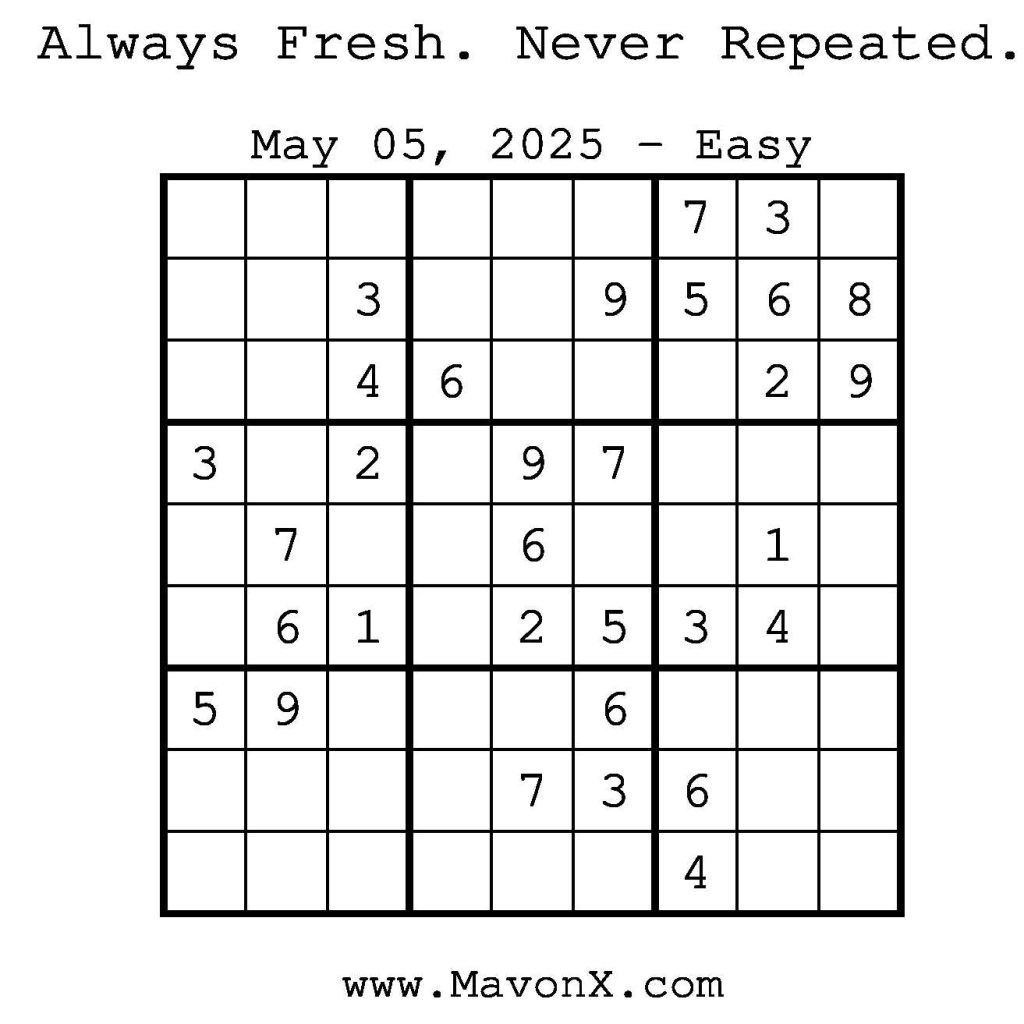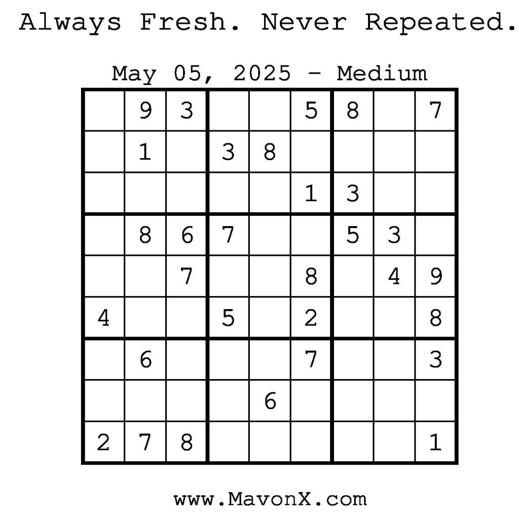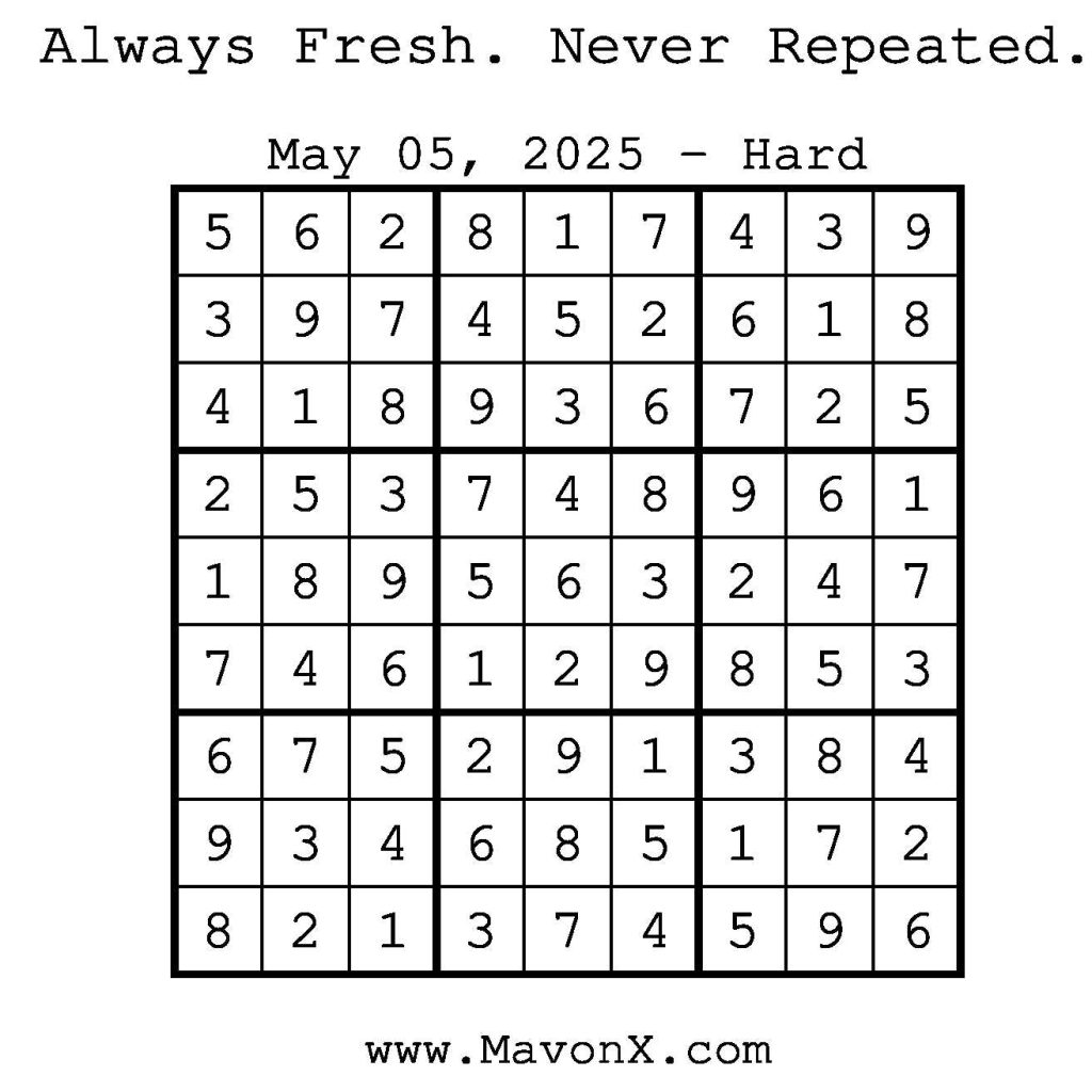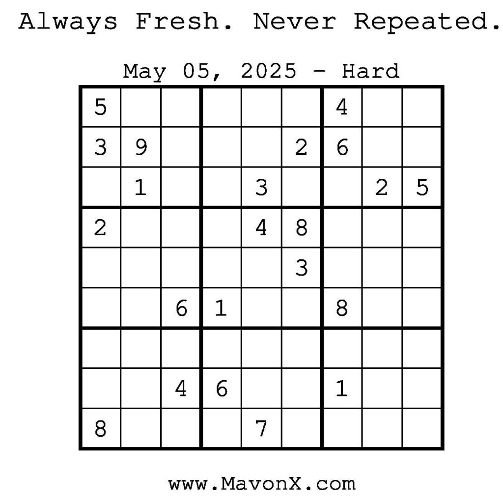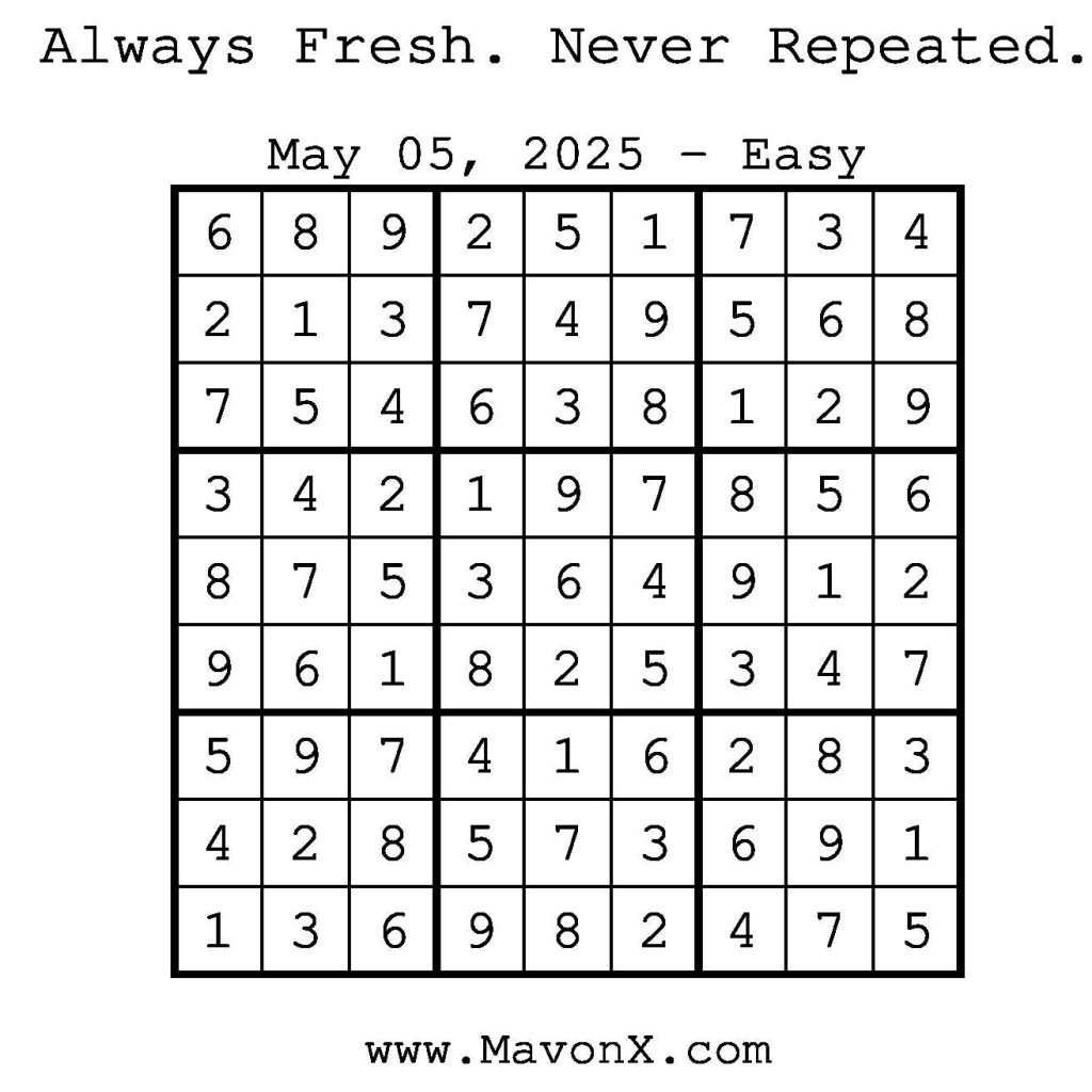 Puzzles of the Day – May 5, 2025 Post author:admin Post published:May 4, 2025 Post category:Free Stuff / Puzzle of the Day / Puzzle of the Day Solutions / Solutions Post comments:0 Comments Check out our books on Amazon! Check out our books on Barnes and Noble! Check out our books on Etsy! Easy Sudoku Coach Link Medium Sudoku Coach Link Hard Sudoku Coach Link Show Solution You Might Also Like Puzzles of the Day – October 15, 2024 October 15, 2024 Puzzles of the Day – September 24, 2024 September 24, 2024 Puzzles of the Day – April 13, 2026 April 12, 2026 Leave a Reply Cancel replyCommentEnter your name or username to comment Enter your email address to comment Enter your website URL (optional) Save my name, email, and website in this browser for the next time I comment.