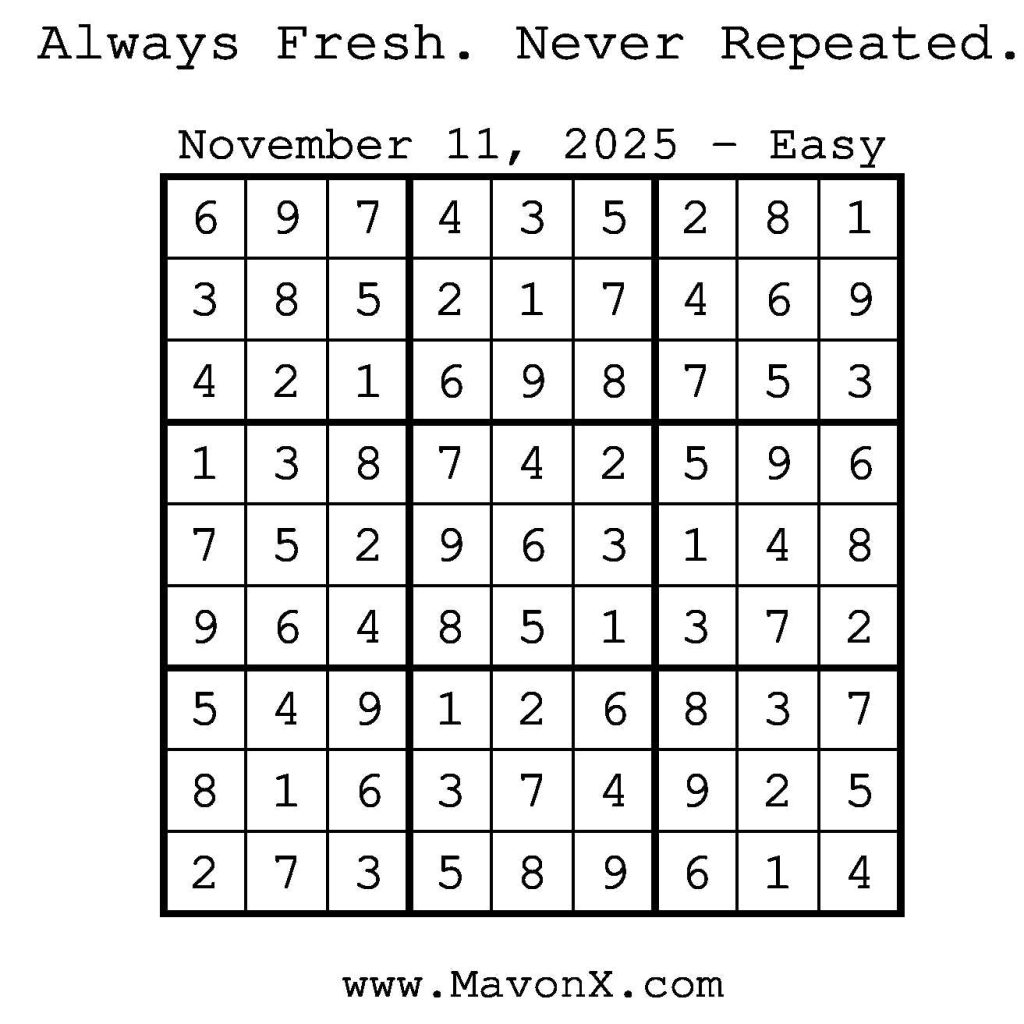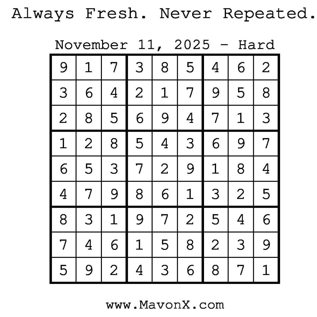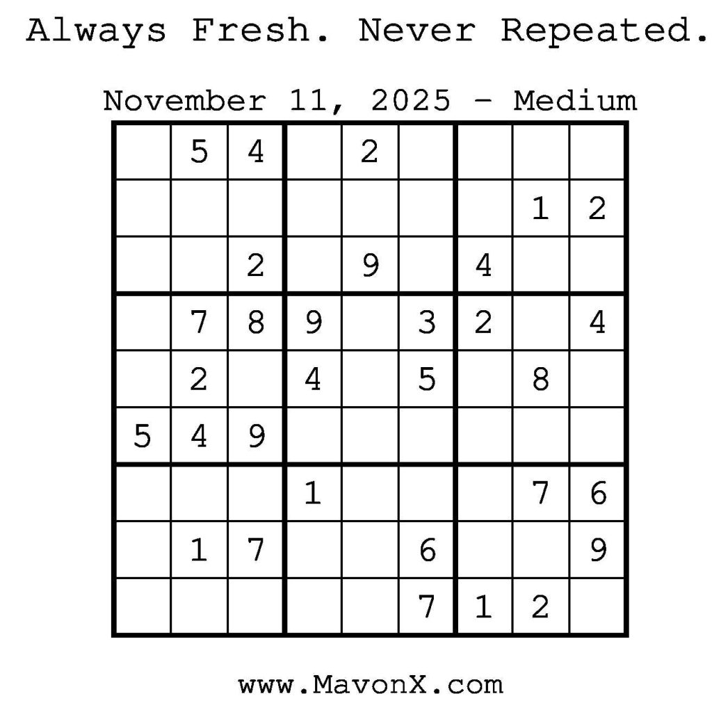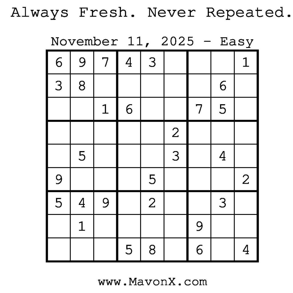 Puzzles of the Day – November 11, 2025 Post author:admin Post published:November 10, 2025 Post category:Free Stuff / Puzzle of the Day / Puzzle of the Day Solutions / Solutions Post comments:0 Comments Check out our books on Amazon! Check out our books on Barnes and Noble! Check out our books on Etsy! Easy Sudoku Coach Link Medium Sudoku Coach Link Hard Sudoku Coach Link Show Solution You Might Also Like Puzzles of the Day – September 27, 2024 September 27, 2024 Puzzles of the Day – February 11, 2025 February 12, 2025 Puzzles of the Day – February 19, 2025 February 18, 2025 Leave a Reply Cancel replyCommentEnter your name or username to comment Enter your email address to comment Enter your website URL (optional) Save my name, email, and website in this browser for the next time I comment.