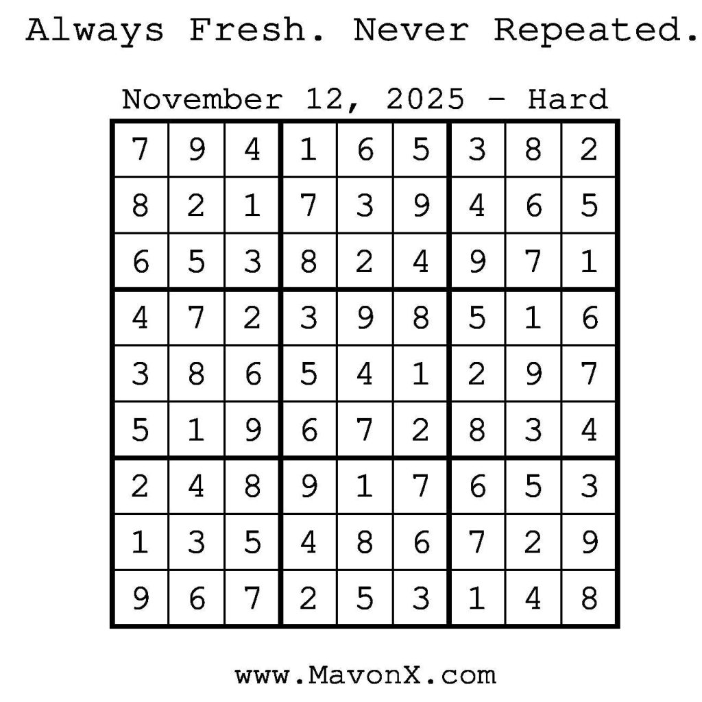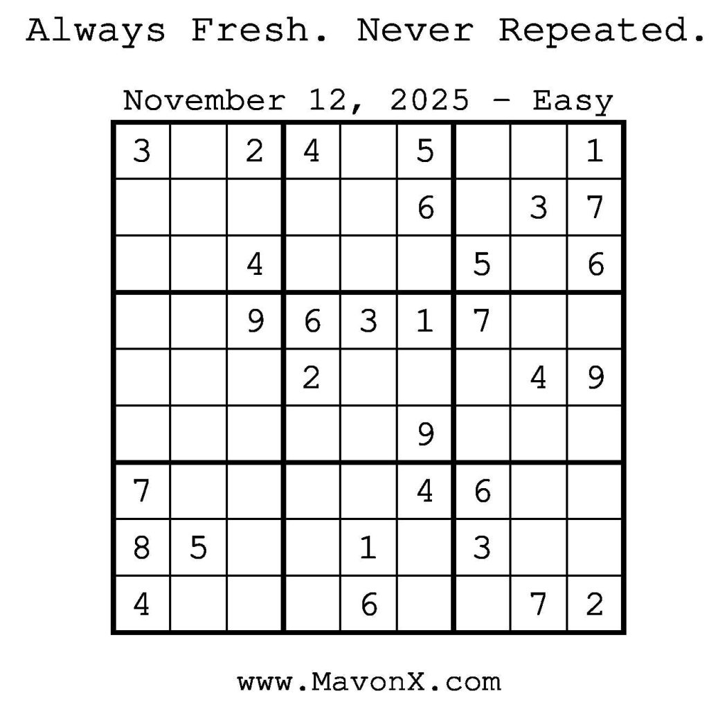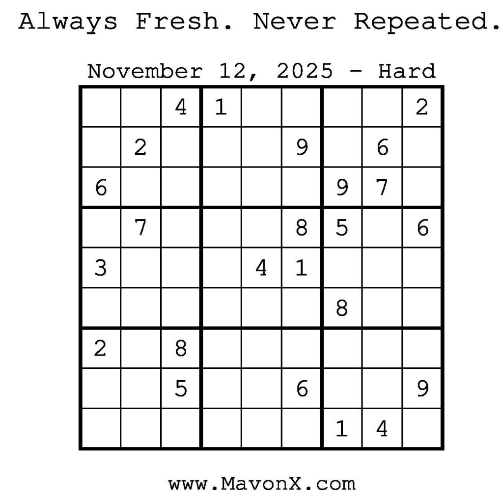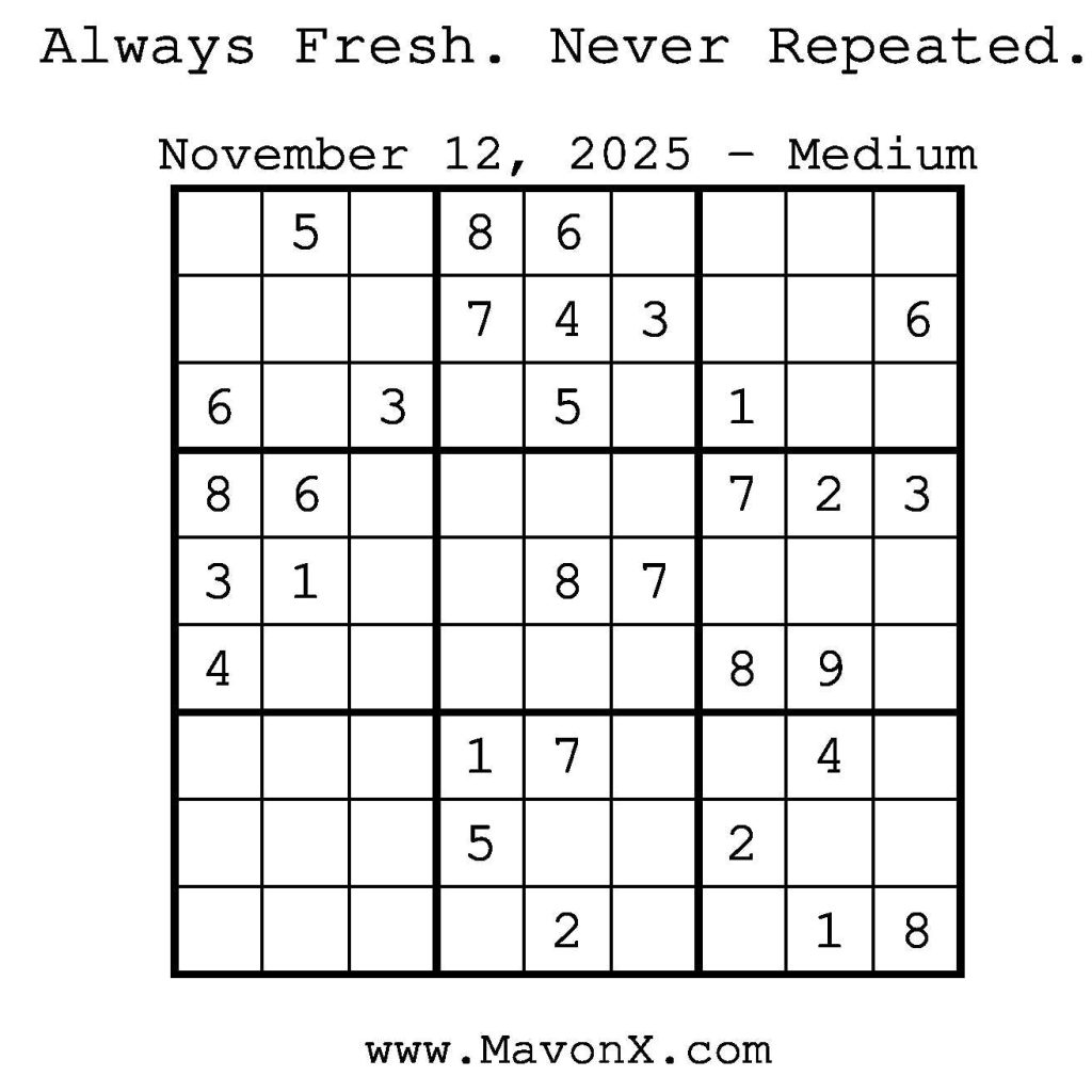 Puzzles of the Day – November 12, 2025 Post author:admin Post published:November 12, 2025 Post category:Free Stuff / Puzzle of the Day / Puzzle of the Day Solutions / Solutions Post comments:0 Comments Check out our books on Amazon! Check out our books on Barnes and Noble! Check out our books on Etsy! Easy Sudoku Coach Link Medium Sudoku Coach Link Hard Sudoku Coach Link Show Solution You Might Also Like Puzzles of the Day – February 19, 2026 February 18, 2026 Puzzles of the Day – September 27, 2025 September 26, 2025 Puzzles of the Day – March 17, 2025 March 17, 2025 Leave a Reply Cancel replyCommentEnter your name or username to comment Enter your email address to comment Enter your website URL (optional) Save my name, email, and website in this browser for the next time I comment.
