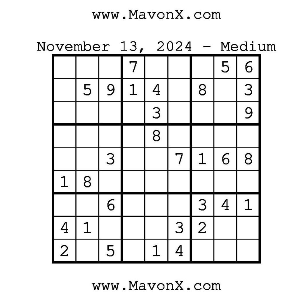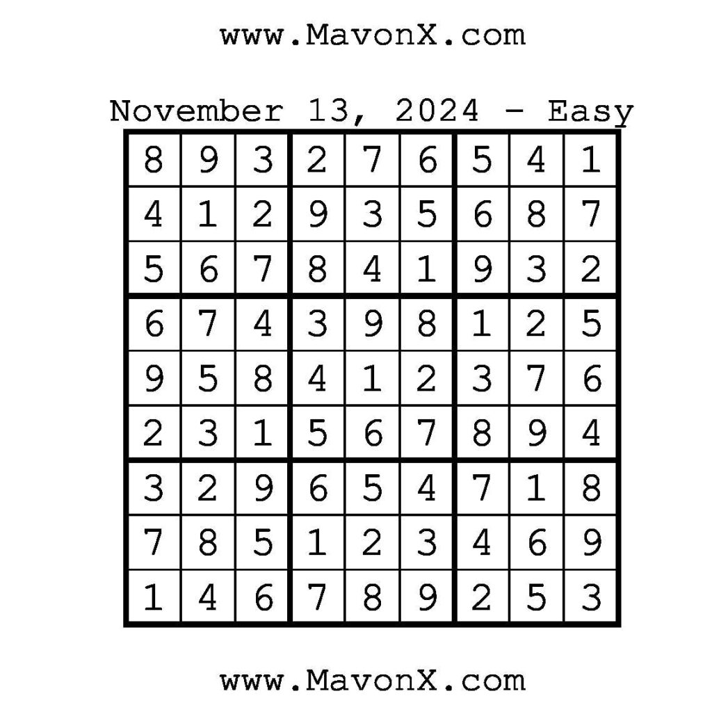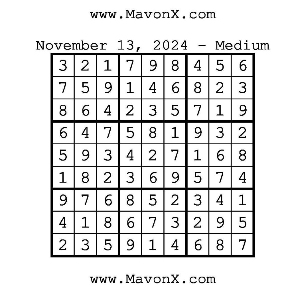 Puzzles of the Day – November 13, 2024 Post author:admin Post published:November 12, 2024 Post category:Free Stuff / Puzzle of the Day / Puzzle of the Day Solutions / Solutions Post comments:0 Comments Check out our books on Amazon!, Check out our books on Barnes and Noble!, Check out our books on Etsy! Easy Sudoku Coach Link Medium Sudoku Coach Link Hard Sudoku Coach Link Show Solution You Might Also Like Puzzles of the Day – December 31, 2024 January 1, 2025 Puzzles of the Day – December 24, 2025 December 23, 2025 Puzzles of the Day – April 8, 2026 April 8, 2026 Leave a Reply Cancel replyCommentEnter your name or username to comment Enter your email address to comment Enter your website URL (optional) Save my name, email, and website in this browser for the next time I comment.