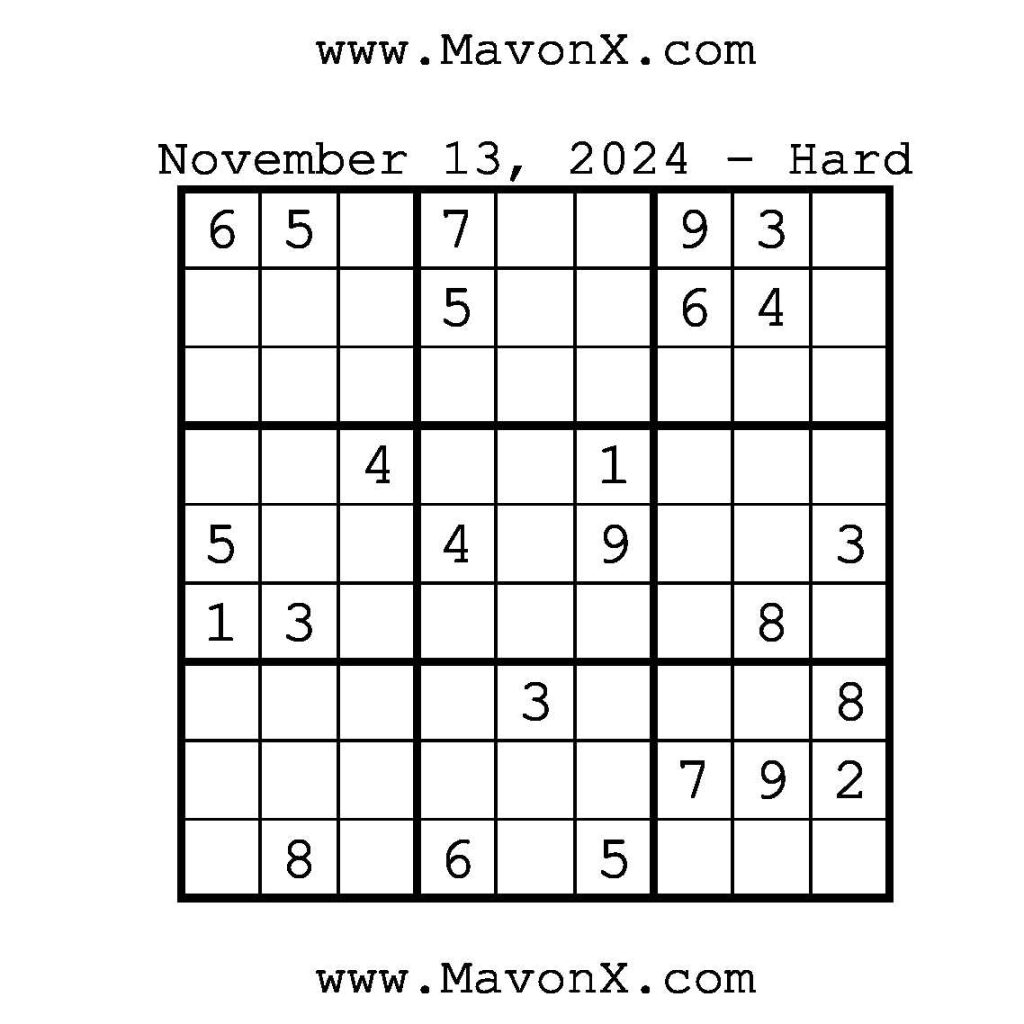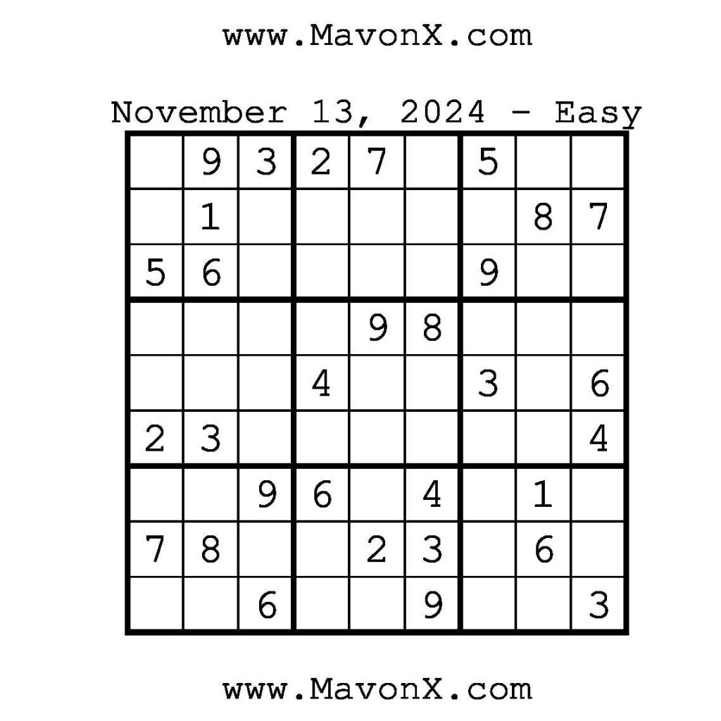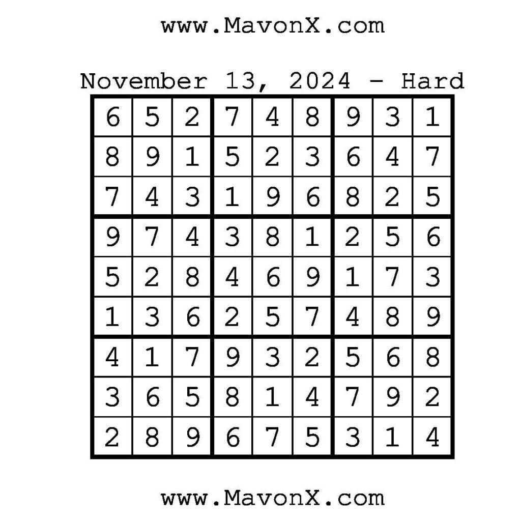 Puzzles of the Day – November 13, 2024 Post author:admin Post published:November 12, 2024 Post category:Free Stuff / Puzzle of the Day / Puzzle of the Day Solutions / Solutions Post comments:0 Comments Check out our books on Amazon!, Check out our books on Barnes and Noble!, Check out our books on Etsy! Easy Sudoku Coach Link Medium Sudoku Coach Link Hard Sudoku Coach Link Show Solution You Might Also Like Puzzles of the Day – December 31, 2024 January 1, 2025 Puzzles of the Day – December 24, 2025 December 23, 2025 Puzzles of the Day – April 8, 2026 April 8, 2026 Leave a Reply Cancel replyCommentEnter your name or username to comment Enter your email address to comment Enter your website URL (optional) Save my name, email, and website in this browser for the next time I comment.