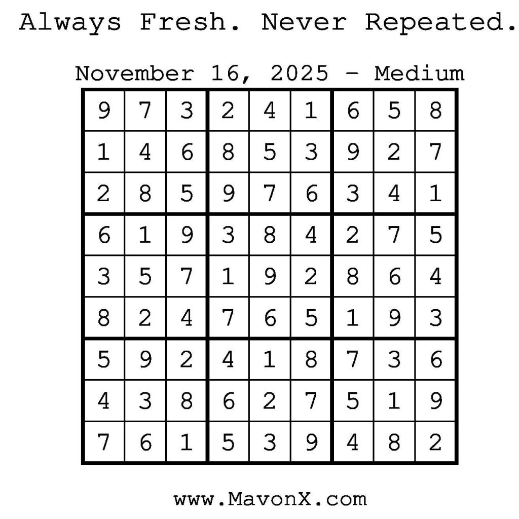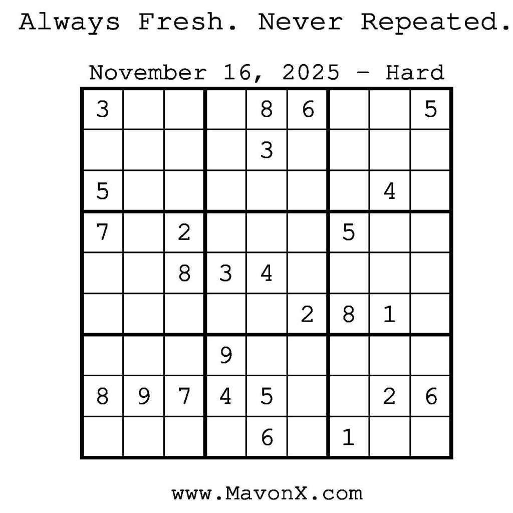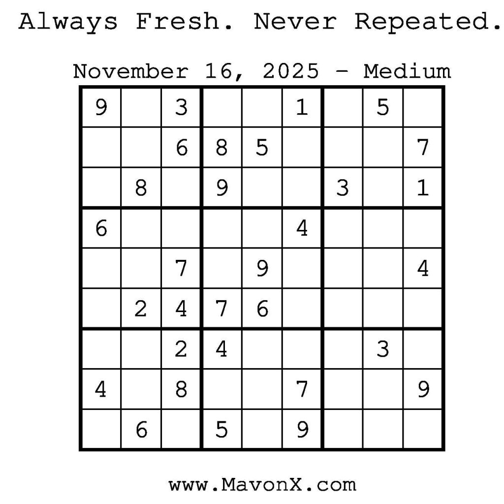 Puzzles of the Day – November 16, 2025 Post author:admin Post published:November 15, 2025 Post category:Free Stuff / Puzzle of the Day / Puzzle of the Day Solutions / Solutions Post comments:0 Comments Check out our books on Amazon! Check out our books on Barnes and Noble! Check out our books on Etsy! Easy Sudoku Coach Link Medium Sudoku Coach Link Hard Sudoku Coach Link Show Solution You Might Also Like Puzzles of the Day – September 30, 2025 September 30, 2025 Puzzle of the Day – July 15, 2024 July 15, 2024 Puzzles of the Day – December 01, 2025 November 30, 2025 Leave a Reply Cancel replyCommentEnter your name or username to comment Enter your email address to comment Enter your website URL (optional) Save my name, email, and website in this browser for the next time I comment.