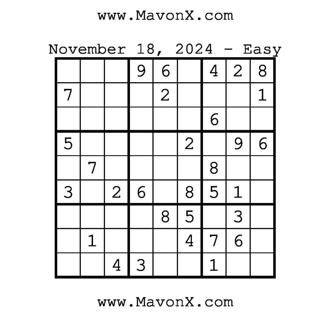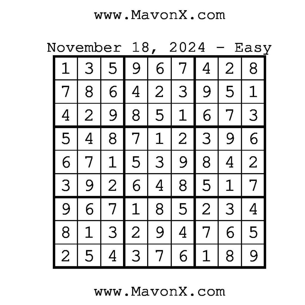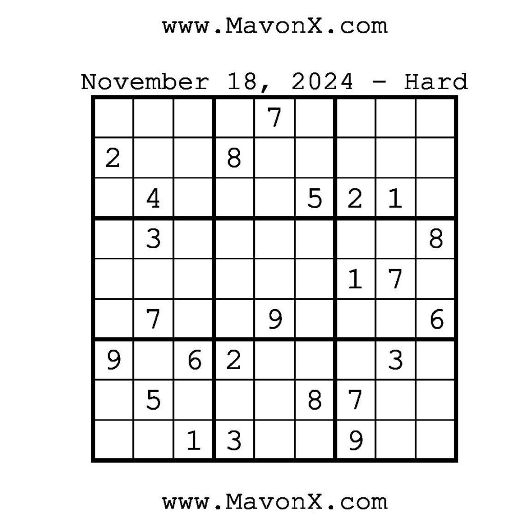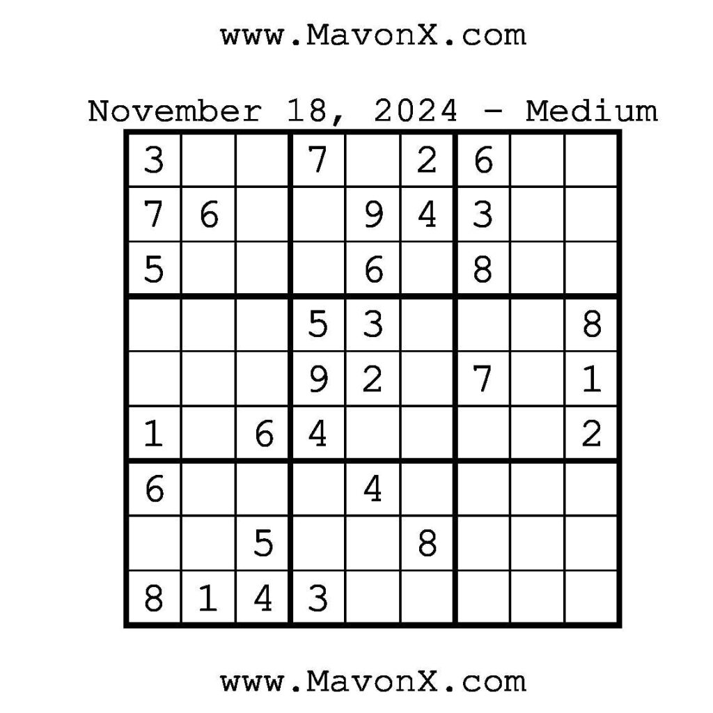 Puzzles of the Day – November 18, 2024 Post author:admin Post published:November 19, 2024 Post category:Free Stuff / Puzzle of the Day / Puzzle of the Day Solutions / Solutions Post comments:0 Comments Check out our books on Amazon!, Check out our books on Barnes and Noble!, Check out our books on Etsy! Easy Sudoku Coach Link Medium Sudoku Coach Link Hard Sudoku Coach Link Show Solution You Might Also Like Puzzles of the Day – April 15, 2026 April 14, 2026 Puzzles of the Day – October 6, 2025 October 6, 2025 Puzzles of the Day – July 27, 2025 July 27, 2025 Leave a Reply Cancel replyCommentEnter your name or username to comment Enter your email address to comment Enter your website URL (optional) Save my name, email, and website in this browser for the next time I comment.