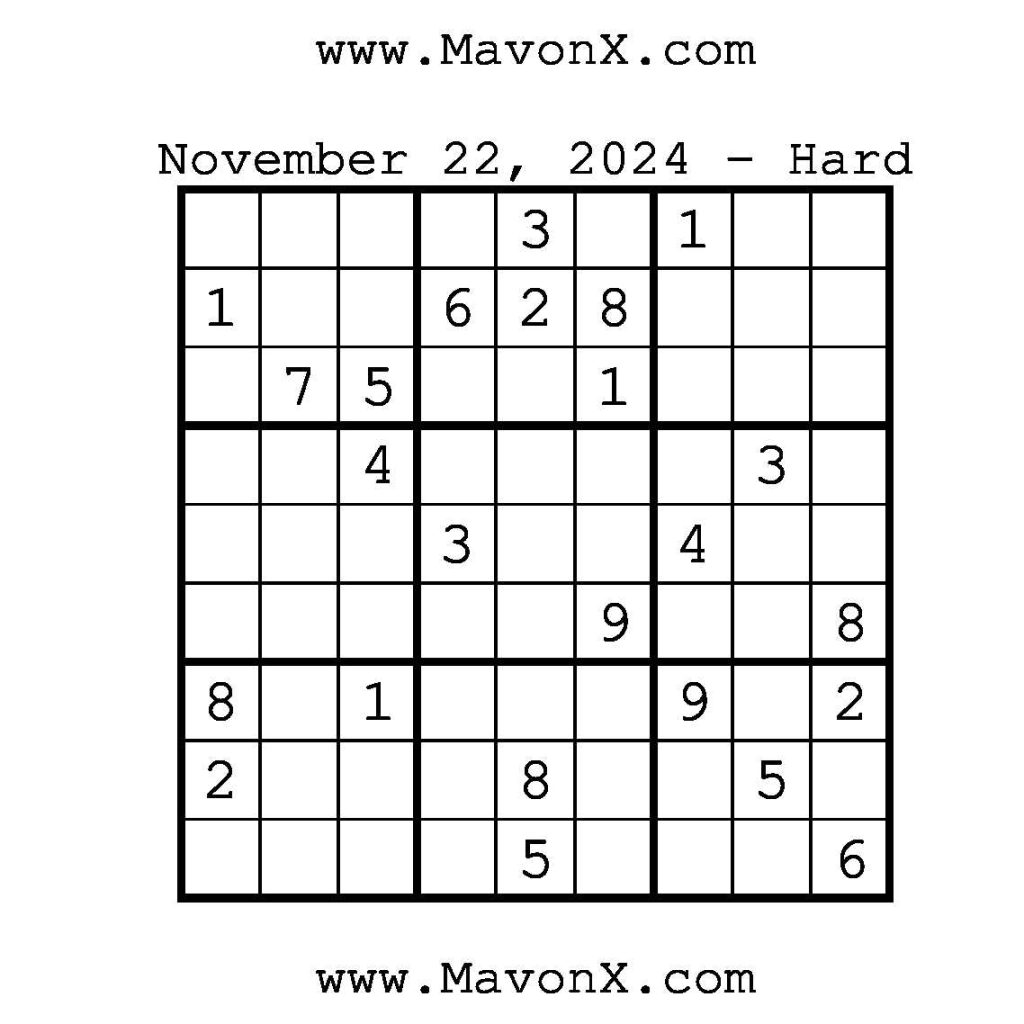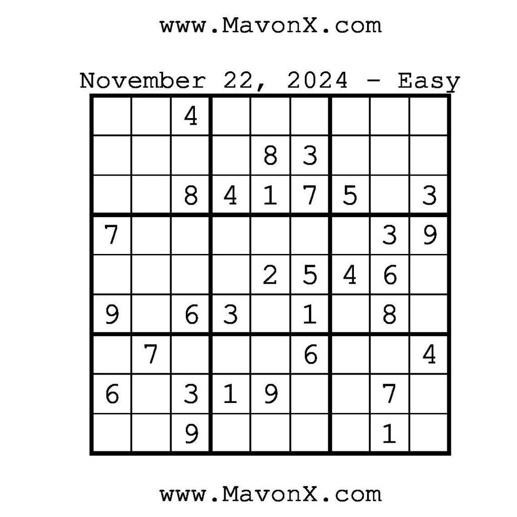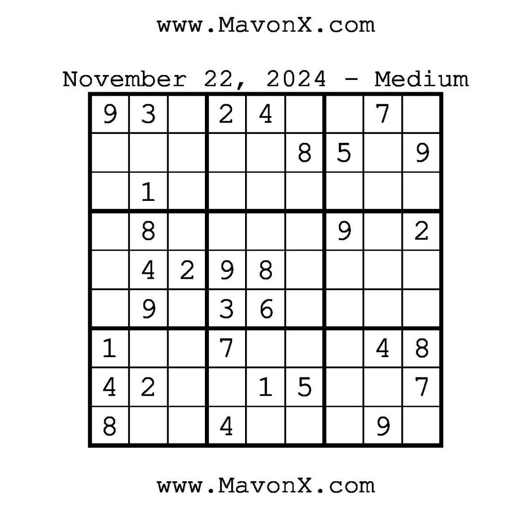Puzzles of the Day – November 22, 2024 Post author:admin Post published:November 21, 2024 Post category:Free Stuff / Puzzle of the Day / Puzzle of the Day Solutions / Solutions Post comments:0 Comments Check out our books on Amazon!, Check out our books on Barnes and Noble!, Check out our books on Etsy! Easy Sudoku Coach Link Medium Sudoku Coach Link Hard Sudoku Coach Link Show Solution You Might Also Like Puzzles of the Day – May 17, 2025 May 16, 2025 Puzzles of the Day – February 3, 2025 February 3, 2025 Puzzles of the Day – August 24, 2025 August 24, 2025 Leave a Reply Cancel replyCommentEnter your name or username to comment Enter your email address to comment Enter your website URL (optional) Save my name, email, and website in this browser for the next time I comment.