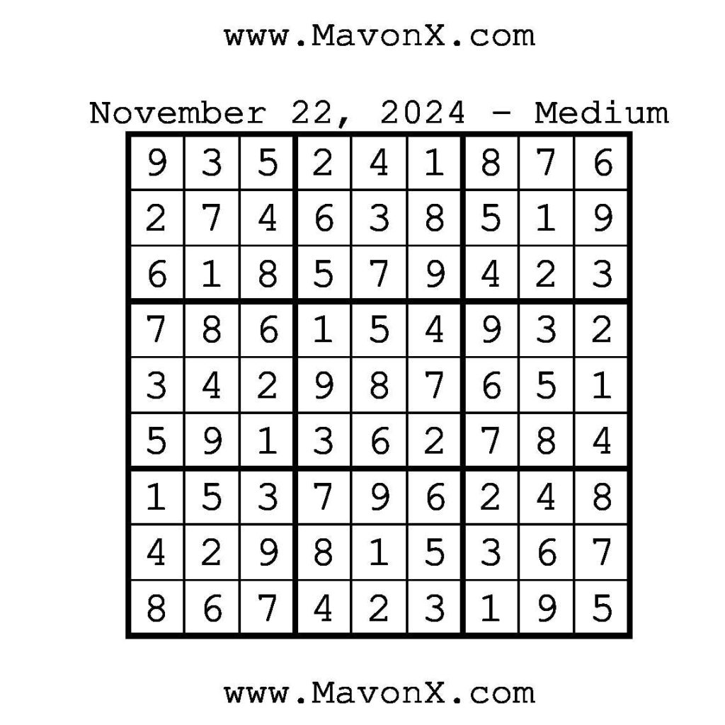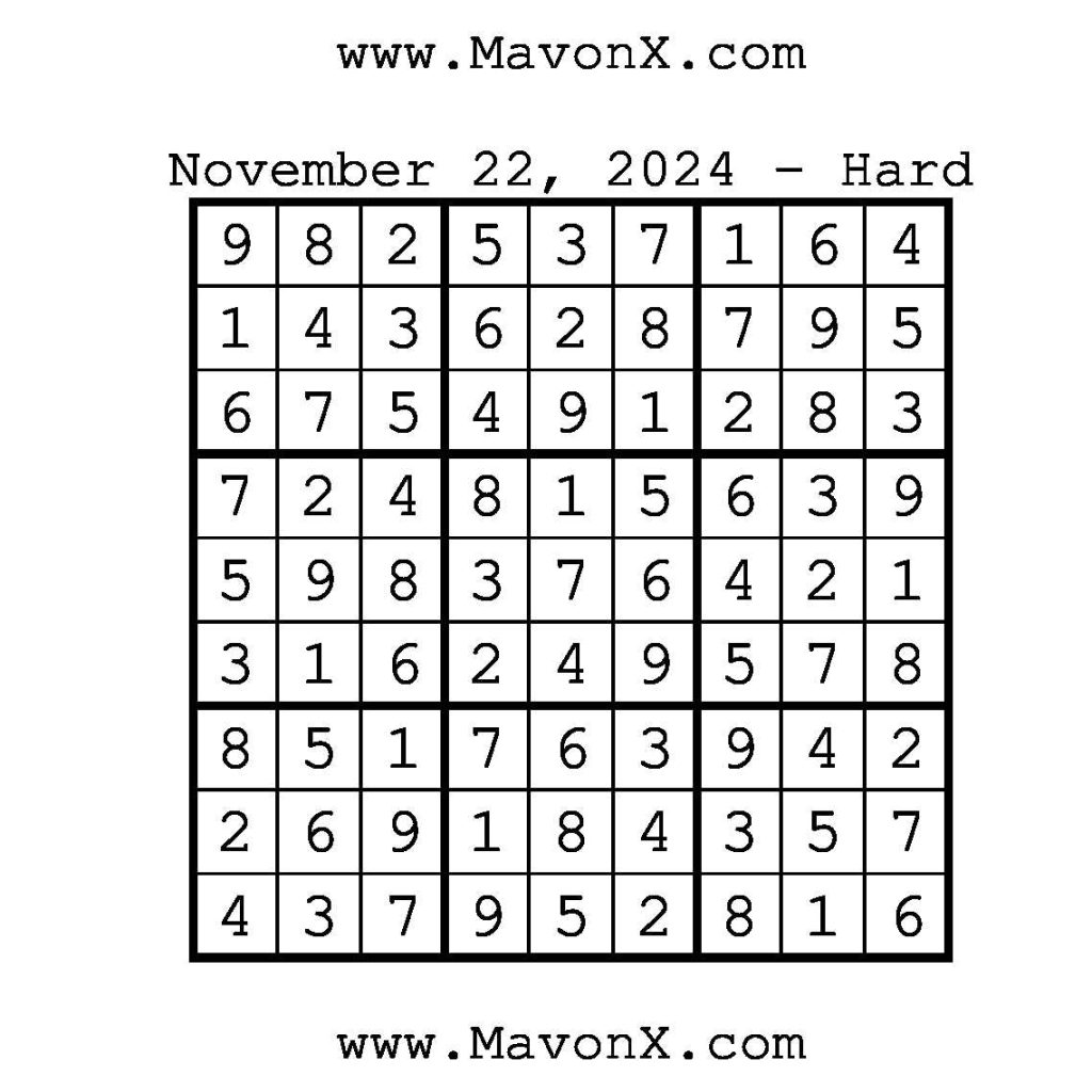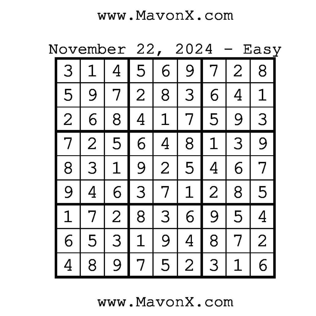 Puzzles of the Day – November 22, 2024 Post author:admin Post published:November 21, 2024 Post category:Free Stuff / Puzzle of the Day / Puzzle of the Day Solutions / Solutions Post comments:0 Comments Check out our books on Amazon!, Check out our books on Barnes and Noble!, Check out our books on Etsy! Easy Sudoku Coach Link Medium Sudoku Coach Link Hard Sudoku Coach Link Show Solution You Might Also Like Puzzles of the Day – May 17, 2025 May 16, 2025 Puzzles of the Day – February 3, 2025 February 3, 2025 Puzzles of the Day – August 24, 2025 August 24, 2025 Leave a Reply Cancel replyCommentEnter your name or username to comment Enter your email address to comment Enter your website URL (optional) Save my name, email, and website in this browser for the next time I comment.