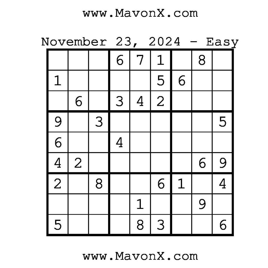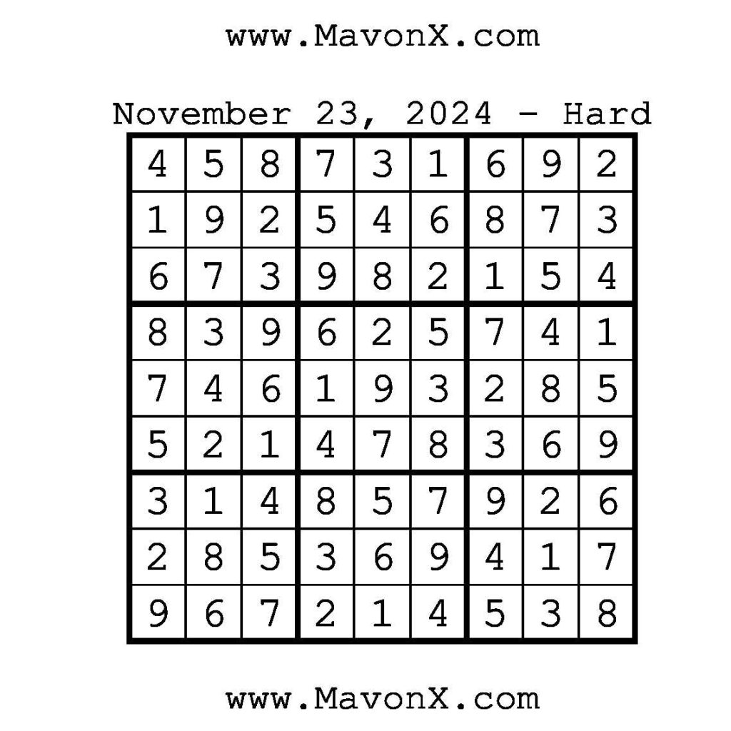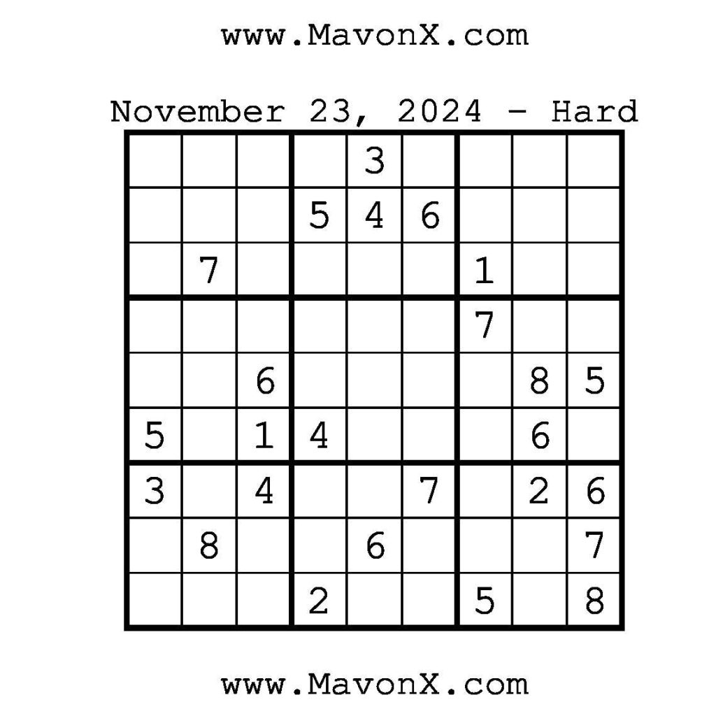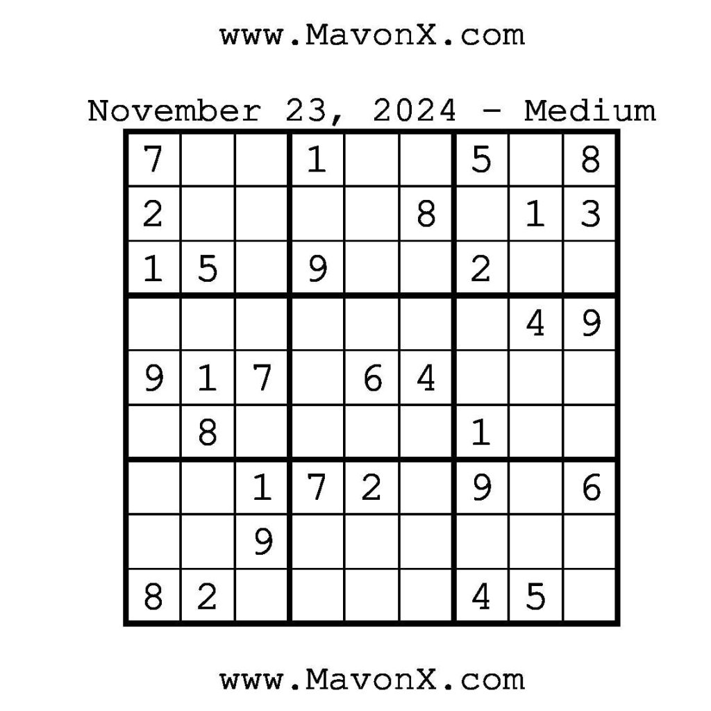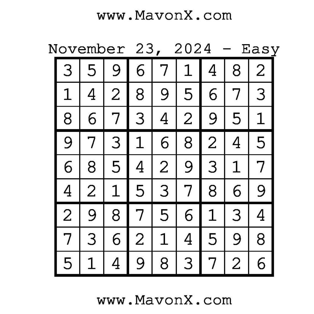 Puzzles of the Day – November 23, 2024 Post author:admin Post published:November 24, 2024 Post category:Free Stuff / Puzzle of the Day / Puzzle of the Day Solutions / Solutions Post comments:0 Comments Check out our books on Amazon!, Check out our books on Barnes and Noble!, Check out our books on Etsy! Easy Sudoku Coach Link Medium Sudoku Coach Link Hard Sudoku Coach Link Show Solution You Might Also Like Puzzles of the Day – August 24, 2025 August 24, 2025 Puzzles of the Day – August 22, 2025 August 21, 2025 Puzzles of the Day – November 5, 2024 November 4, 2024 Leave a Reply Cancel replyCommentEnter your name or username to comment Enter your email address to comment Enter your website URL (optional) Save my name, email, and website in this browser for the next time I comment.