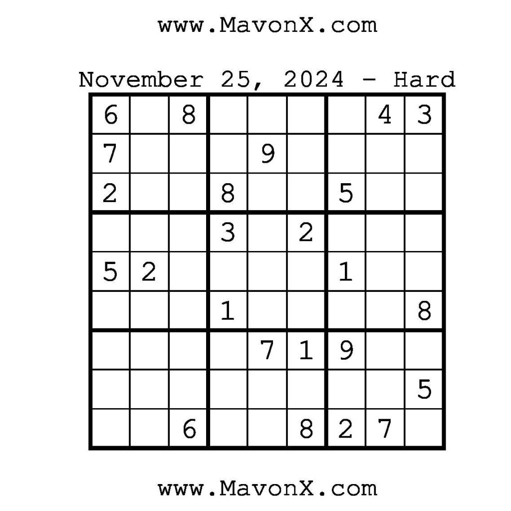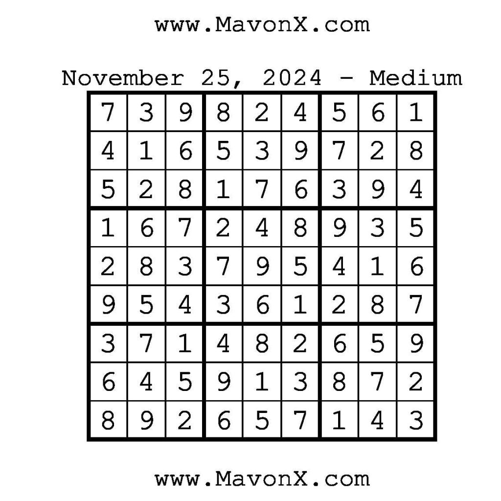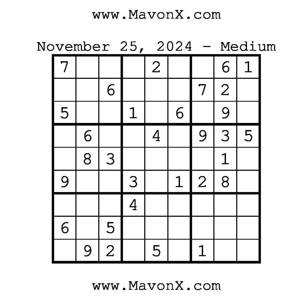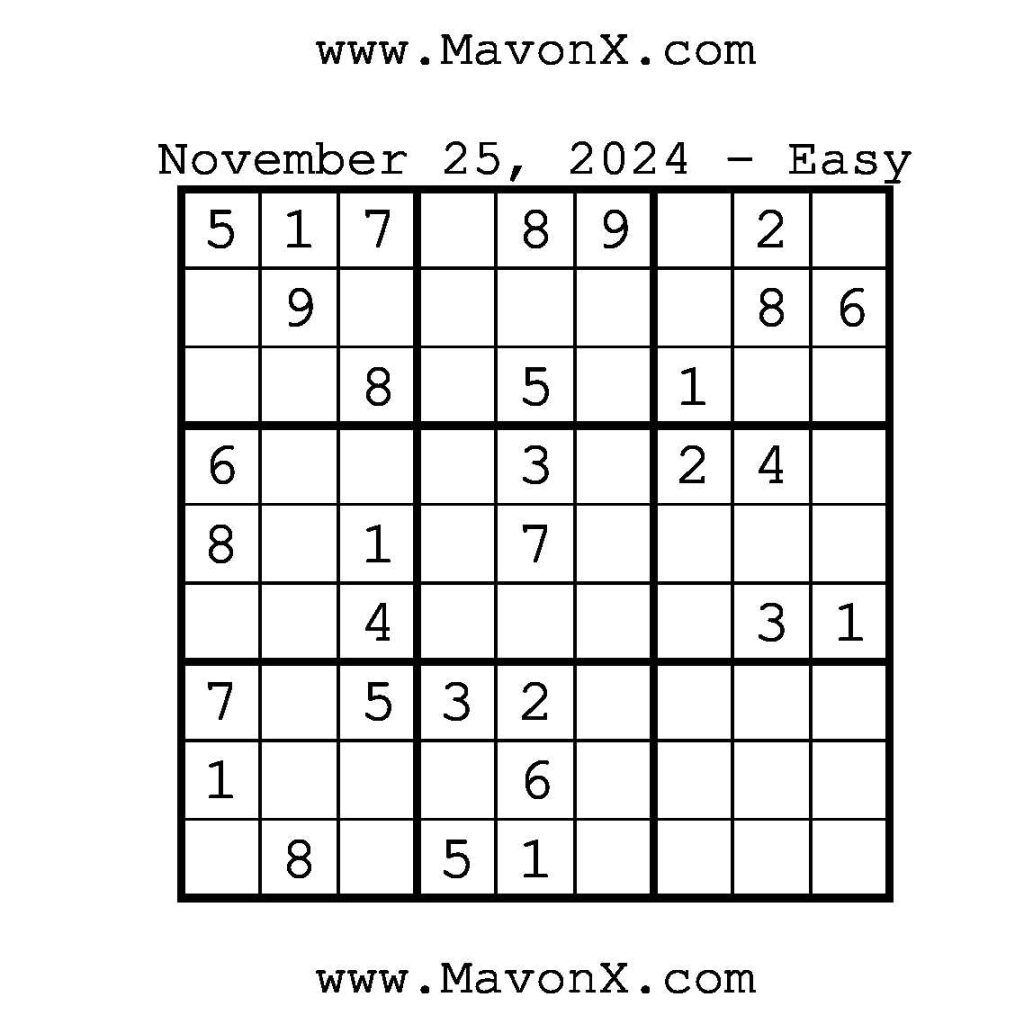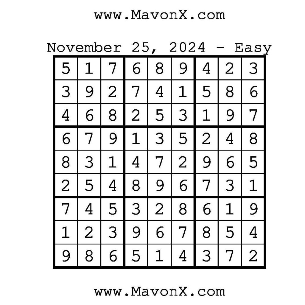 Puzzles of the Day – November 25, 2024 Post author:admin Post published:November 24, 2024 Post category:Free Stuff / Puzzle of the Day / Puzzle of the Day Solutions / Solutions Post comments:0 Comments Check out our books on Amazon!, Check out our books on Barnes and Noble!, Check out our books on Etsy! Easy Sudoku Coach Link Medium Sudoku Coach Link Hard Sudoku Coach Link Show Solution You Might Also Like Puzzles of the Day – September 14, 2025 September 13, 2025 Puzzles of the Day – August 15, 2024 August 15, 2024 Puzzles of the Day – April 15, 2025 April 14, 2025 Leave a Reply Cancel replyCommentEnter your name or username to comment Enter your email address to comment Enter your website URL (optional) Save my name, email, and website in this browser for the next time I comment.