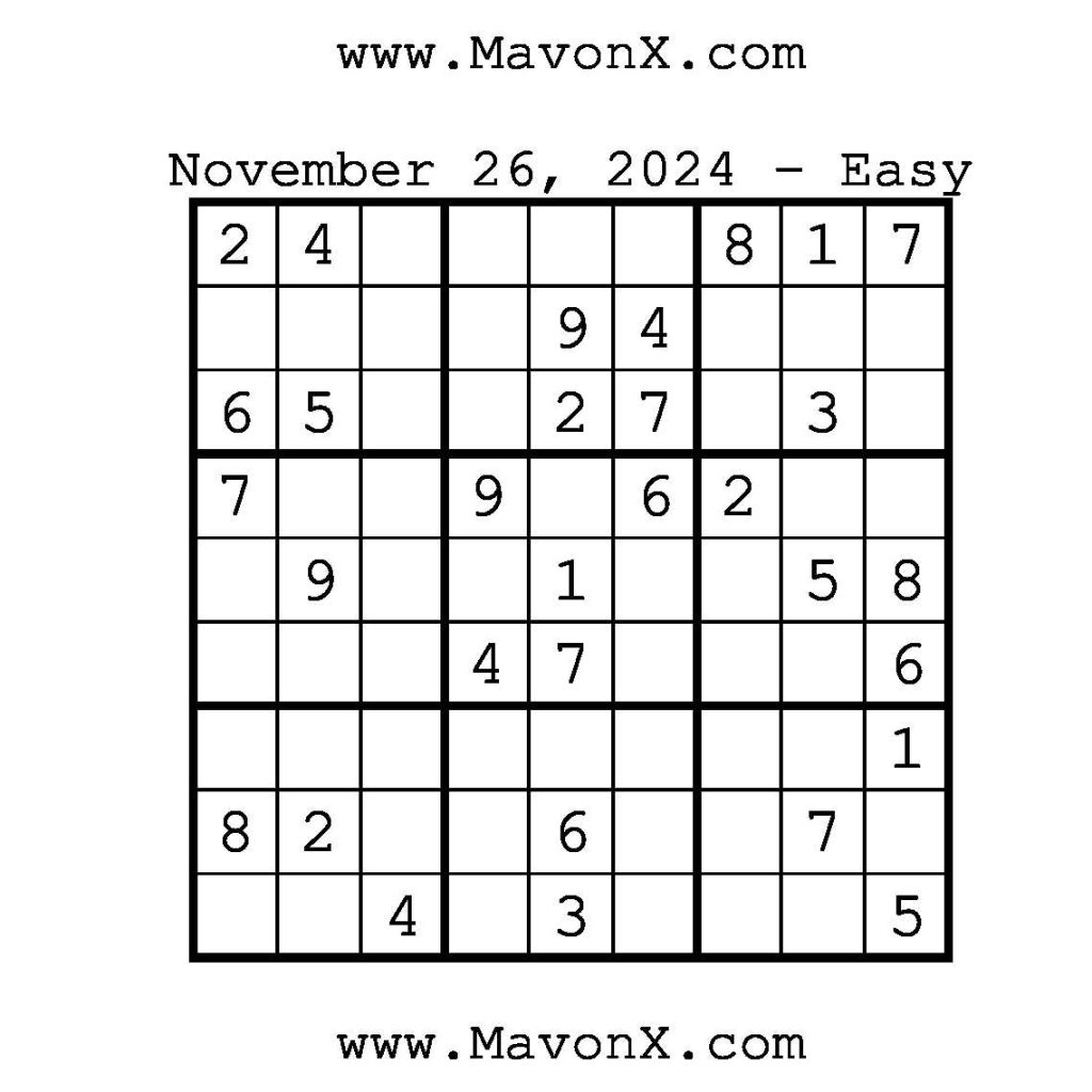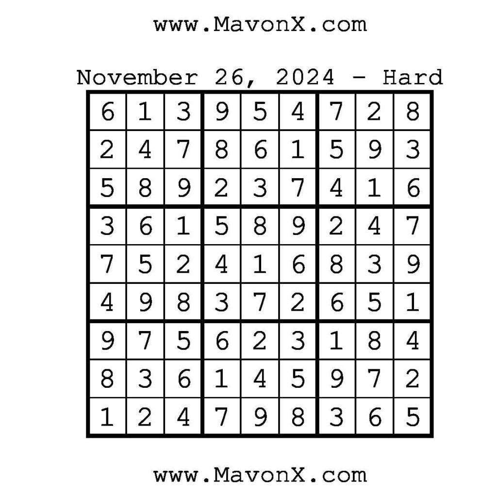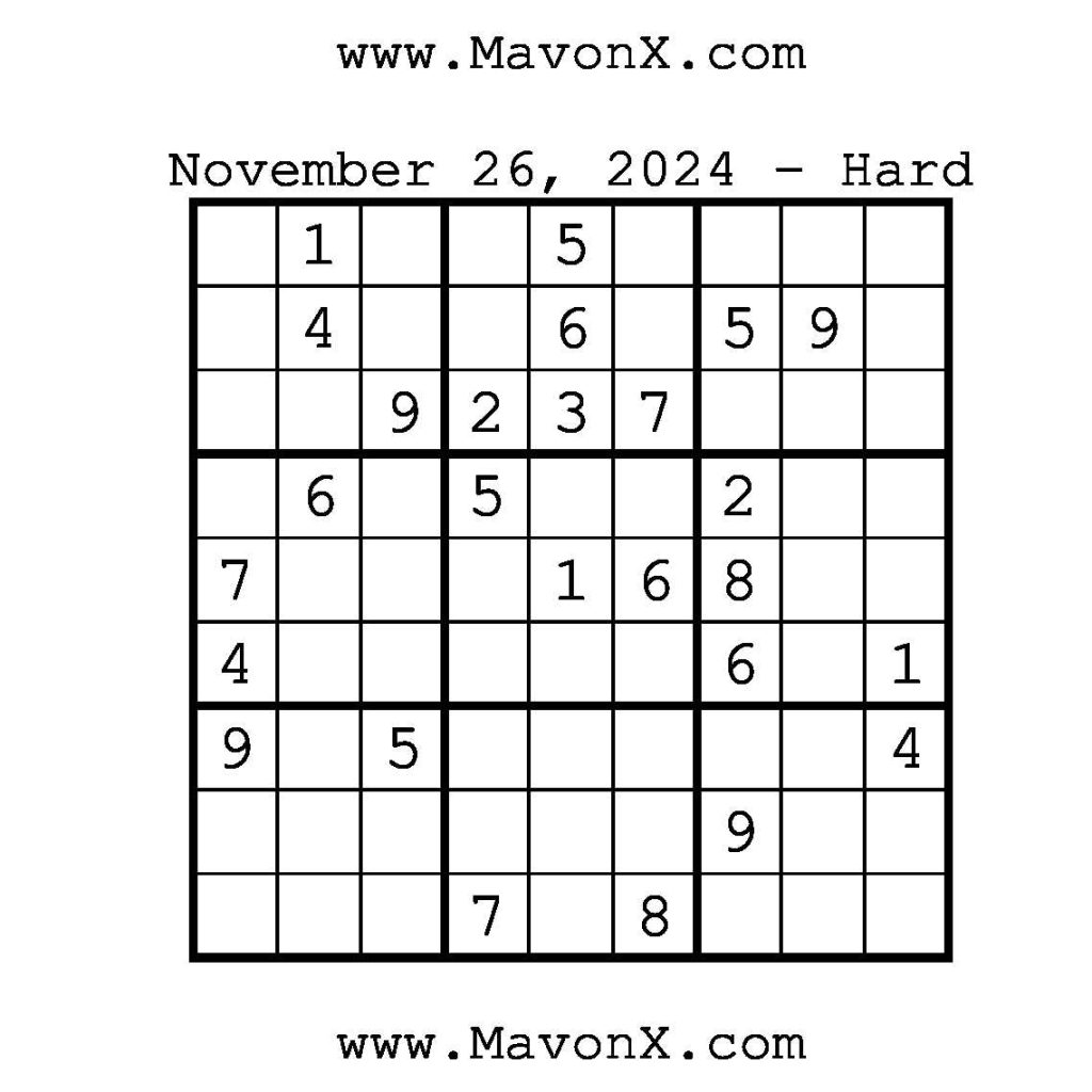 Puzzles of the Day – November 26, 2024 Post author:admin Post published:November 26, 2024 Post category:Free Stuff / Puzzle of the Day / Puzzle of the Day Solutions / Solutions Post comments:0 Comments Check out our books on Amazon!, Check out our books on Barnes and Noble!, Check out our books on Etsy! Easy Sudoku Coach Link Medium Sudoku Coach Link Hard Sudoku Coach Link Show Solution You Might Also Like Puzzles of the Day – May 23, 2025 May 22, 2025 Puzzle of the Day – July 12, 2024 July 12, 2024 Puzzles of the Day – January 13, 2026 January 12, 2026 Leave a Reply Cancel replyCommentEnter your name or username to comment Enter your email address to comment Enter your website URL (optional) Save my name, email, and website in this browser for the next time I comment.
