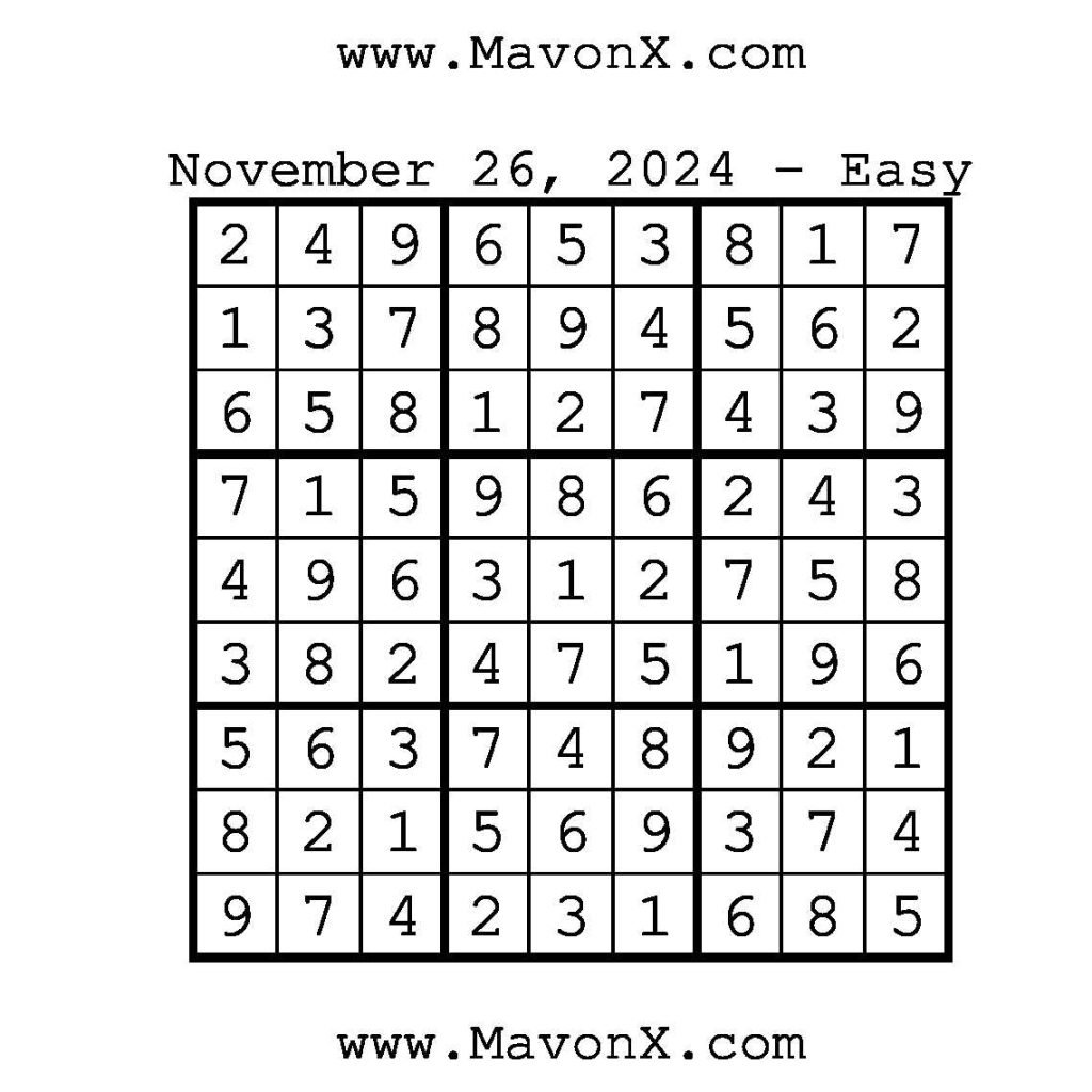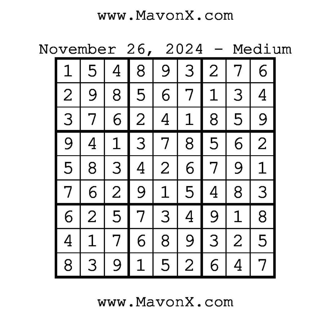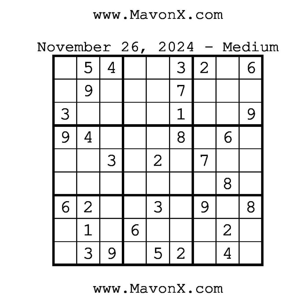 Puzzles of the Day – November 26, 2024 Post author:admin Post published:November 26, 2024 Post category:Free Stuff / Puzzle of the Day / Puzzle of the Day Solutions / Solutions Post comments:0 Comments Check out our books on Amazon!, Check out our books on Barnes and Noble!, Check out our books on Etsy! Easy Sudoku Coach Link Medium Sudoku Coach Link Hard Sudoku Coach Link Show Solution You Might Also Like Puzzles of the Day – May 23, 2025 May 22, 2025 Puzzle of the Day – July 12, 2024 July 12, 2024 Puzzles of the Day – January 13, 2026 January 12, 2026 Leave a Reply Cancel replyCommentEnter your name or username to comment Enter your email address to comment Enter your website URL (optional) Save my name, email, and website in this browser for the next time I comment.