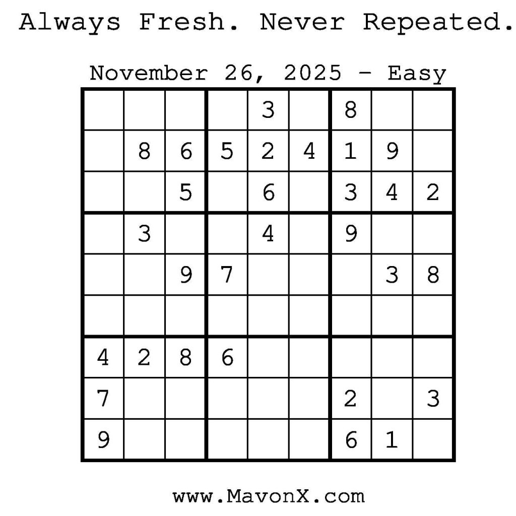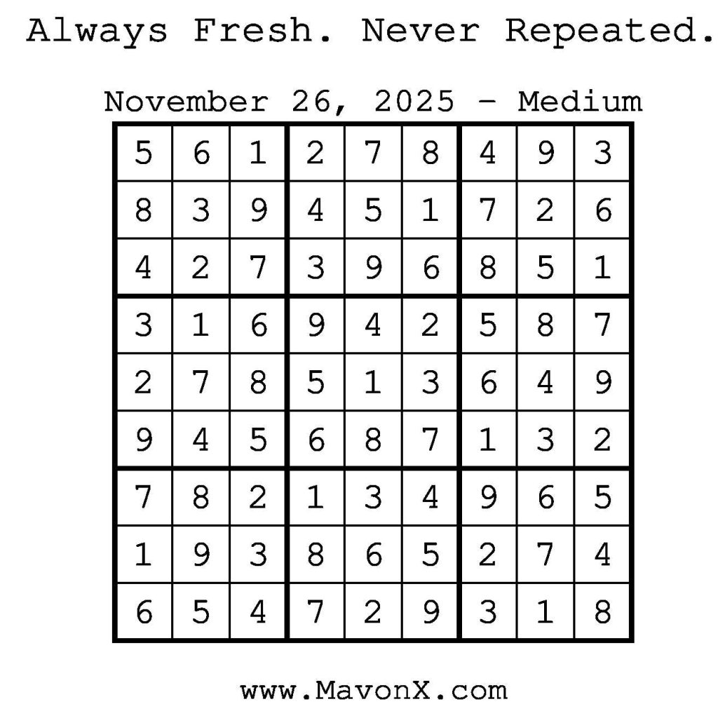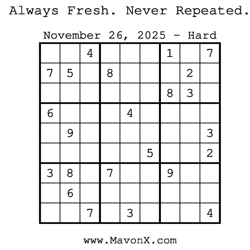 Puzzles of the Day – November 26, 2025 Post author:admin Post published:November 26, 2025 Post category:Free Stuff / Puzzle of the Day / Puzzle of the Day Solutions / Solutions Post comments:0 Comments Check out our books on Amazon! Check out our books on Barnes and Noble! Check out our books on Etsy! Easy Sudoku Coach Link Medium Sudoku Coach Link Hard Sudoku Coach Link Show Solution You Might Also Like Puzzles of the Day – September 22, 2024 September 22, 2024 Puzzles of the Day – January 10, 2025 January 10, 2025 Puzzles of the Day – August 16, 2024 August 16, 2024 Leave a Reply Cancel replyCommentEnter your name or username to comment Enter your email address to comment Enter your website URL (optional) Save my name, email, and website in this browser for the next time I comment.