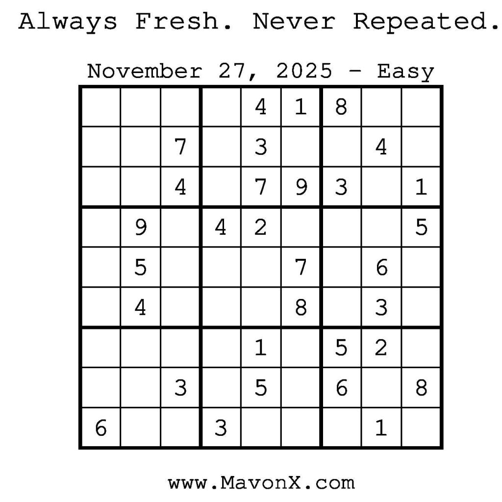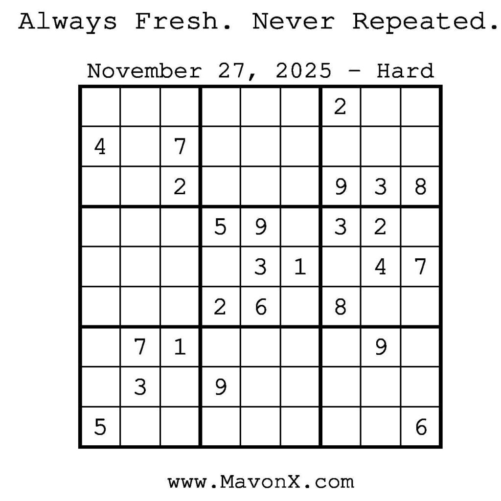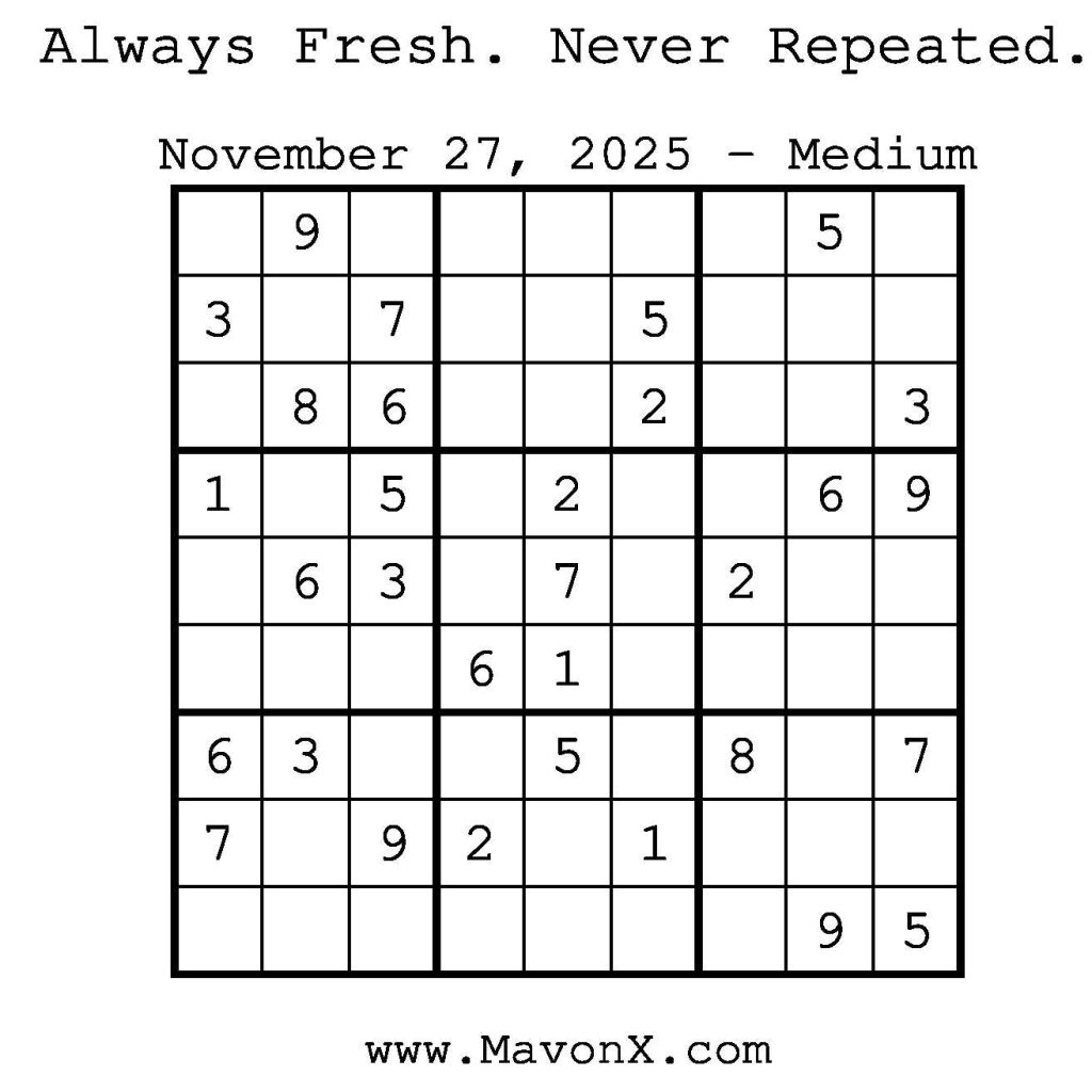 Puzzles of the Day – November 27, 2025 Post author:admin Post published:November 26, 2025 Post category:Free Stuff / Puzzle of the Day / Puzzle of the Day Solutions / Solutions Post comments:0 Comments Check out our books on Amazon! Check out our books on Barnes and Noble! Check out our books on Etsy! Easy Sudoku Coach Link Medium Sudoku Coach Link Hard Sudoku Coach Link Show Solution You Might Also Like Puzzles of the Day – November 25, 2025 November 24, 2025 Puzzles of the Day – November 2, 2024 November 1, 2024 Puzzles of the Day – August 15, 2025 August 15, 2025 Leave a Reply Cancel replyCommentEnter your name or username to comment Enter your email address to comment Enter your website URL (optional) Save my name, email, and website in this browser for the next time I comment.