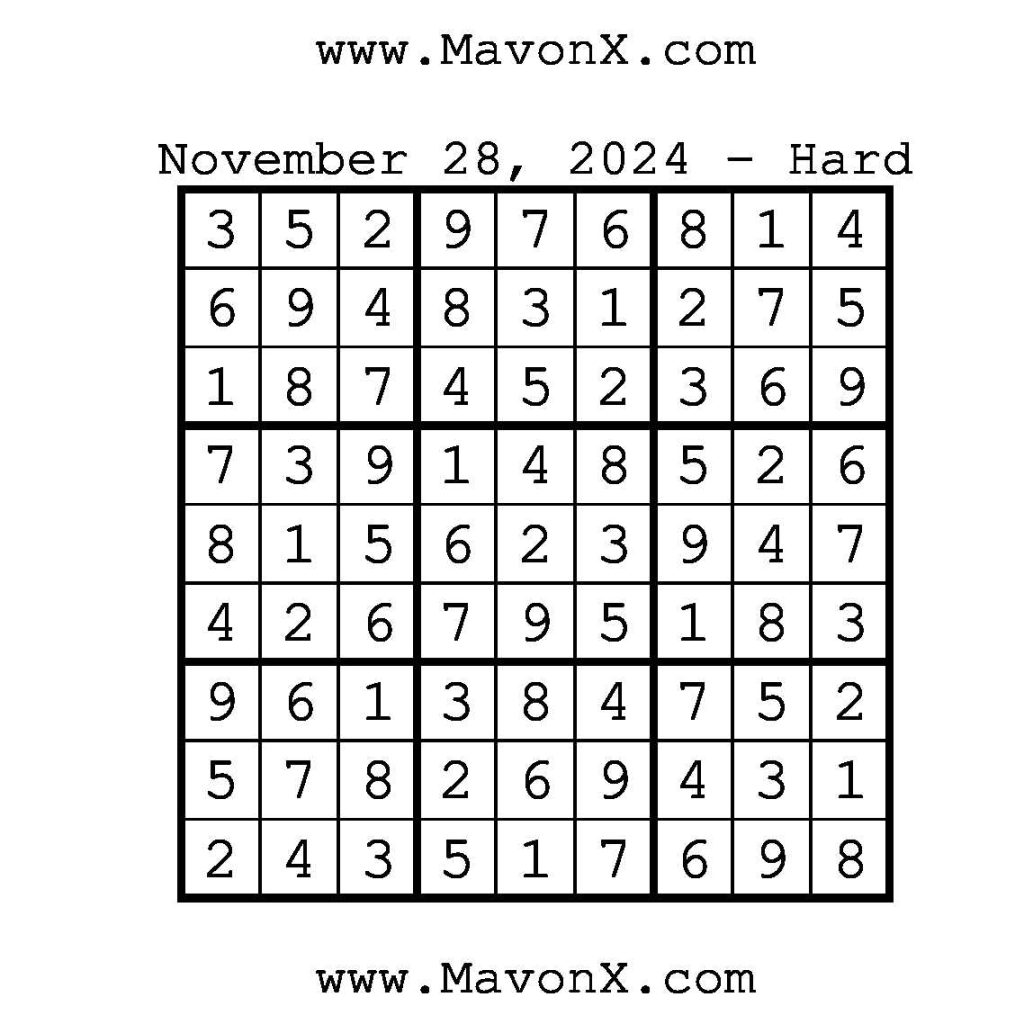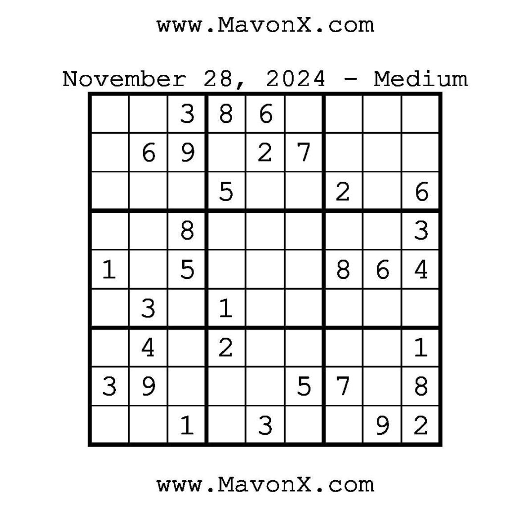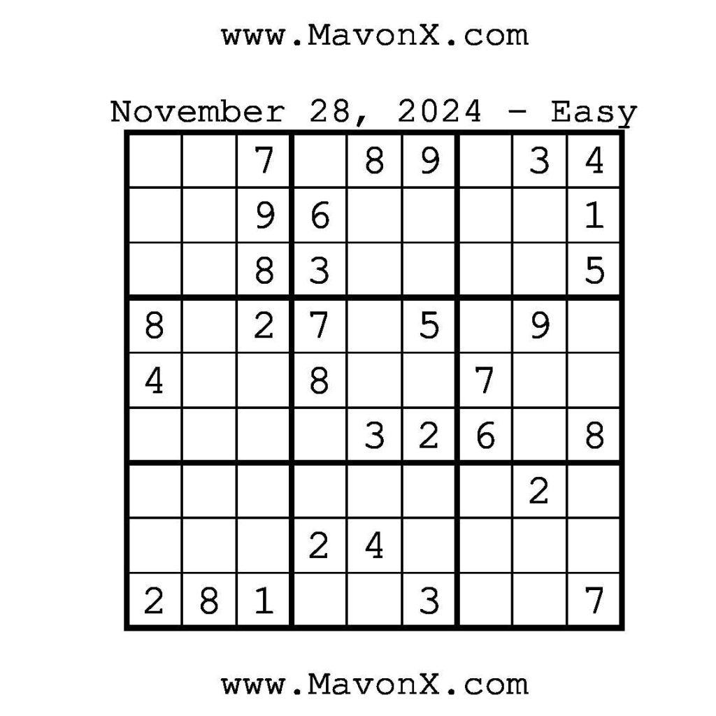 Puzzles of the Day – November 28, 2024 Post author:admin Post published:November 28, 2024 Post category:Free Stuff / Puzzle of the Day / Puzzle of the Day Solutions / Solutions Post comments:0 Comments Check out our books on Amazon!, Check out our books on Barnes and Noble!, Check out our books on Etsy! Easy Sudoku Coach Link Medium Sudoku Coach Link Hard Sudoku Coach Link Show Solution You Might Also Like Puzzles of the Day – July 23, 2025 July 23, 2025 Puzzles of the Day – December 20, 2024 December 19, 2024 Puzzles of the Day – April 29, 2025 April 28, 2025 Leave a Reply Cancel replyCommentEnter your name or username to comment Enter your email address to comment Enter your website URL (optional) Save my name, email, and website in this browser for the next time I comment.