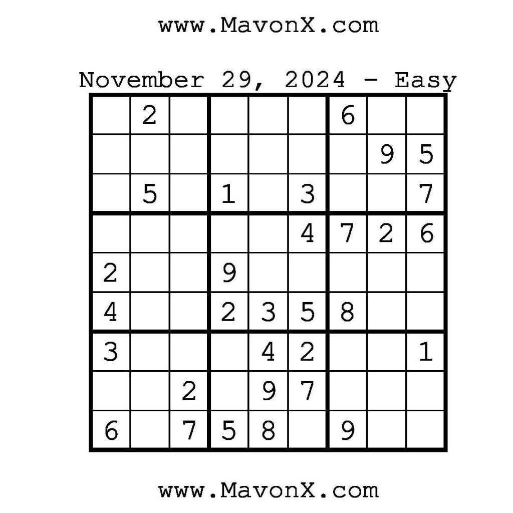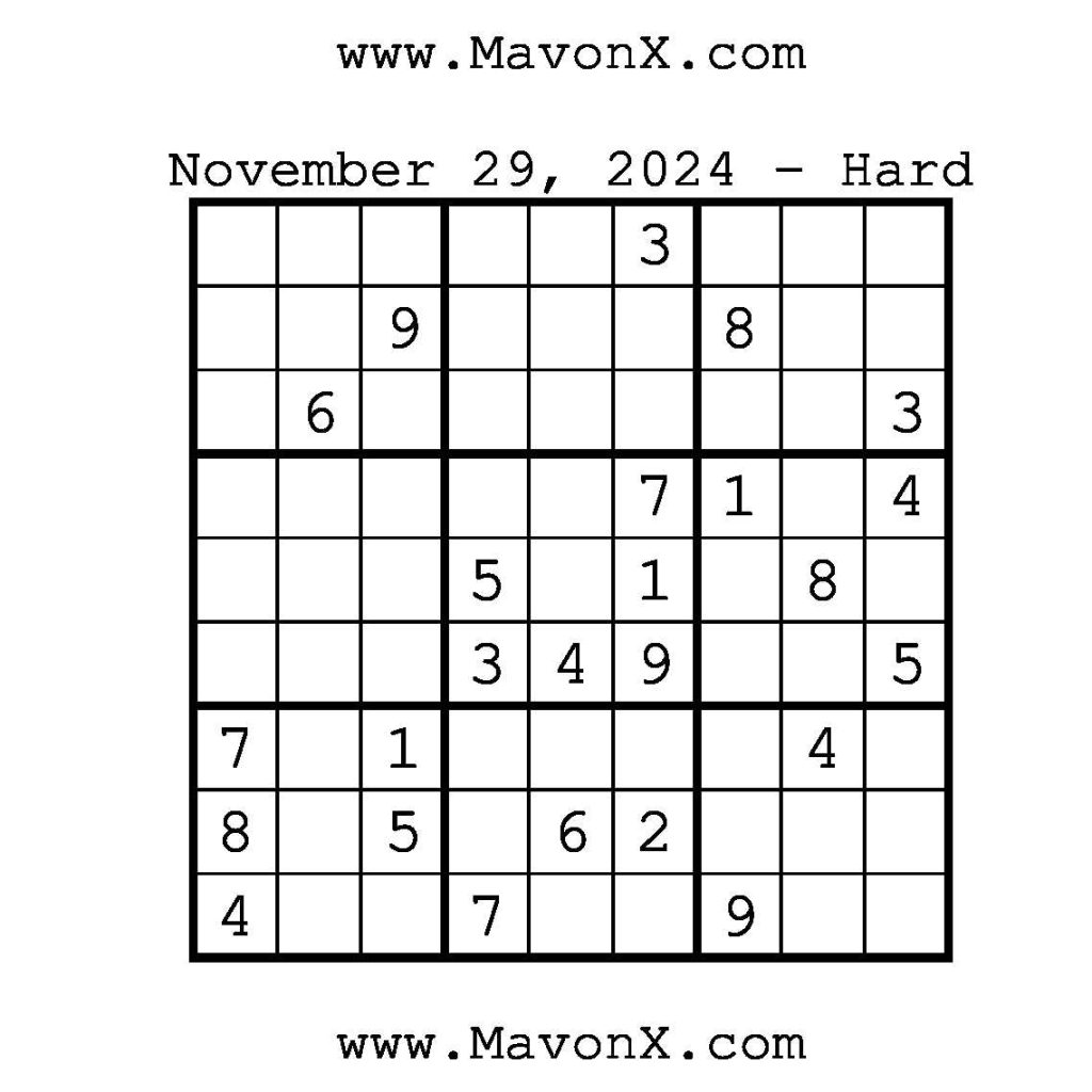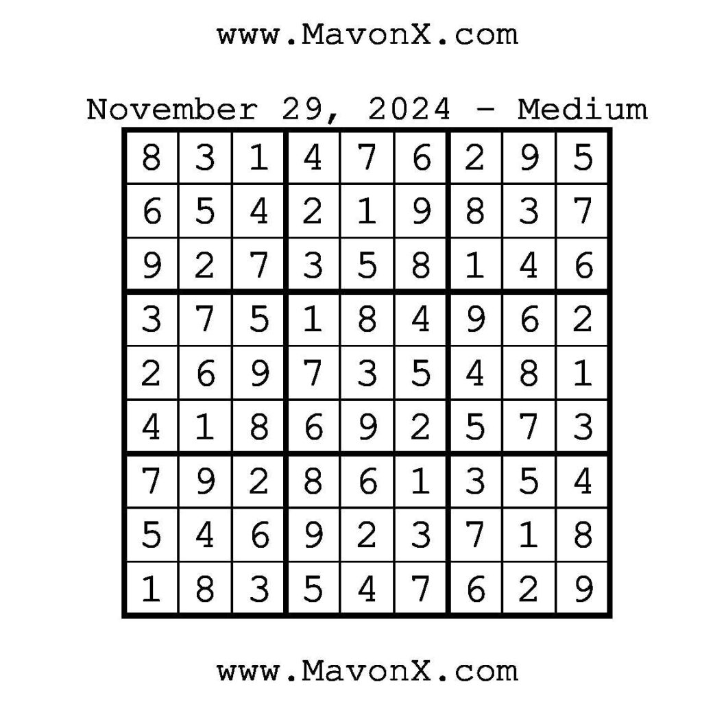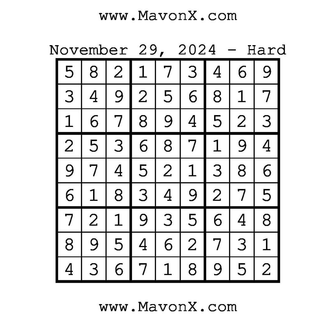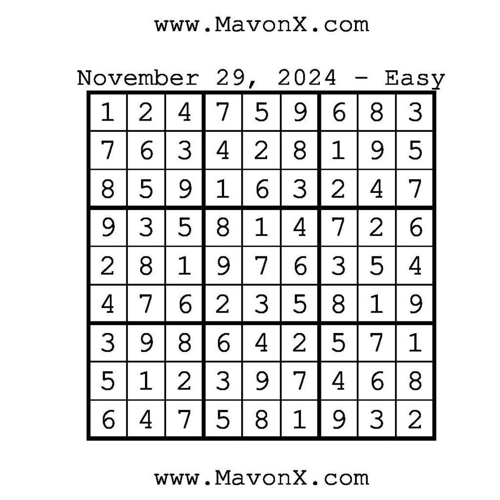 Puzzles of the Day – November 29, 2024 Post author:admin Post published:November 28, 2024 Post category:Free Stuff / Puzzle of the Day / Puzzle of the Day Solutions / Solutions Post comments:0 Comments Check out our books on Amazon!, Check out our books on Barnes and Noble!, Check out our books on Etsy! Easy Sudoku Coach Link Medium Sudoku Coach Link Hard Sudoku Coach Link Show Solution You Might Also Like Puzzles of the Day – October 4, 2024 October 4, 2024 Puzzles of the Day – January 6, 2026 January 5, 2026 Puzzles of the Day – August 5, 2025 August 4, 2025 Leave a Reply Cancel replyCommentEnter your name or username to comment Enter your email address to comment Enter your website URL (optional) Save my name, email, and website in this browser for the next time I comment.