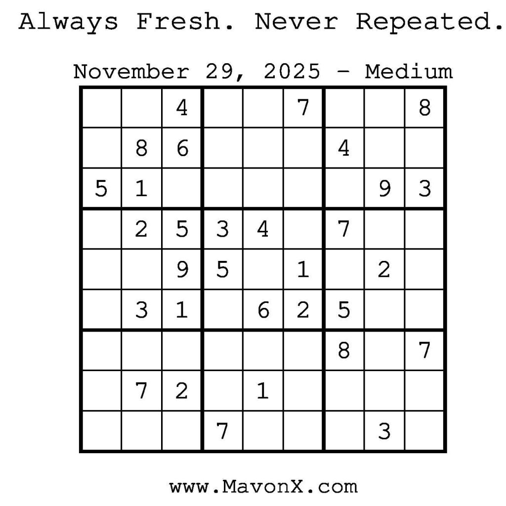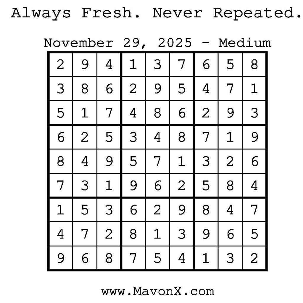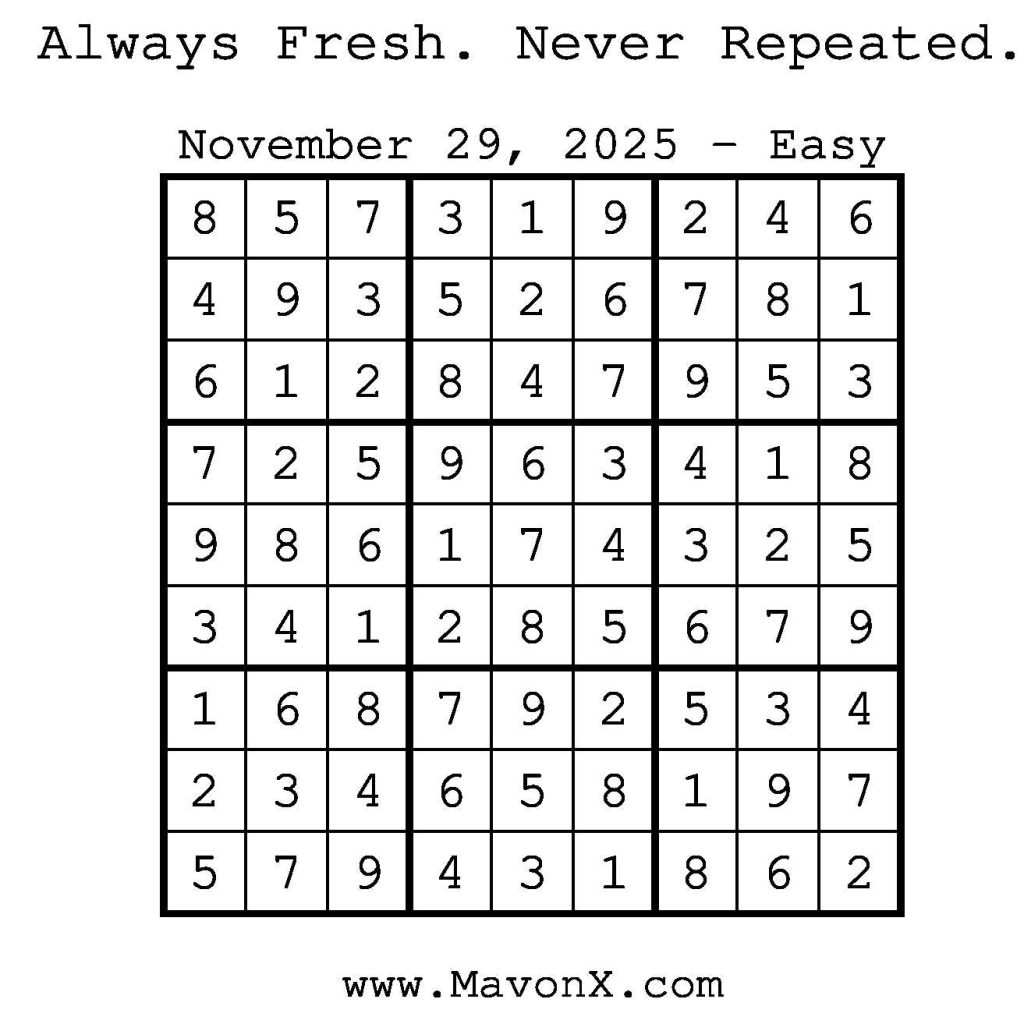 Puzzles of the Day – November 29, 2025 Post author:admin Post published:November 29, 2025 Post category:Free Stuff / Puzzle of the Day / Puzzle of the Day Solutions / Solutions Post comments:0 Comments Check out our books on Amazon! Check out our books on Barnes and Noble! Check out our books on Etsy! Easy Sudoku Coach Link Medium Sudoku Coach Link Hard Sudoku Coach Link Show Solution You Might Also Like Puzzles of the Day – August 30, 2025 August 29, 2025 Puzzles of the Day – October 15, 2025 October 14, 2025 Puzzle of the Day – July 25, 2024 July 26, 2024 Leave a Reply Cancel replyCommentEnter your name or username to comment Enter your email address to comment Enter your website URL (optional) Save my name, email, and website in this browser for the next time I comment.