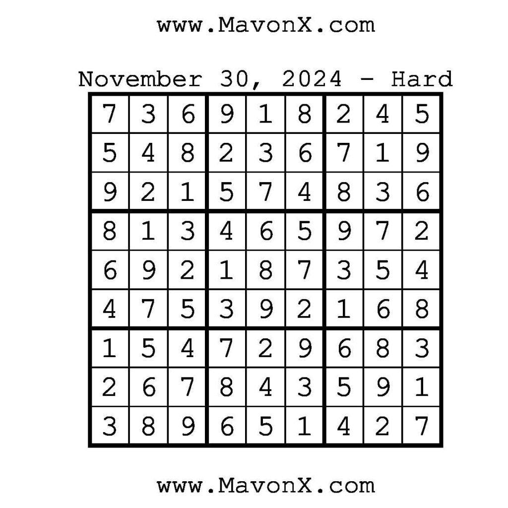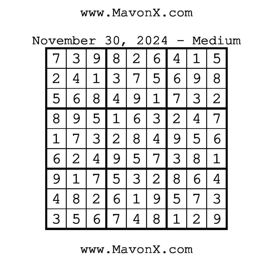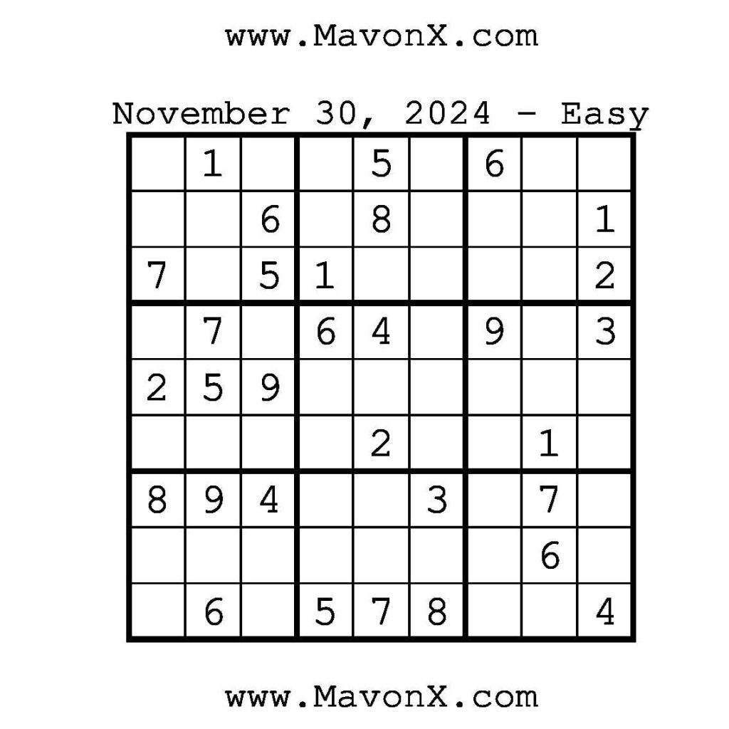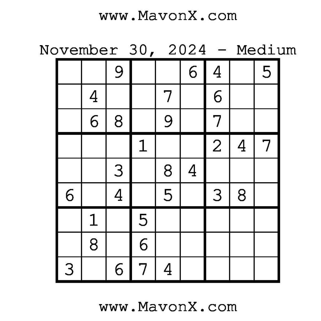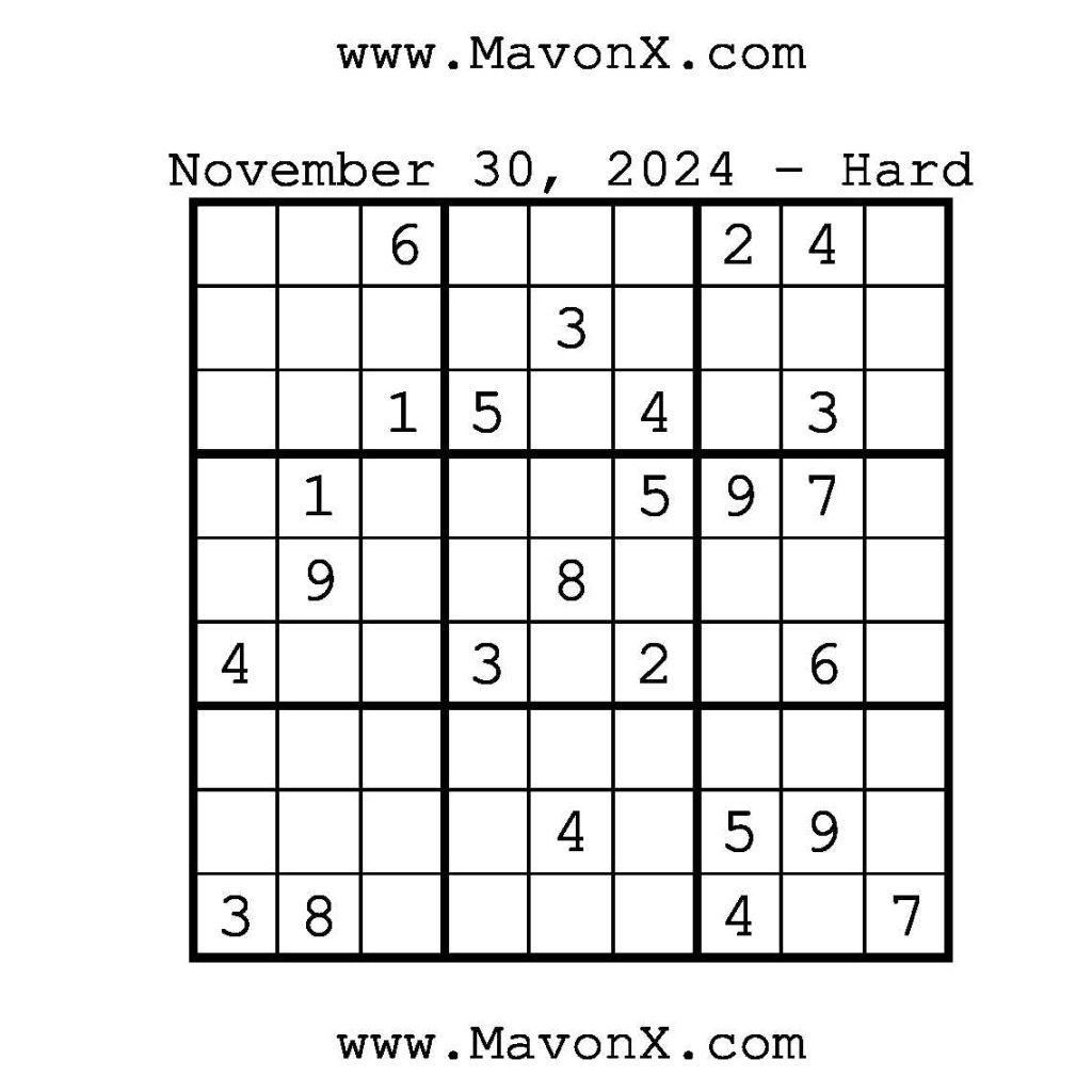 Puzzles of the Day – November 30, 2024 Post author:admin Post published:December 1, 2024 Post category:Free Stuff / Puzzle of the Day / Puzzle of the Day Solutions / Solutions Post comments:0 Comments Check out our books on Amazon!, Check out our books on Barnes and Noble!, Check out our books on Etsy! Easy Sudoku Coach Link Medium Sudoku Coach Link Hard Sudoku Coach Link Show Solution You Might Also Like Puzzles of the Day – August 21, 2024 August 21, 2024 Puzzles of the Day – April 14, 2026 April 14, 2026 Puzzles of the Day – November 6, 2025 November 5, 2025 Leave a Reply Cancel replyCommentEnter your name or username to comment Enter your email address to comment Enter your website URL (optional) Save my name, email, and website in this browser for the next time I comment.