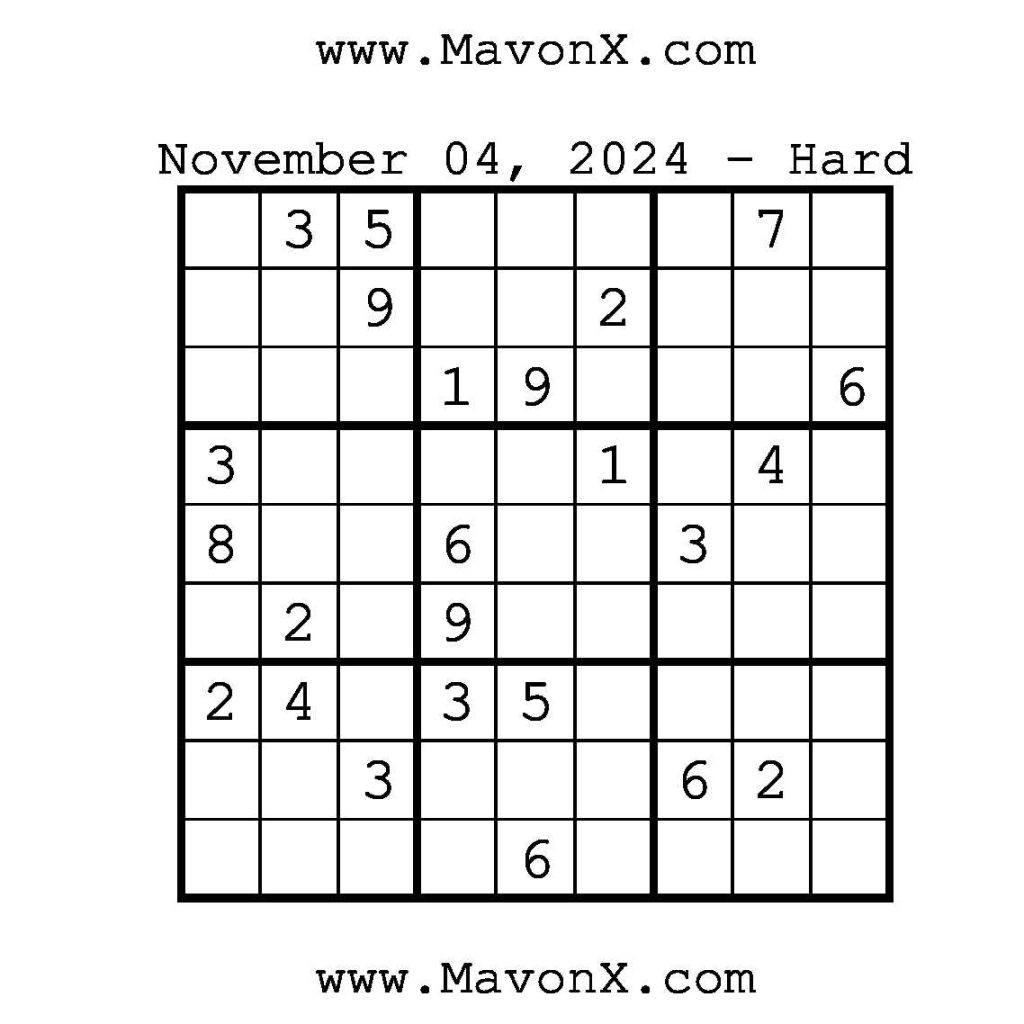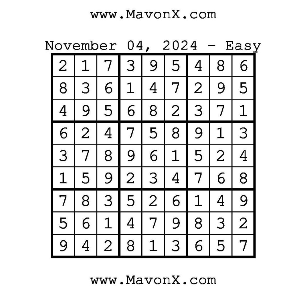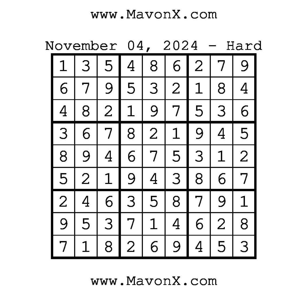 Puzzles of the Day – November 4, 2024 Post author:admin Post published:November 4, 2024 Post category:Free Stuff / Puzzle of the Day / Puzzle of the Day Solutions / Solutions Post comments:0 Comments Check out our books on Amazon!, Check out our books on Barnes and Noble!, Check out our books on Etsy! Easy Sudoku Coach Link Medium Sudoku Coach Link Hard Sudoku Coach Link Show Solution You Might Also Like Puzzles of the Day – March 25, 2025 March 25, 2025 Puzzles of the Day – July 3, 2025 July 3, 2025 Puzzles of the Day – March 11, 2025 March 11, 2025 Leave a Reply Cancel replyCommentEnter your name or username to comment Enter your email address to comment Enter your website URL (optional) Save my name, email, and website in this browser for the next time I comment.