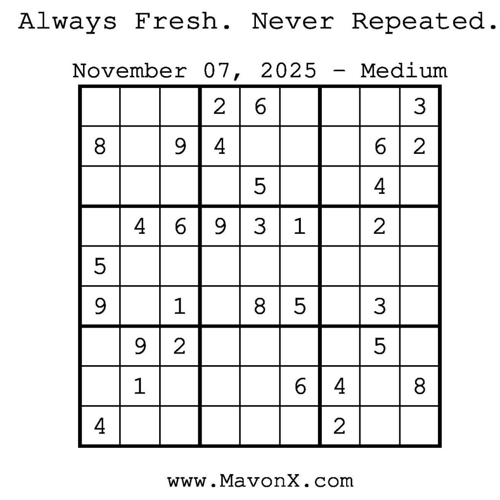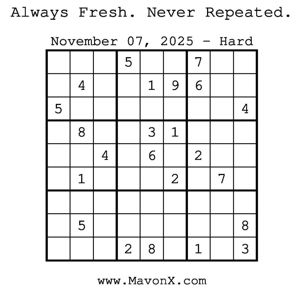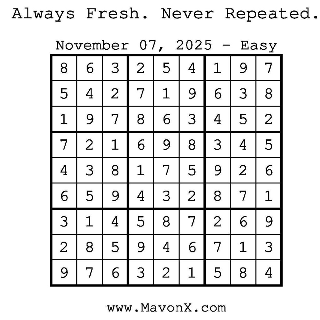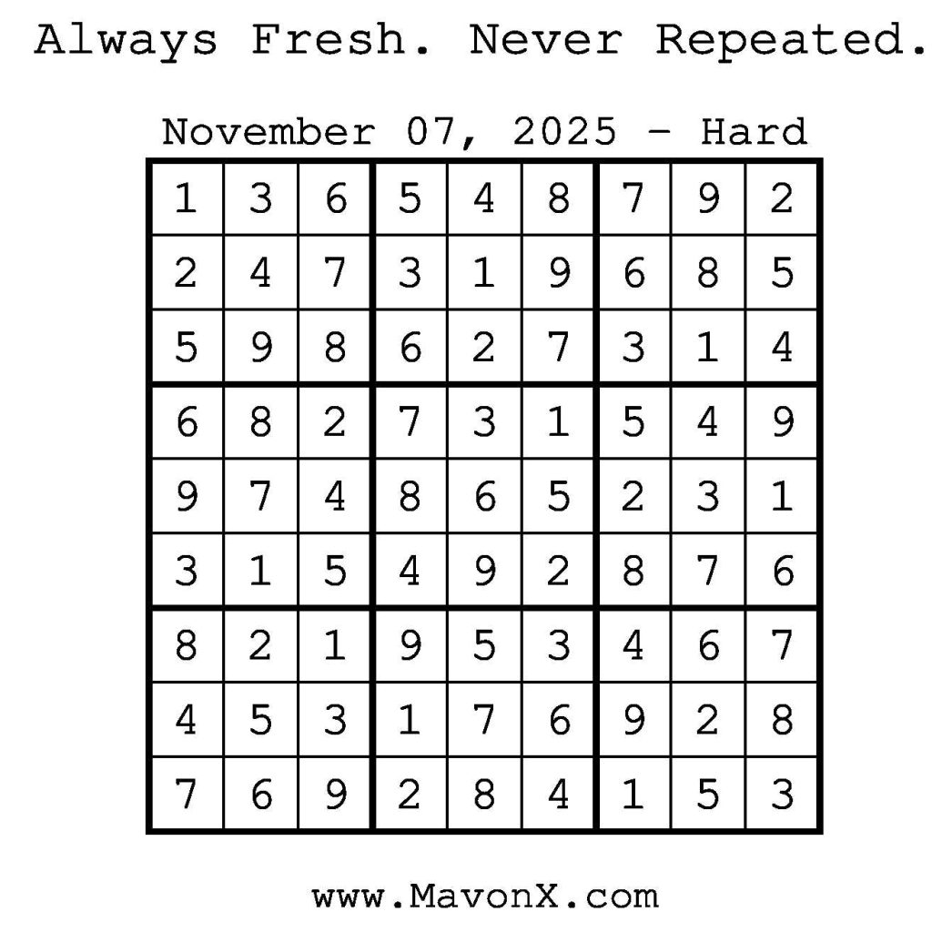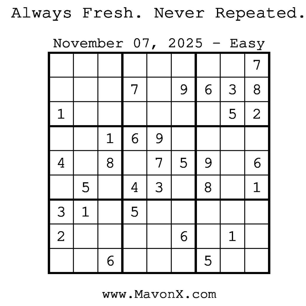 Puzzles of the Day – November 7, 2025 Post author:admin Post published:November 6, 2025 Post category:Free Stuff / Puzzle of the Day / Puzzle of the Day Solutions / Solutions Post comments:0 Comments Check out our books on Amazon! Check out our books on Barnes and Noble! Check out our books on Etsy! Easy Sudoku Coach Link Medium Sudoku Coach Link Hard Sudoku Coach Link Show Solution You Might Also Like Puzzles of the Day – May 3, 2025 May 2, 2025 Puzzle of the Day – July 14, 2024 July 14, 2024 Puzzles of the Day – January 7, 2025 January 7, 2025 Leave a Reply Cancel replyCommentEnter your name or username to comment Enter your email address to comment Enter your website URL (optional) Save my name, email, and website in this browser for the next time I comment.