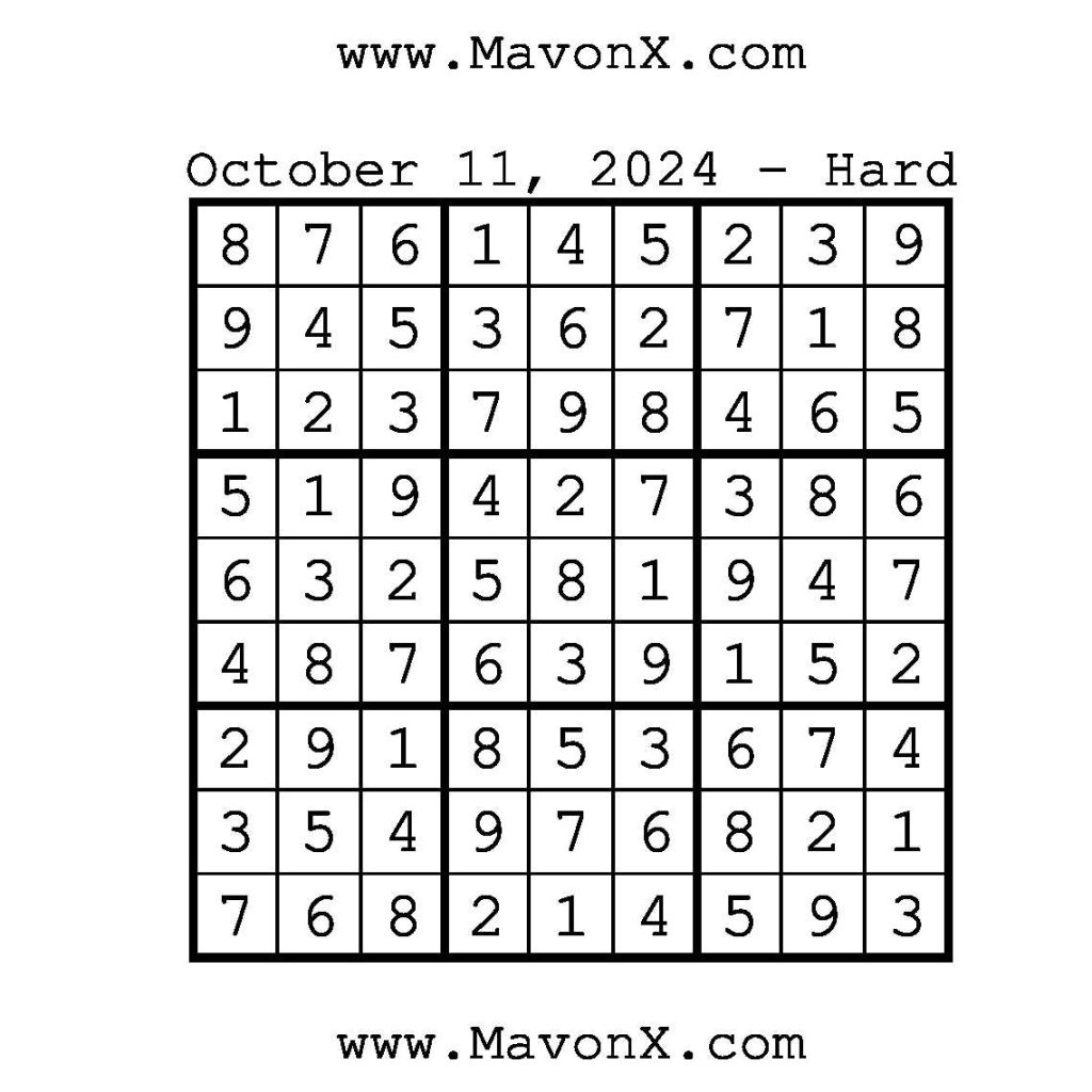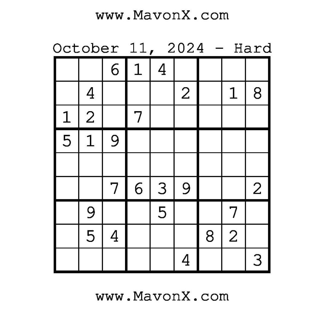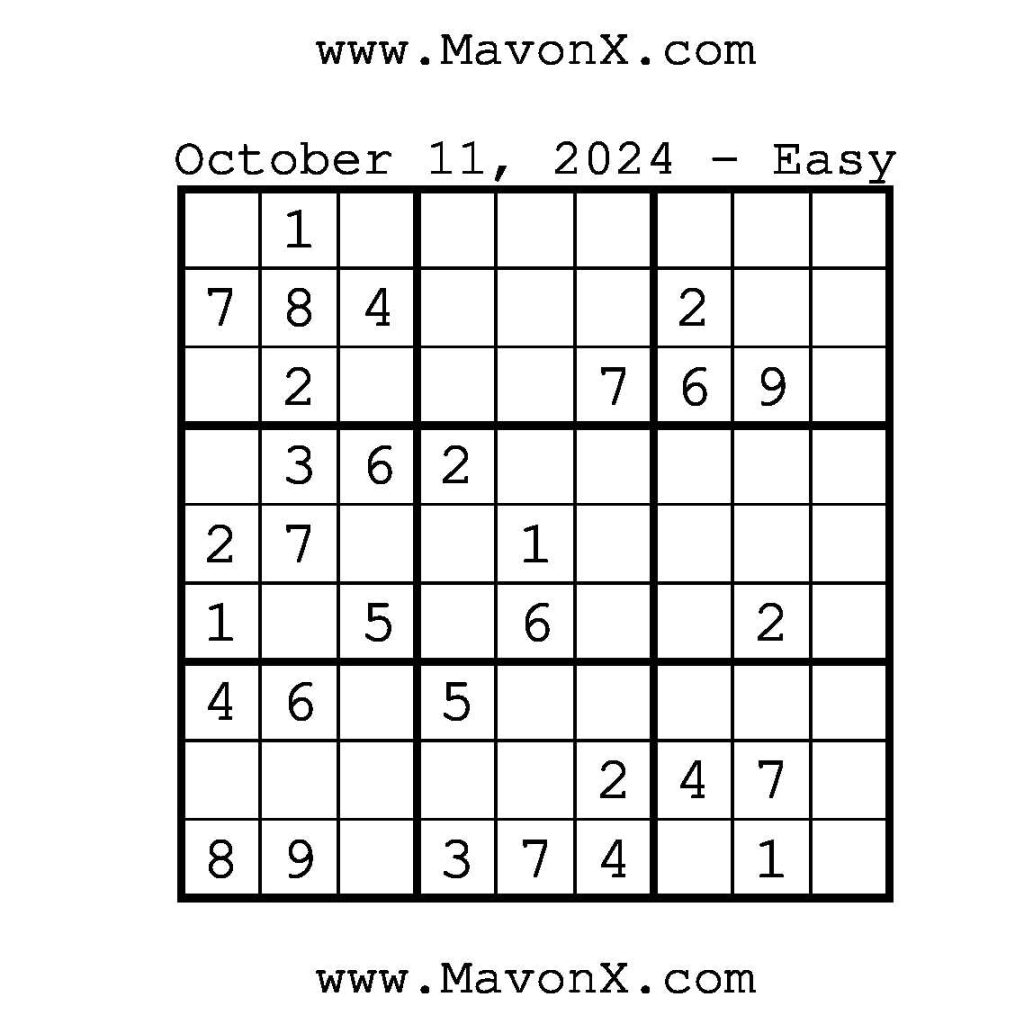 Puzzles of the Day – October 11, 2024 Post author:admin Post published:October 11, 2024 Post category:Free Stuff / Puzzle of the Day / Puzzle of the Day Solutions / Solutions Post comments:0 Comments Check out our books on Amazon!!!!! Easy Sudoku Coach Link Medium Sudoku Coach Link Hard Sudoku Coach Link Show Solution You Might Also Like Puzzles of the Day – March 24, 2025 March 25, 2025 Puzzles of the Day – March 24, 2026 March 23, 2026 Puzzles of the Day – October 15, 2025 October 14, 2025 Leave a Reply Cancel replyCommentEnter your name or username to comment Enter your email address to comment Enter your website URL (optional) Save my name, email, and website in this browser for the next time I comment.