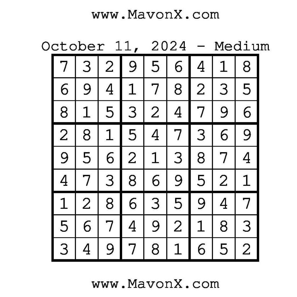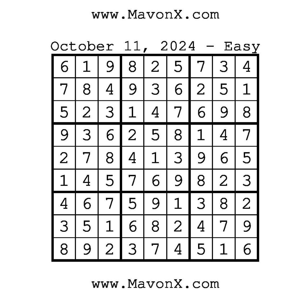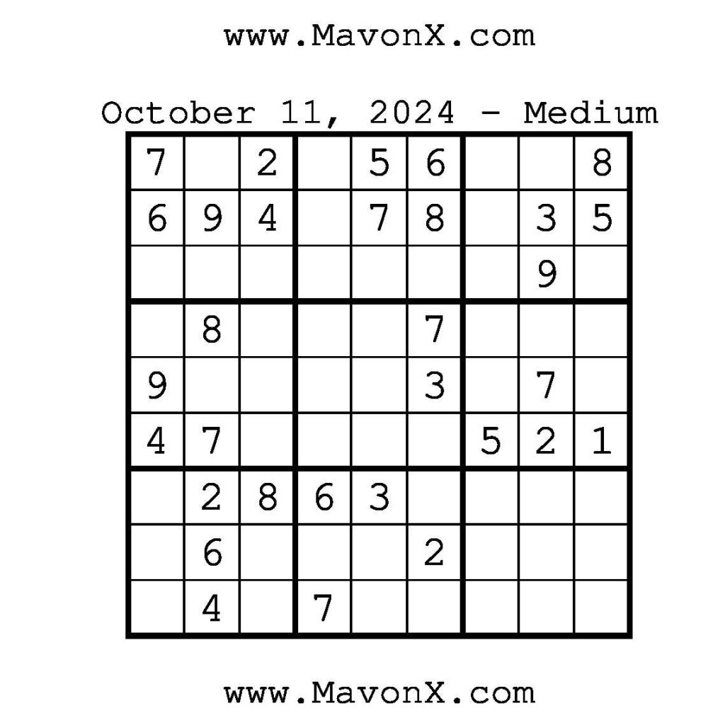 Puzzles of the Day – October 11, 2024 Post author:admin Post published:October 11, 2024 Post category:Free Stuff / Puzzle of the Day / Puzzle of the Day Solutions / Solutions Post comments:0 Comments Check out our books on Amazon!!!!! Easy Sudoku Coach Link Medium Sudoku Coach Link Hard Sudoku Coach Link Show Solution You Might Also Like Puzzles of the Day – March 24, 2025 March 25, 2025 Puzzles of the Day – March 24, 2026 March 23, 2026 Puzzles of the Day – October 15, 2025 October 14, 2025 Leave a Reply Cancel replyCommentEnter your name or username to comment Enter your email address to comment Enter your website URL (optional) Save my name, email, and website in this browser for the next time I comment.