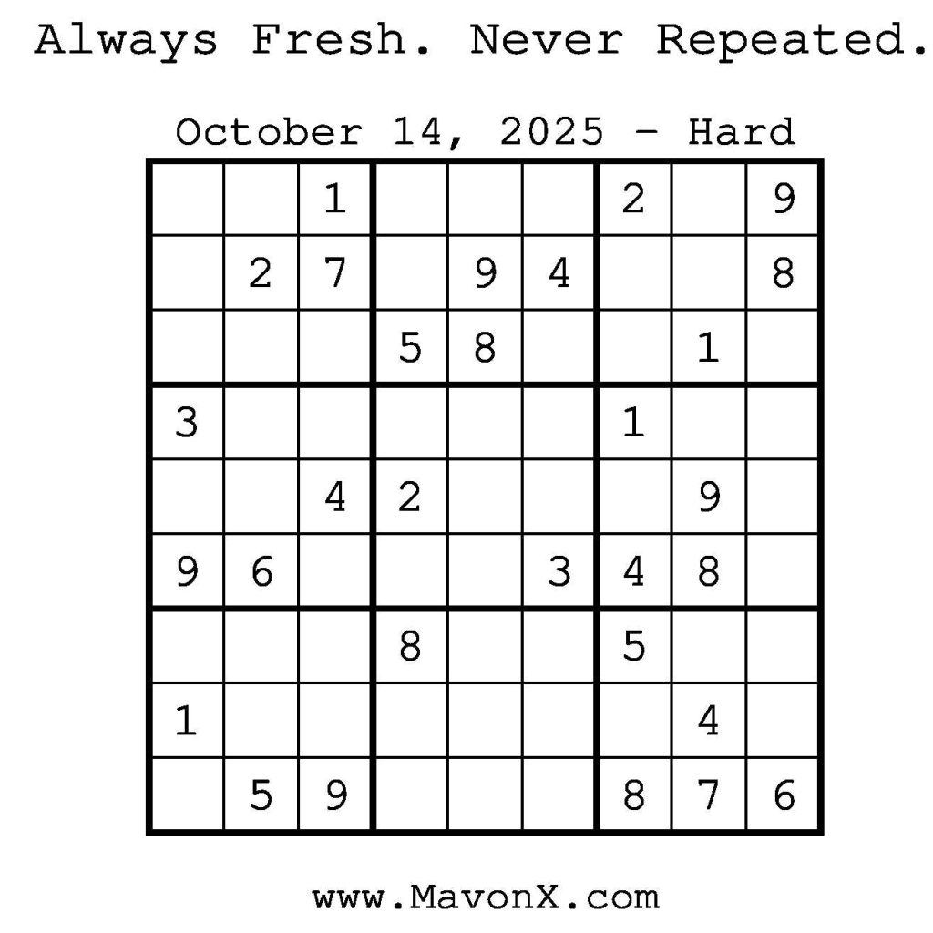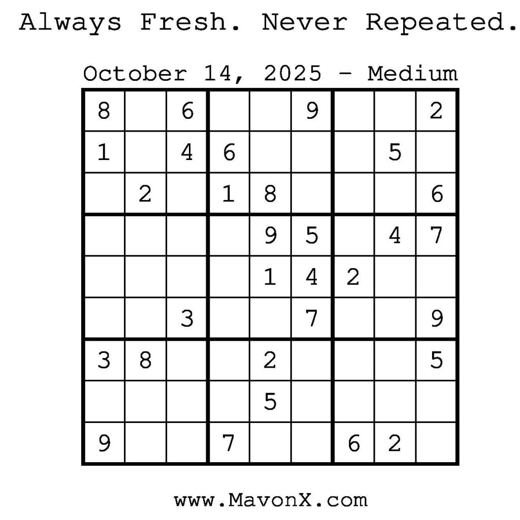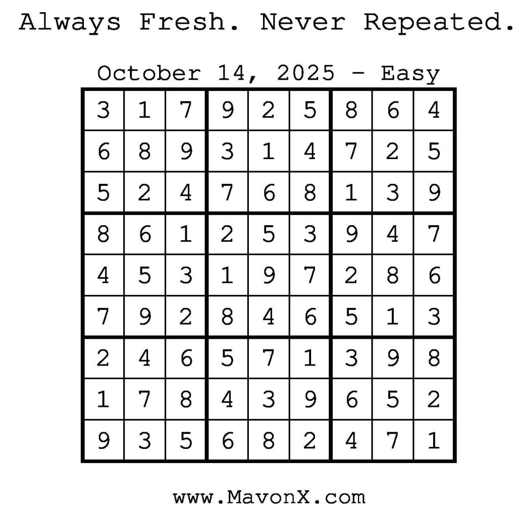 Puzzles of the Day – October 14, 2025 Post author:admin Post published:October 13, 2025 Post category:Free Stuff / Puzzle of the Day / Puzzle of the Day Solutions / Solutions Post comments:0 Comments Check out our books on Amazon! Check out our books on Barnes and Noble! Check out our books on Etsy! Easy Sudoku Coach Link Medium Sudoku Coach Link Hard Sudoku Coach Link Show Solution You Might Also Like Puzzles of the Day – December 21, 2024 December 21, 2024 Puzzles of the Day – May 28, 2025 May 27, 2025 Puzzles of the Day – December 10, 2025 December 9, 2025 Leave a Reply Cancel replyCommentEnter your name or username to comment Enter your email address to comment Enter your website URL (optional) Save my name, email, and website in this browser for the next time I comment.