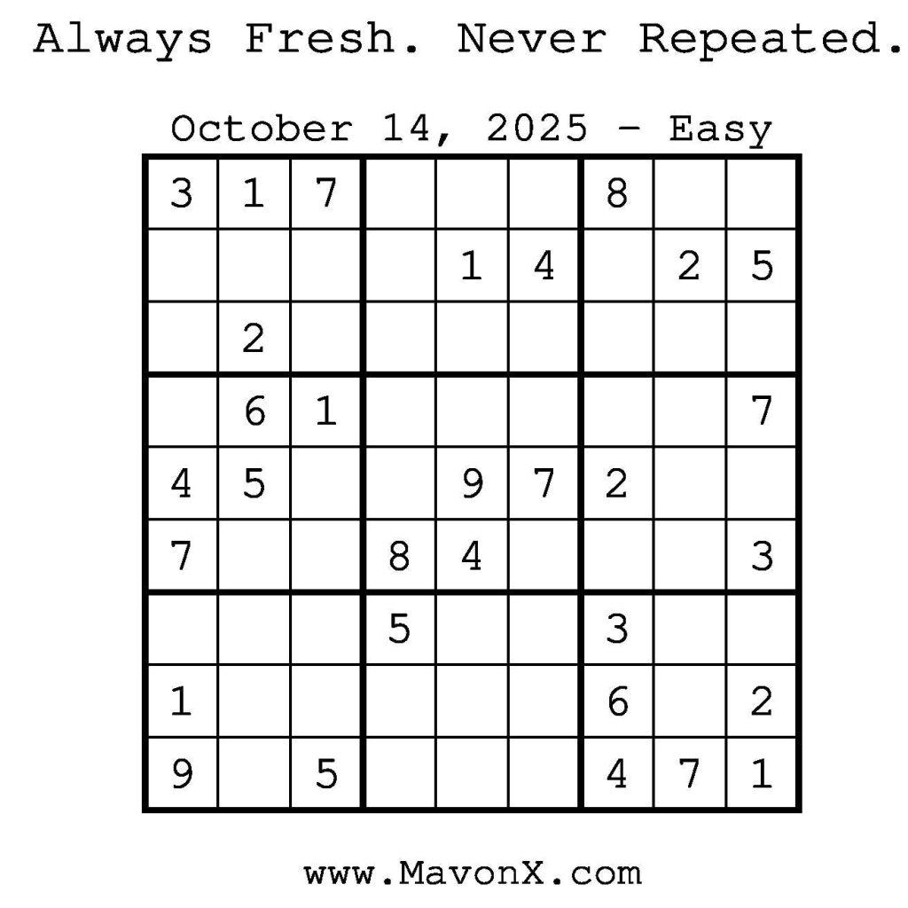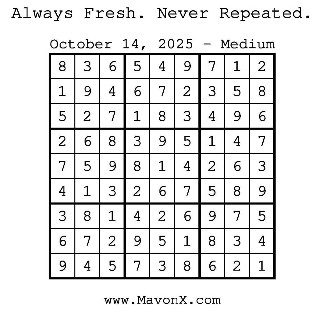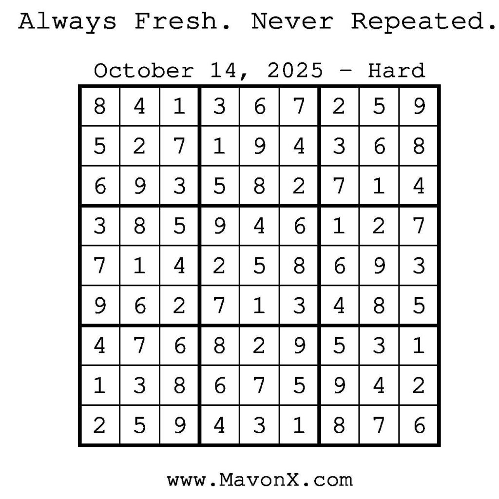 Puzzles of the Day – October 14, 2025 Post author:admin Post published:October 13, 2025 Post category:Free Stuff / Puzzle of the Day / Puzzle of the Day Solutions / Solutions Post comments:0 Comments Check out our books on Amazon! Check out our books on Barnes and Noble! Check out our books on Etsy! Easy Sudoku Coach Link Medium Sudoku Coach Link Hard Sudoku Coach Link Show Solution You Might Also Like Puzzles of the Day – December 21, 2024 December 21, 2024 Puzzles of the Day – May 28, 2025 May 27, 2025 Puzzles of the Day – December 10, 2025 December 9, 2025 Leave a Reply Cancel replyCommentEnter your name or username to comment Enter your email address to comment Enter your website URL (optional) Save my name, email, and website in this browser for the next time I comment.