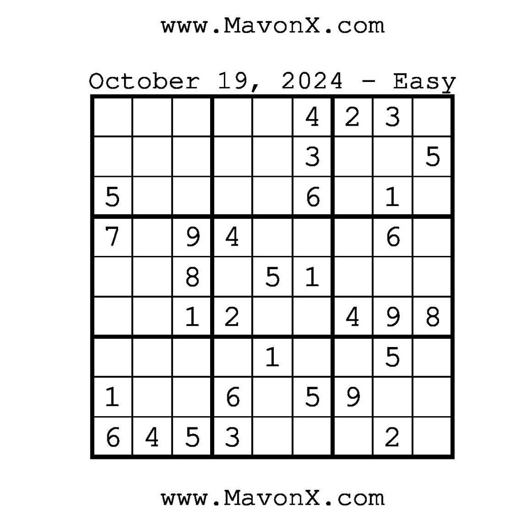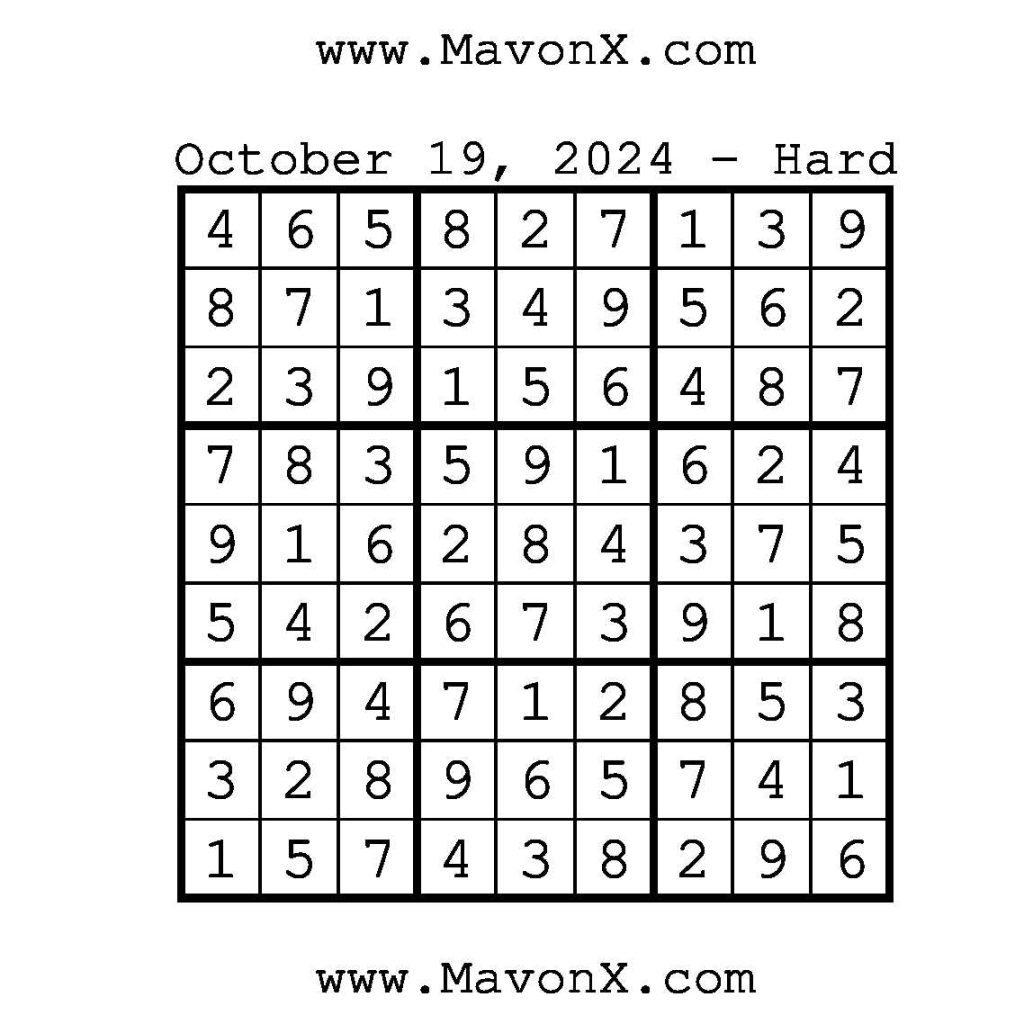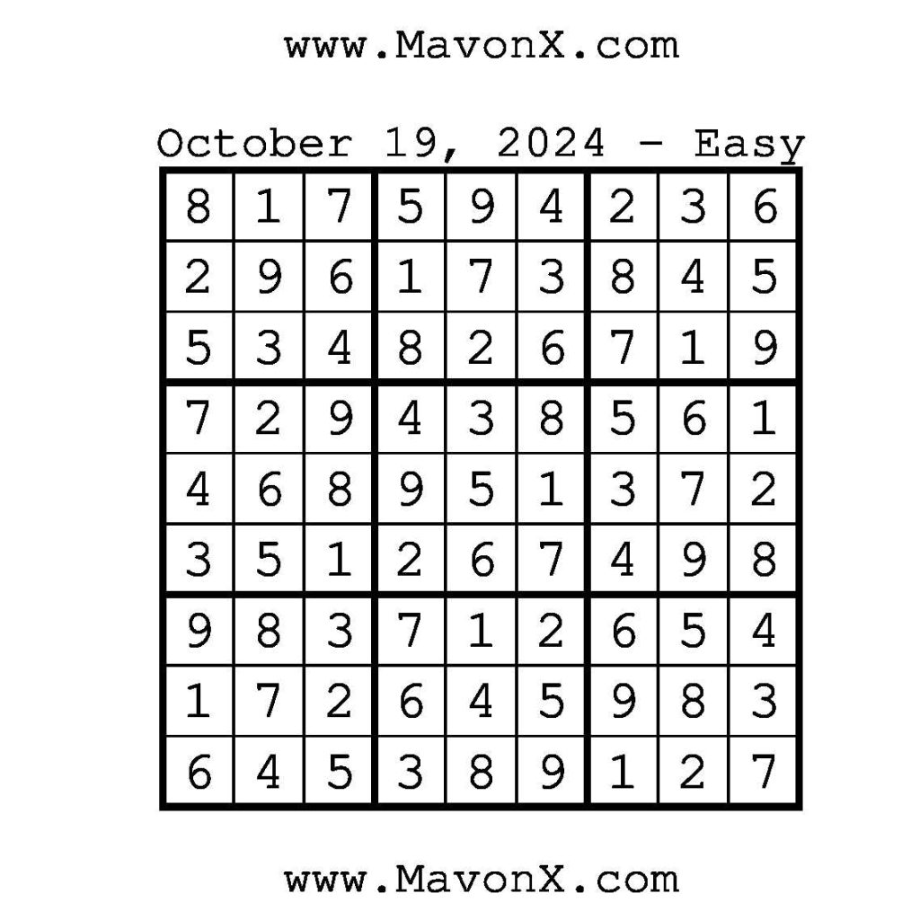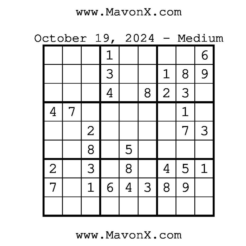 Puzzles of the Day – October 19, 2024 Post author:admin Post published:October 19, 2024 Post category:Free Stuff / Puzzle of the Day / Puzzle of the Day Solutions / Solutions Post comments:0 Comments Check out our books on Amazon!, Check out our books on Barnes and Noble!, Check out our books on Etsy! Easy Sudoku Coach Link Medium Sudoku Coach Link Hard Sudoku Coach Link Show Solution You Might Also Like Puzzles of the Day – May 4, 2025 May 4, 2025 Puzzles of the Day – November 28, 2024 November 28, 2024 Puzzles of the Day – July 6, 2025 July 7, 2025 Leave a Reply Cancel replyCommentEnter your name or username to comment Enter your email address to comment Enter your website URL (optional) Save my name, email, and website in this browser for the next time I comment.