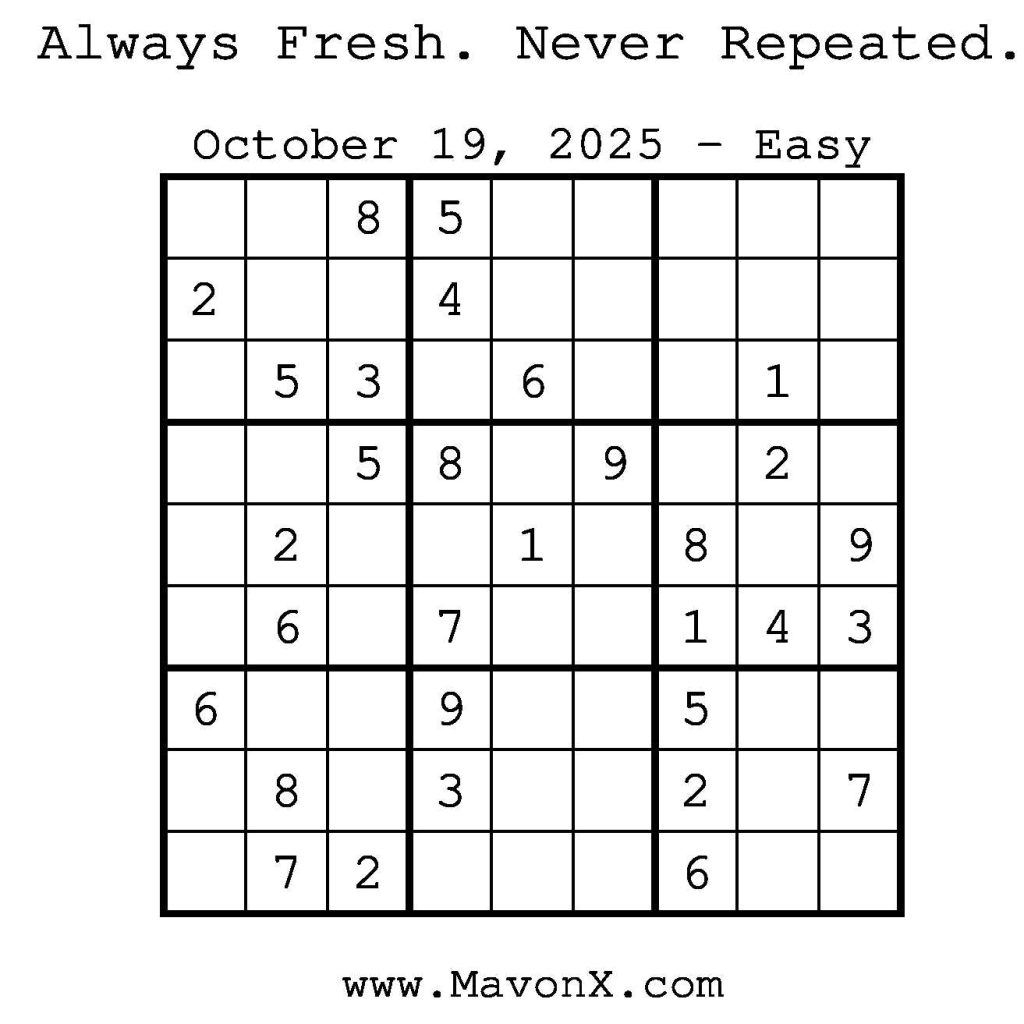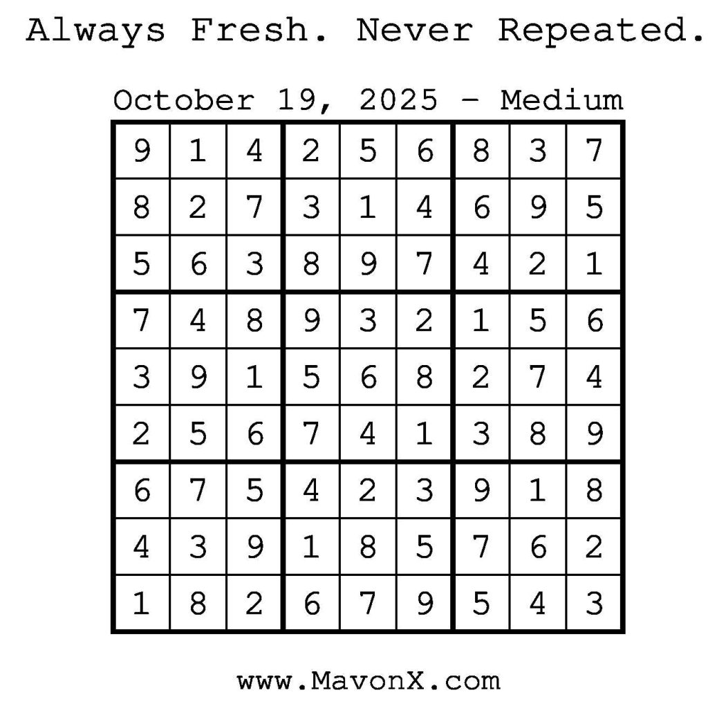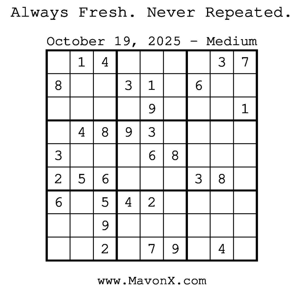 Puzzles of the Day – October 19, 2025 Post author:admin Post published:October 18, 2025 Post category:Free Stuff / Puzzle of the Day / Puzzle of the Day Solutions / Solutions Post comments:0 Comments Check out our books on Amazon! Check out our books on Barnes and Noble! Check out our books on Etsy! Easy Sudoku Coach Link Medium Sudoku Coach Link Hard Sudoku Coach Link Show Solution You Might Also Like Puzzle of the Day – July 20, 2024 July 20, 2024 Puzzles of the Day – July 23, 2025 July 23, 2025 Puzzles of the Day – June 27, 2025 June 27, 2025 Leave a Reply Cancel replyCommentEnter your name or username to comment Enter your email address to comment Enter your website URL (optional) Save my name, email, and website in this browser for the next time I comment.