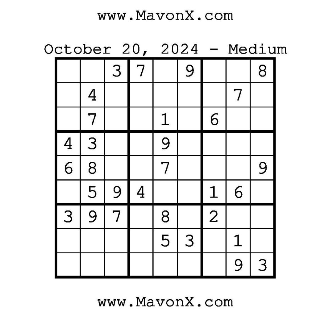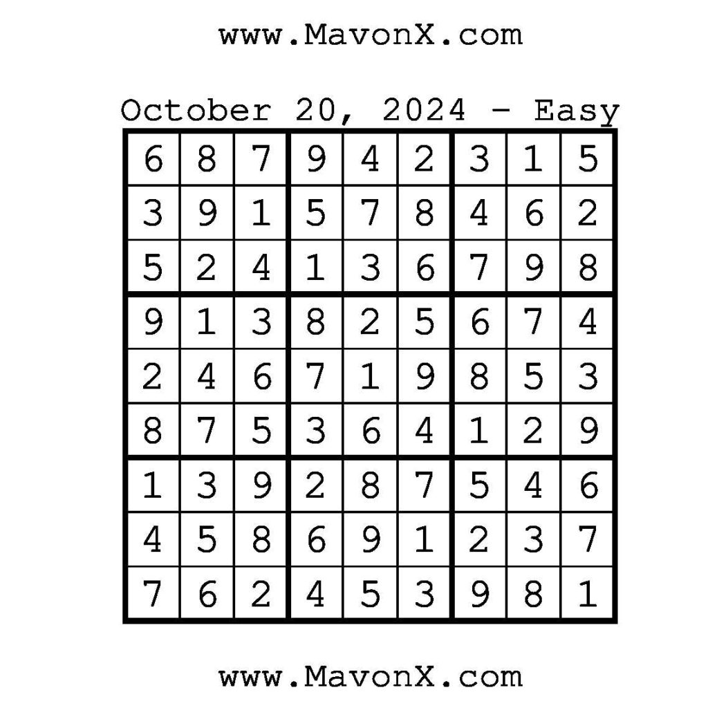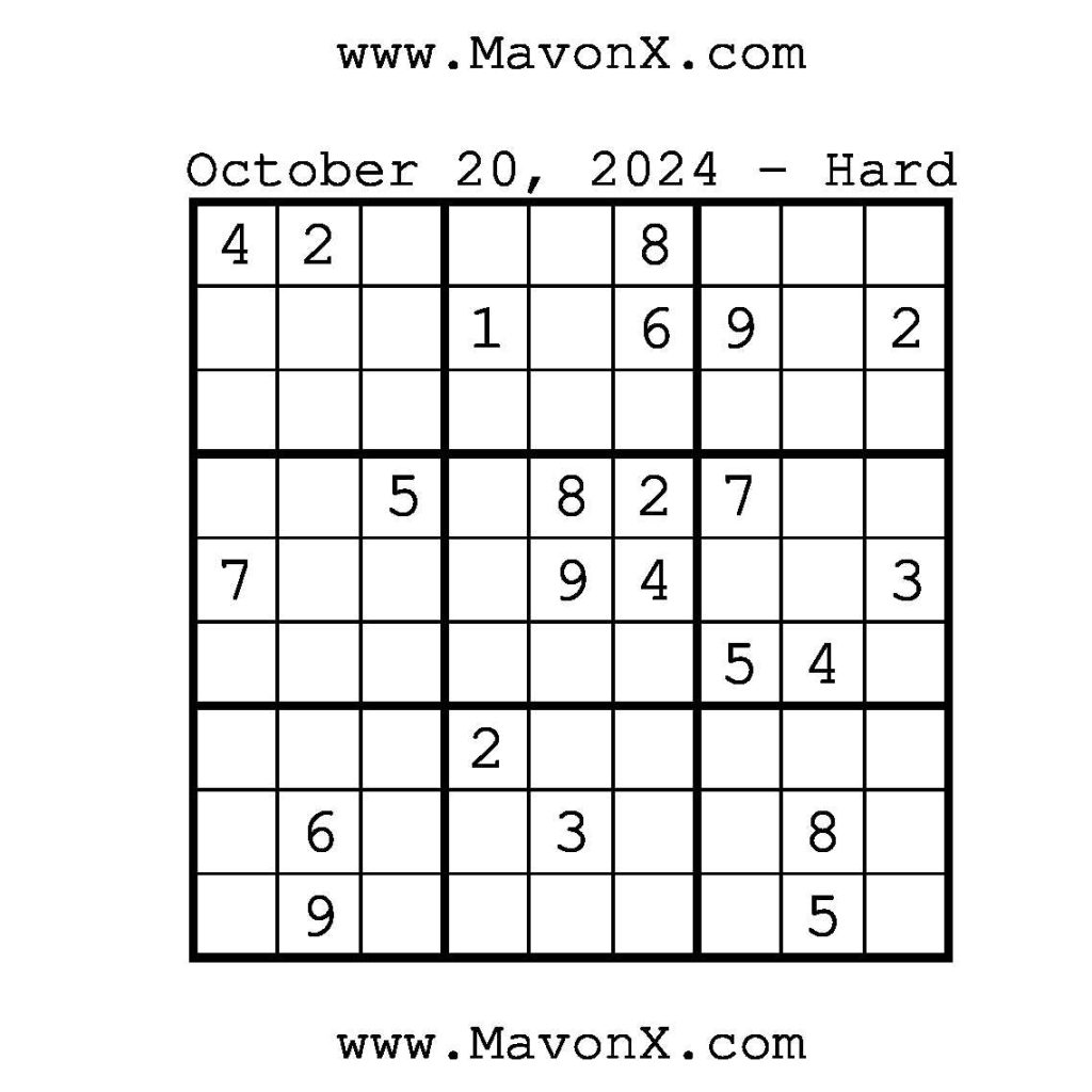 Puzzles of the Day – October 20, 2024 Post author:admin Post published:October 19, 2024 Post category:Free Stuff / Puzzle of the Day / Puzzle of the Day Solutions / Solutions Post comments:0 Comments Check out our books on Amazon!, Check out our books on Barnes and Noble!, Check out our books on Etsy! Easy Sudoku Coach Link Medium Sudoku Coach Link Hard Sudoku Coach Link Show Solution You Might Also Like Puzzles of the Day – January 4, 2025 January 4, 2025 Puzzles of the Day – January 11, 2026 January 10, 2026 Puzzles of the Day – January 16, 2026 January 15, 2026 Leave a Reply Cancel replyCommentEnter your name or username to comment Enter your email address to comment Enter your website URL (optional) Save my name, email, and website in this browser for the next time I comment.
