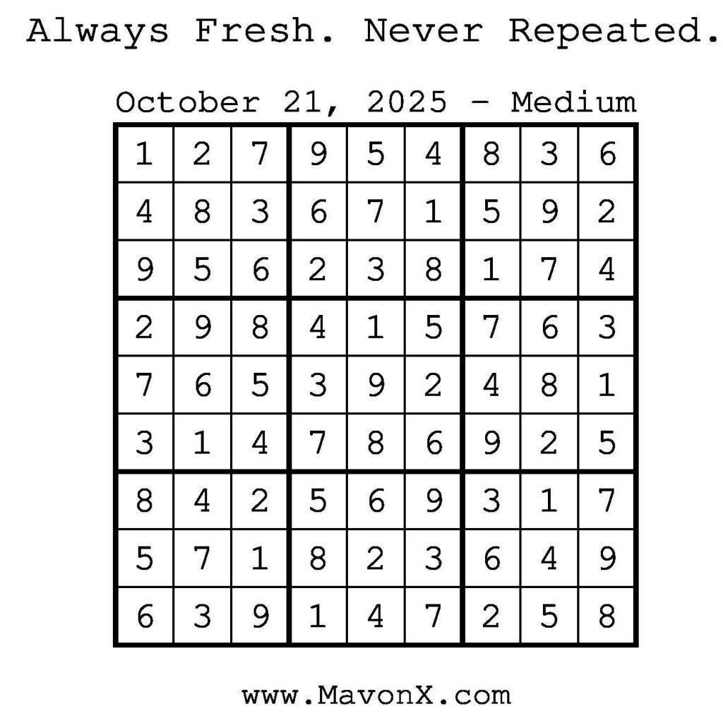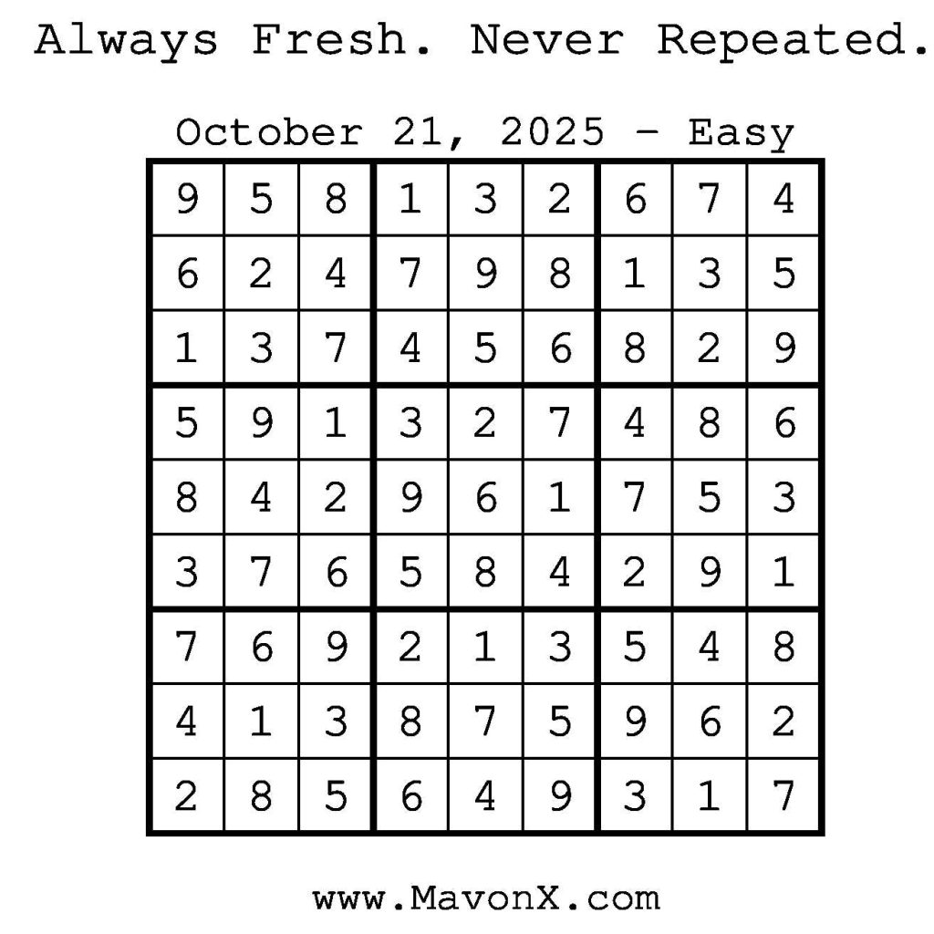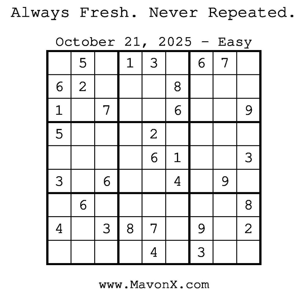 Puzzles of the Day – October 21, 2025 Post author:admin Post published:October 20, 2025 Post category:Free Stuff / Puzzle of the Day / Puzzle of the Day Solutions / Solutions Post comments:0 Comments Check out our books on Amazon! Check out our books on Barnes and Noble! Check out our books on Etsy! Easy Sudoku Coach Link Medium Sudoku Coach Link Hard Sudoku Coach Link Show Solution You Might Also Like Puzzles of the Day – September 3, 2024 September 3, 2024 Puzzles of the Day – April 15, 2026 April 14, 2026 Puzzles of the Day – April 8, 2025 April 7, 2025 Leave a Reply Cancel replyCommentEnter your name or username to comment Enter your email address to comment Enter your website URL (optional) Save my name, email, and website in this browser for the next time I comment.