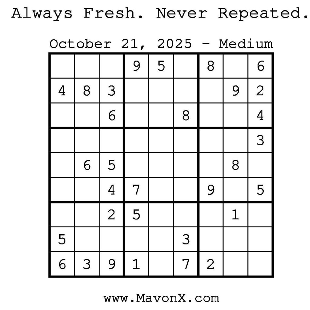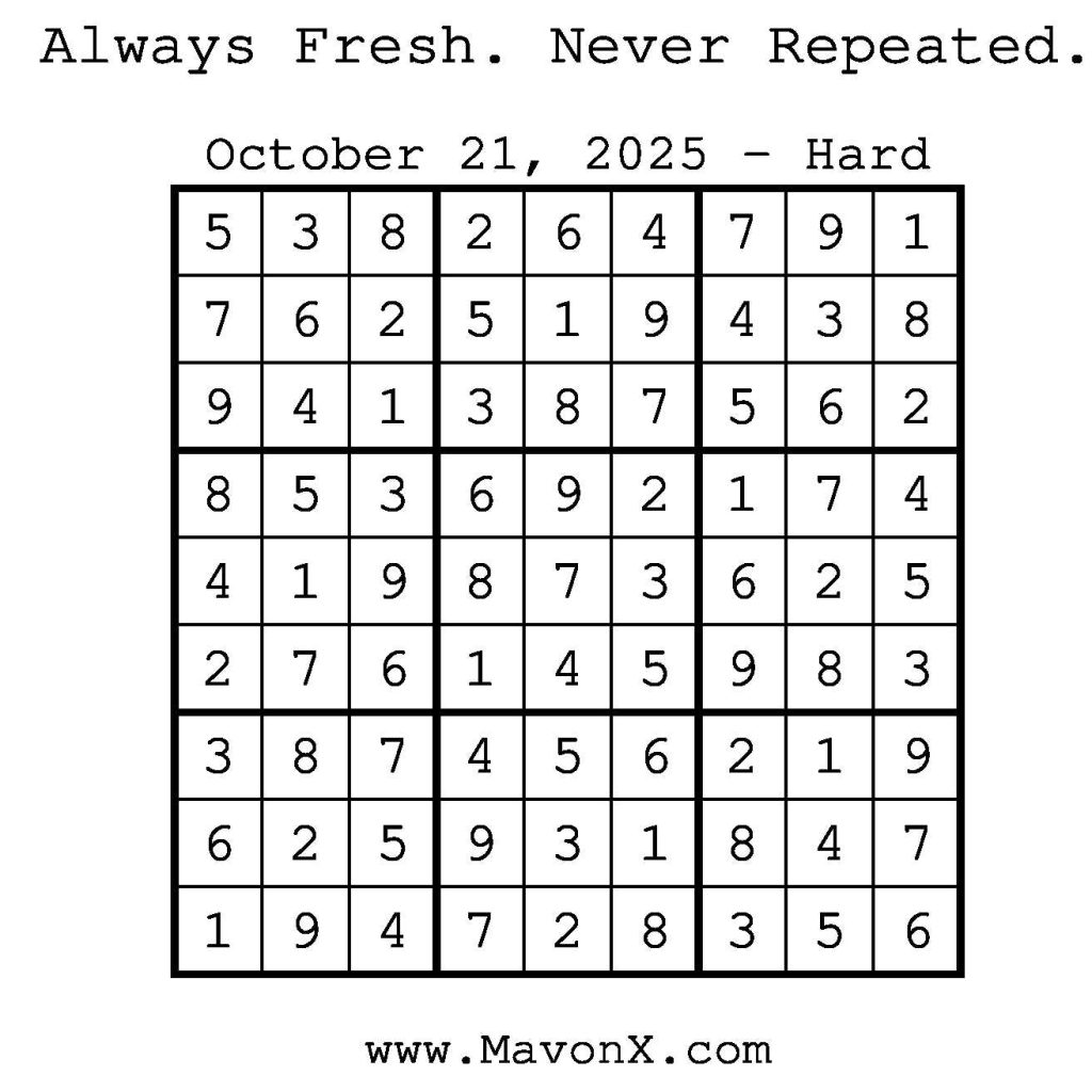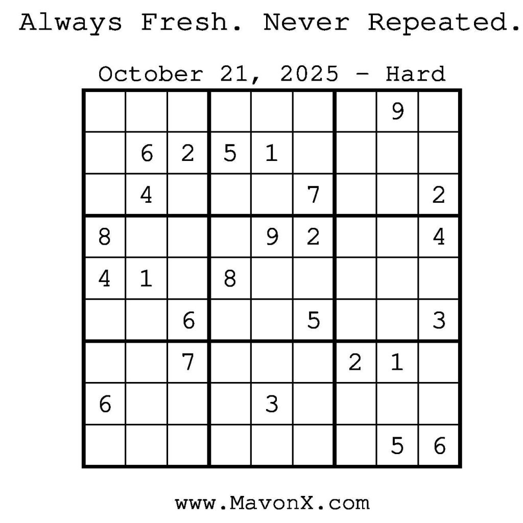 Puzzles of the Day – October 21, 2025 Post author:admin Post published:October 20, 2025 Post category:Free Stuff / Puzzle of the Day / Puzzle of the Day Solutions / Solutions Post comments:0 Comments Check out our books on Amazon! Check out our books on Barnes and Noble! Check out our books on Etsy! Easy Sudoku Coach Link Medium Sudoku Coach Link Hard Sudoku Coach Link Show Solution You Might Also Like Puzzles of the Day – September 3, 2024 September 3, 2024 Puzzles of the Day – April 15, 2026 April 14, 2026 Puzzles of the Day – April 8, 2025 April 7, 2025 Leave a Reply Cancel replyCommentEnter your name or username to comment Enter your email address to comment Enter your website URL (optional) Save my name, email, and website in this browser for the next time I comment.