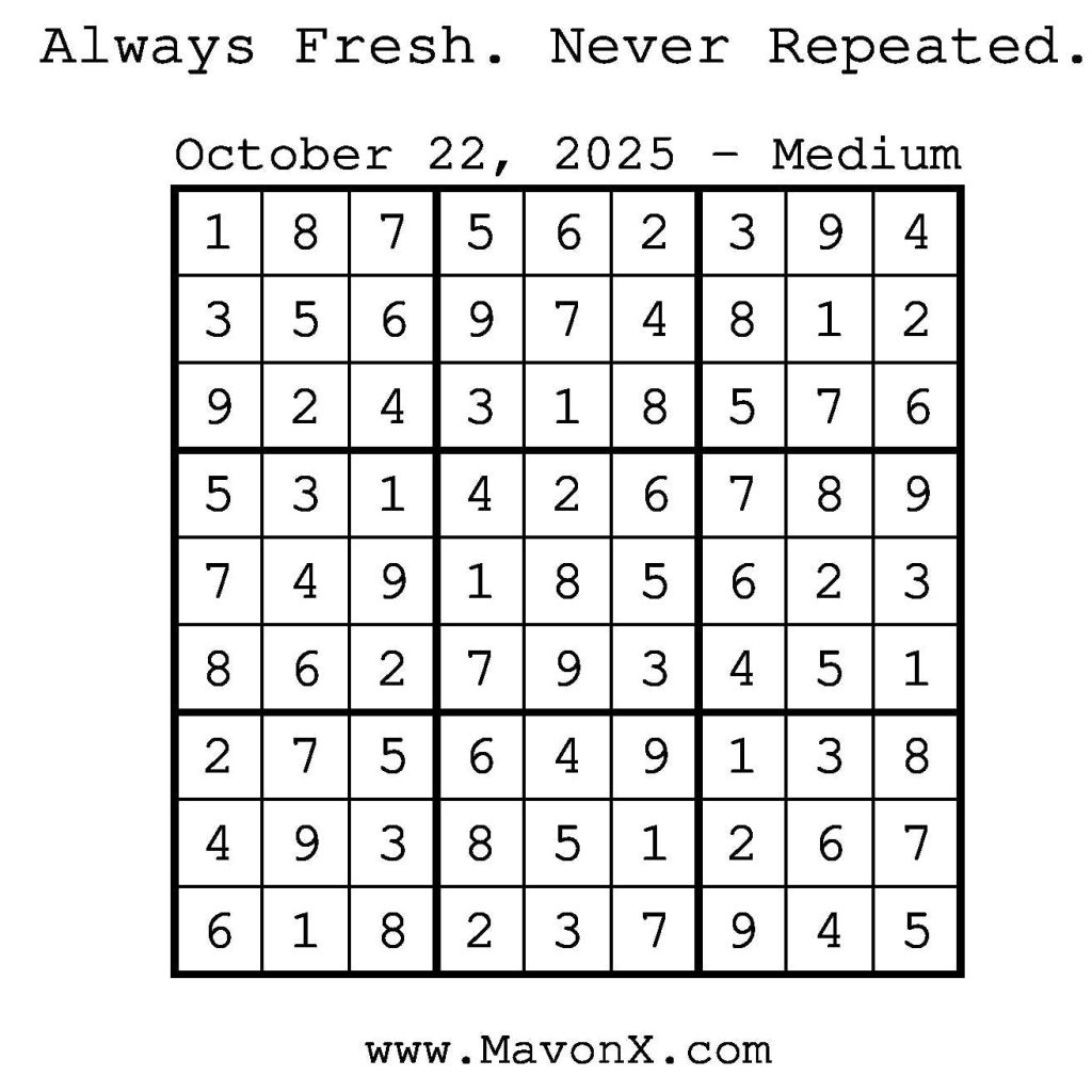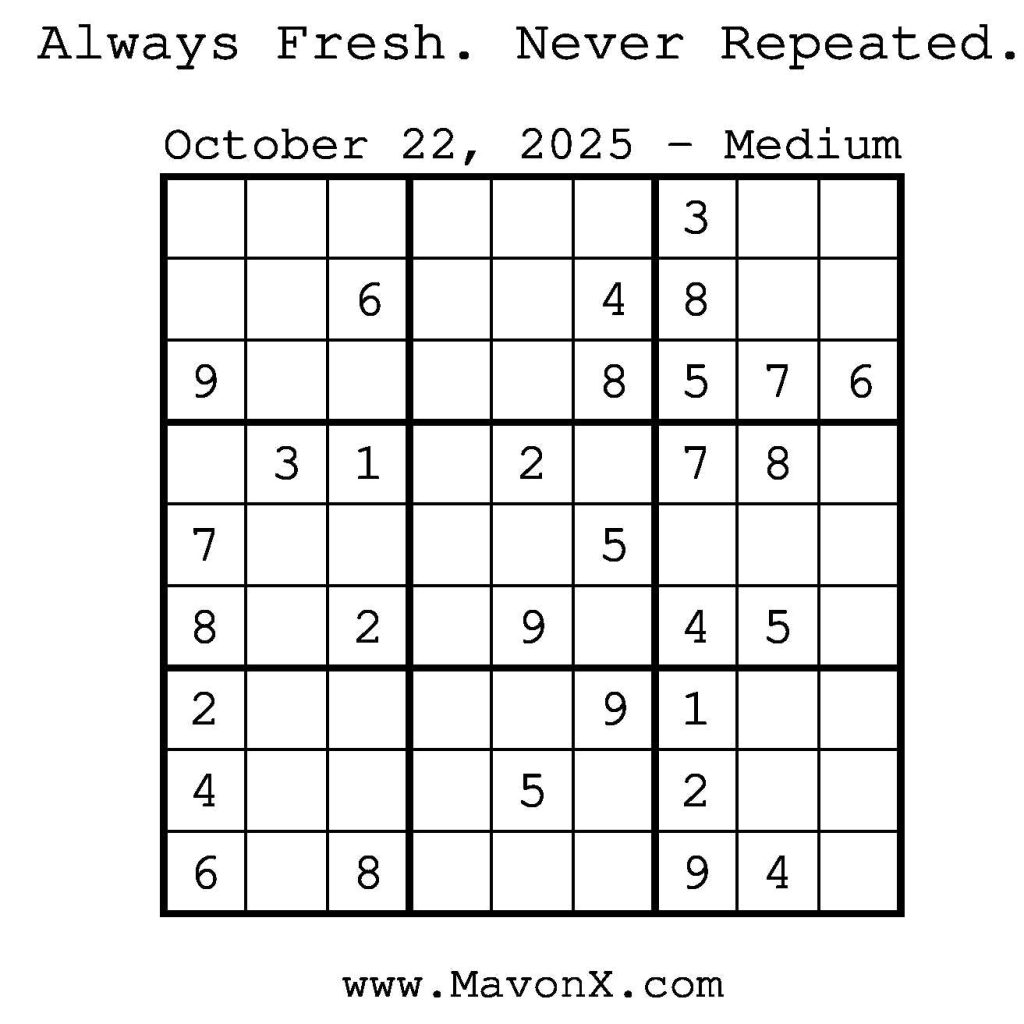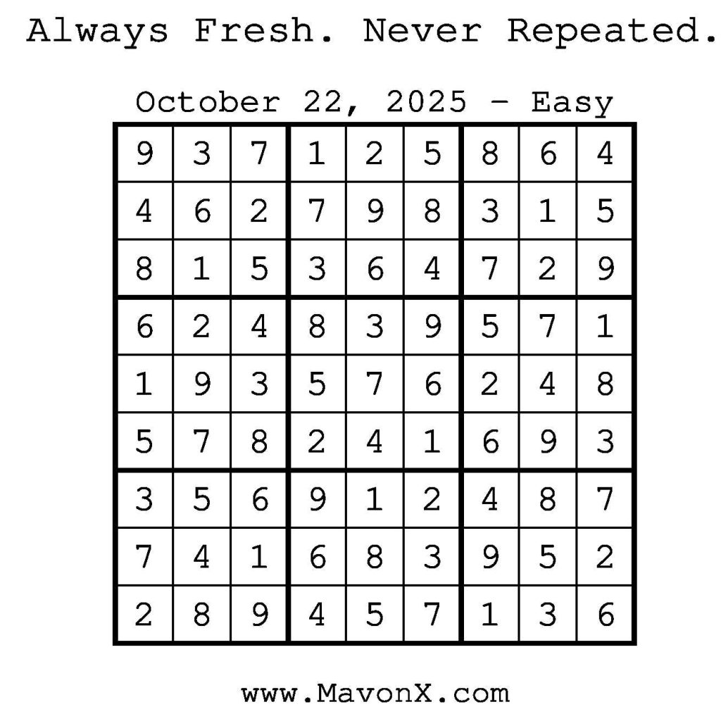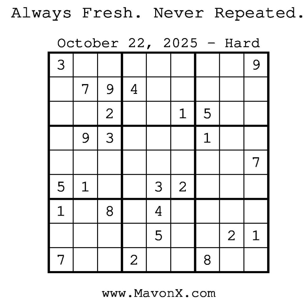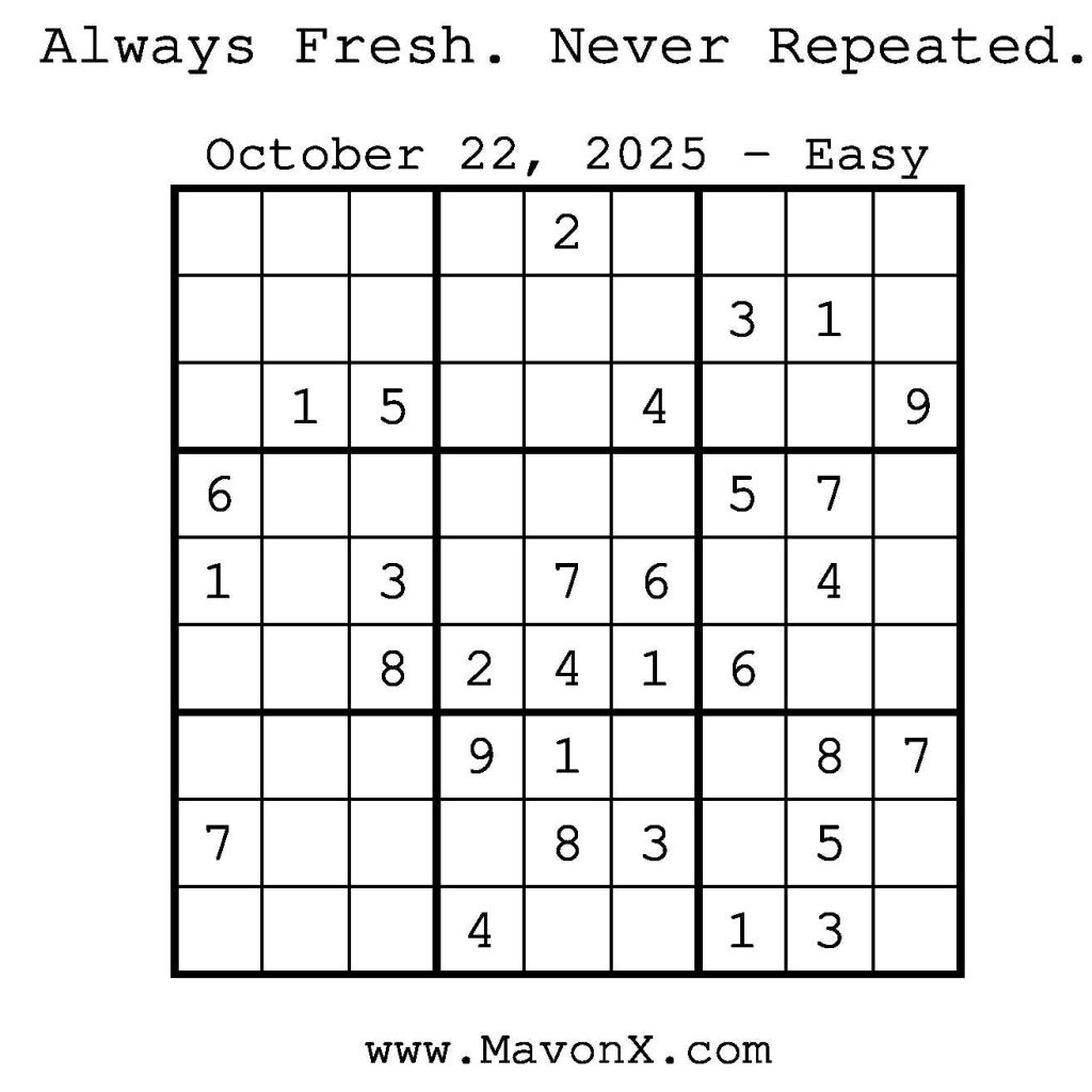 Puzzles of the Day – October 22, 2025 Post author:admin Post published:October 22, 2025 Post category:Free Stuff / Puzzle of the Day / Puzzle of the Day Solutions / Solutions Post comments:0 Comments Check out our books on Amazon! Check out our books on Barnes and Noble! Check out our books on Etsy! Easy Sudoku Coach Link Medium Sudoku Coach Link Hard Sudoku Coach Link Show Solution You Might Also Like Puzzles of the Day – September 20, 2024 September 20, 2024 Puzzles of the Day – December 05, 2025 December 4, 2025 Puzzles of the Day – April 12, 2025 April 12, 2025 Leave a Reply Cancel replyCommentEnter your name or username to comment Enter your email address to comment Enter your website URL (optional) Save my name, email, and website in this browser for the next time I comment.