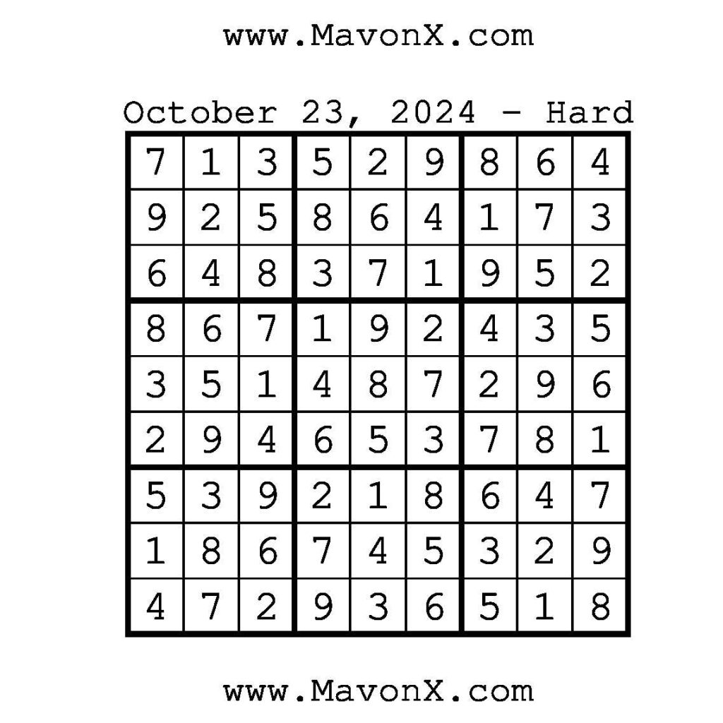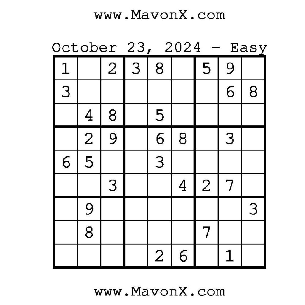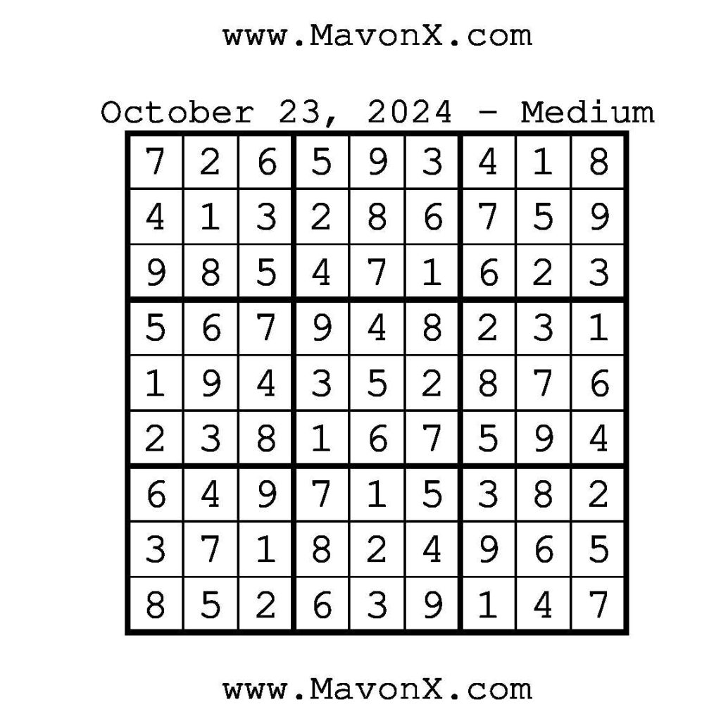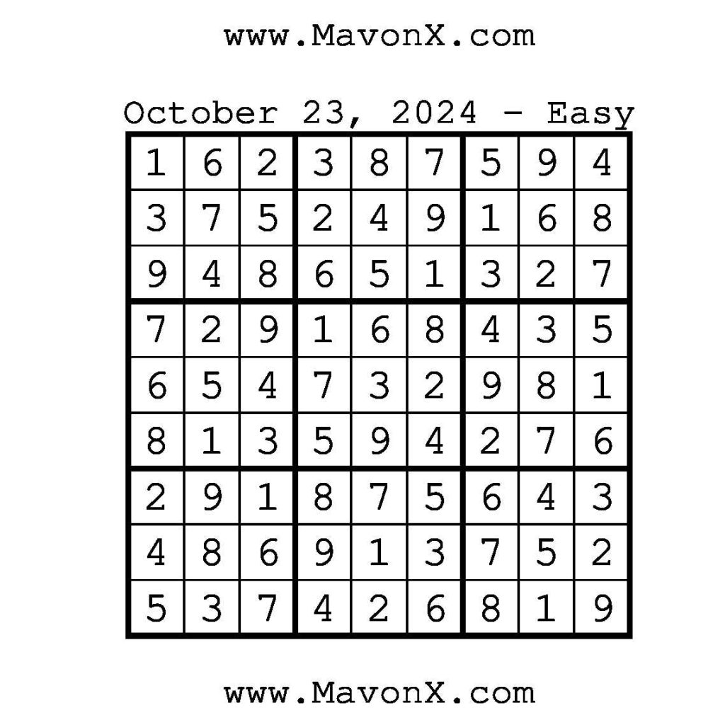 Puzzles of the Day – October 23, 2024 Post author:admin Post published:October 23, 2024 Post category:Free Stuff / Puzzle of the Day / Puzzle of the Day Solutions / Solutions Post comments:0 Comments Check out our books on Amazon!, Check out our books on Barnes and Noble!, Check out our books on Etsy! Easy Sudoku Coach Link Medium Sudoku Coach Link Hard Sudoku Coach Link Show Solution You Might Also Like Puzzles of the Day – May 3, 2025 May 2, 2025 Puzzles of the Day – June 2, 2025 June 1, 2025 Puzzles of the Day – November 17, 2025 November 17, 2025 Leave a Reply Cancel replyCommentEnter your name or username to comment Enter your email address to comment Enter your website URL (optional) Save my name, email, and website in this browser for the next time I comment.