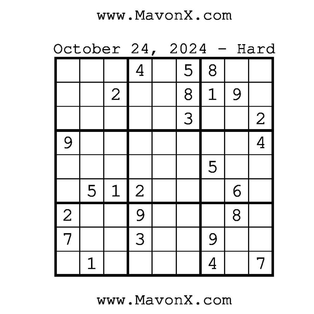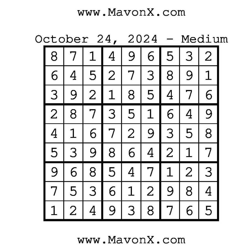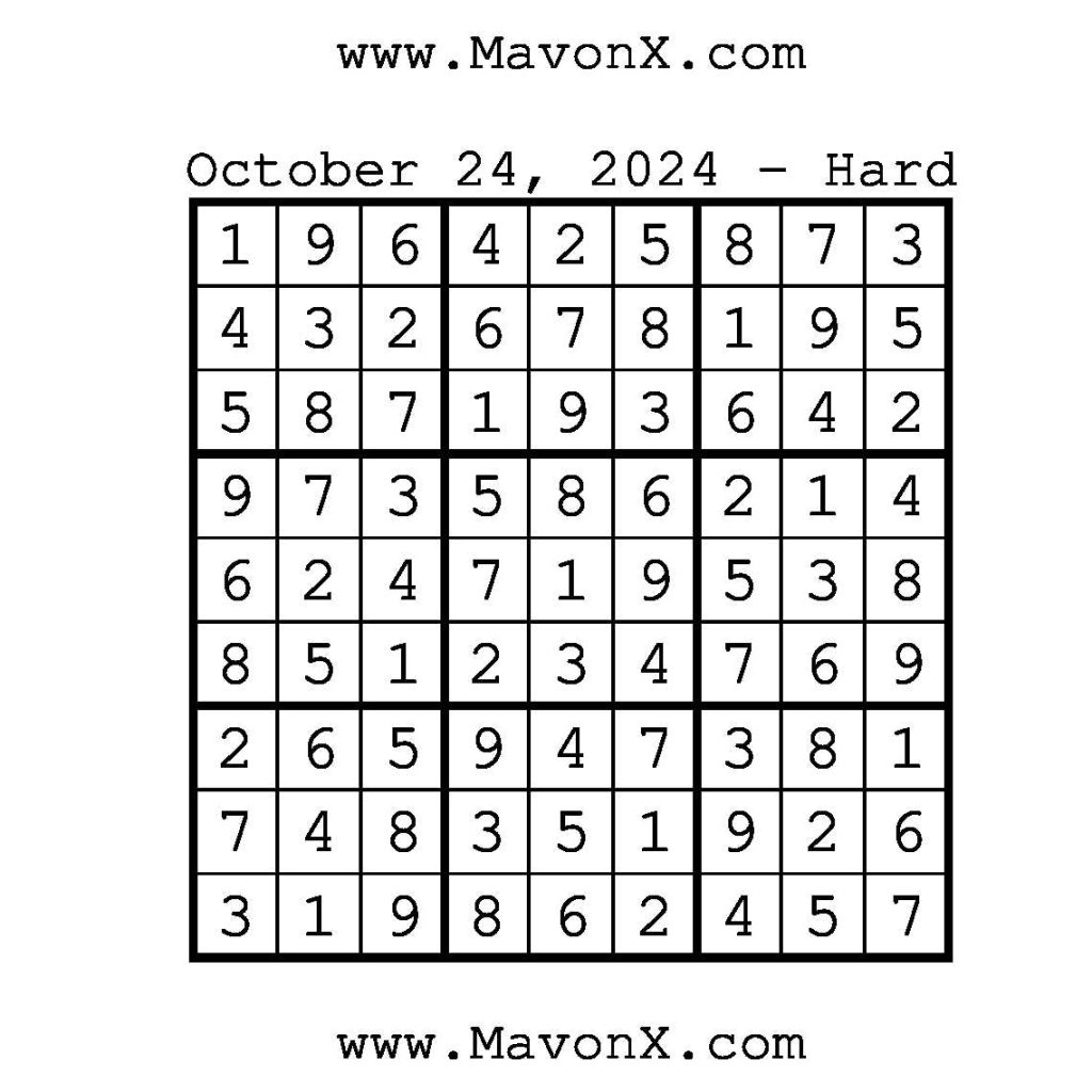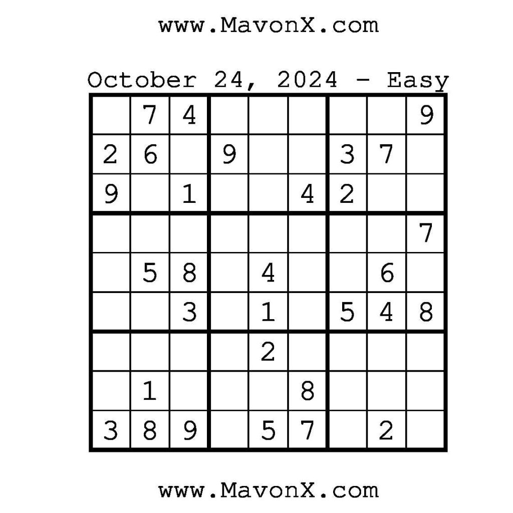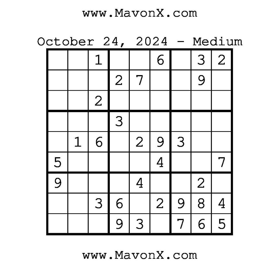 Puzzles of the Day – October 24, 2024 Post author:admin Post published:October 23, 2024 Post category:Free Stuff / Puzzle of the Day / Puzzle of the Day Solutions / Solutions Post comments:0 Comments Check out our books on Amazon!, Check out our books on Barnes and Noble!, Check out our books on Etsy! Easy Sudoku Coach Link Medium Sudoku Coach Link Hard Sudoku Coach Link Show Solution You Might Also Like Puzzles of the Day – November 6, 2025 November 5, 2025 Puzzles of the Day – November 22, 2024 November 21, 2024 Puzzles of the Day – April 1, 2026 March 31, 2026 Leave a Reply Cancel replyCommentEnter your name or username to comment Enter your email address to comment Enter your website URL (optional) Save my name, email, and website in this browser for the next time I comment.