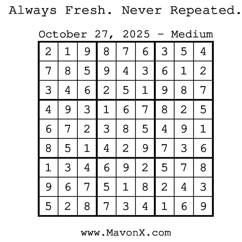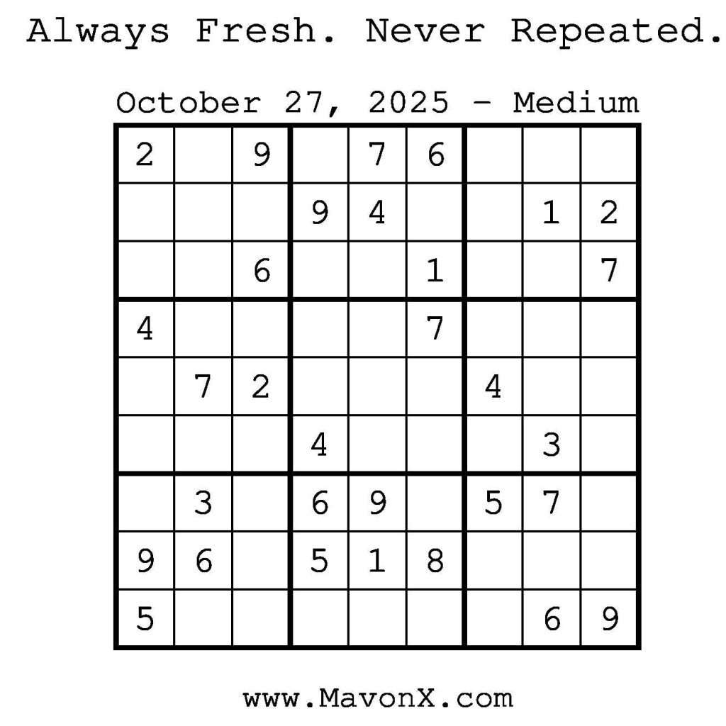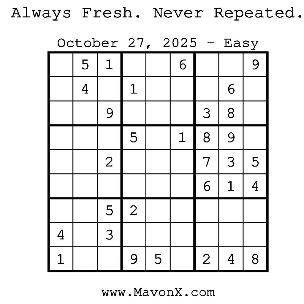 Puzzles of the Day – October 27, 2025 Post author:admin Post published:October 27, 2025 Post category:Free Stuff / Puzzle of the Day / Puzzle of the Day Solutions / Solutions Post comments:0 Comments Check out our books on Amazon! Check out our books on Barnes and Noble! Check out our books on Etsy! Easy Sudoku Coach Link Medium Sudoku Coach Link Hard Sudoku Coach Link Show Solution You Might Also Like Puzzles of the Day – July 19, 2025 July 19, 2025 Puzzles of the Day – May 11, 2025 May 10, 2025 Puzzles of the Day – March 21, 2025 March 21, 2025 Leave a Reply Cancel replyCommentEnter your name or username to comment Enter your email address to comment Enter your website URL (optional) Save my name, email, and website in this browser for the next time I comment.
