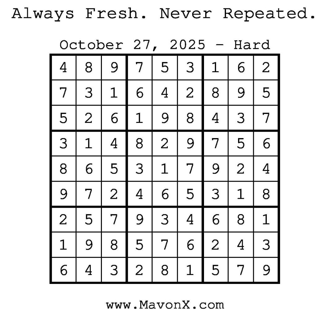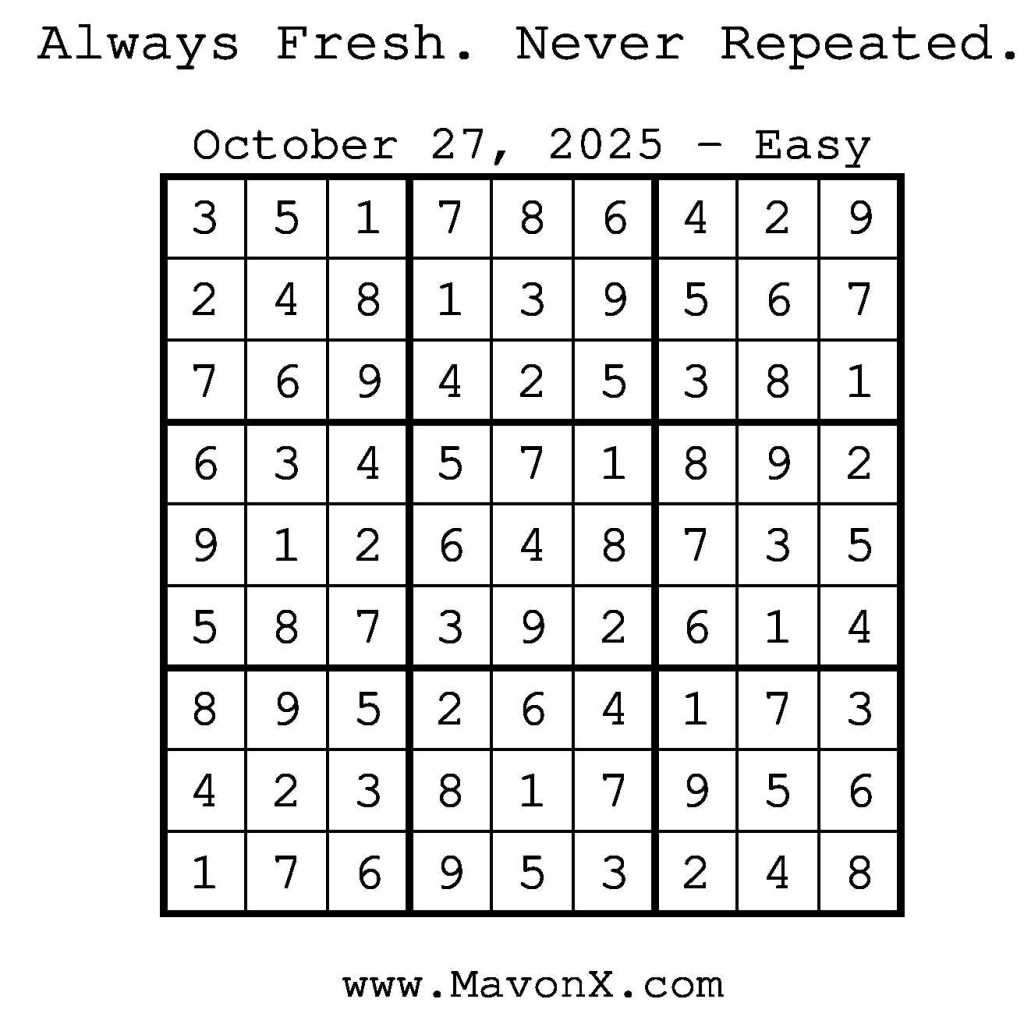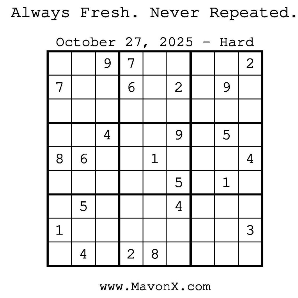 Puzzles of the Day – October 27, 2025 Post author:admin Post published:October 27, 2025 Post category:Free Stuff / Puzzle of the Day / Puzzle of the Day Solutions / Solutions Post comments:0 Comments Check out our books on Amazon! Check out our books on Barnes and Noble! Check out our books on Etsy! Easy Sudoku Coach Link Medium Sudoku Coach Link Hard Sudoku Coach Link Show Solution You Might Also Like Puzzles of the Day – July 19, 2025 July 19, 2025 Puzzles of the Day – May 11, 2025 May 10, 2025 Puzzles of the Day – March 21, 2025 March 21, 2025 Leave a Reply Cancel replyCommentEnter your name or username to comment Enter your email address to comment Enter your website URL (optional) Save my name, email, and website in this browser for the next time I comment.