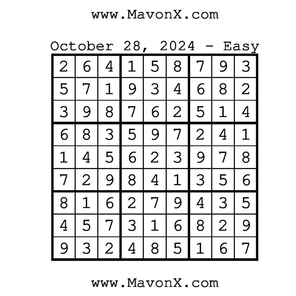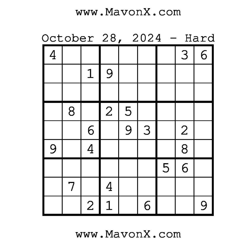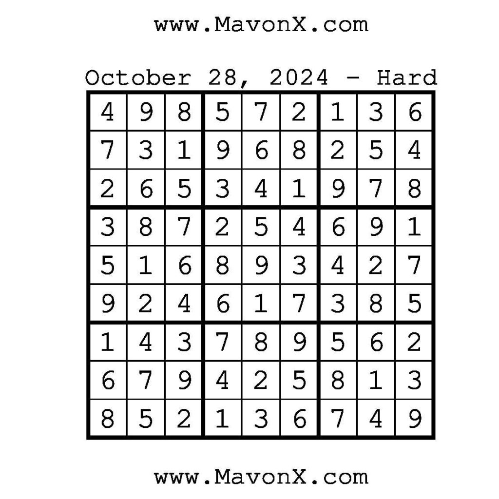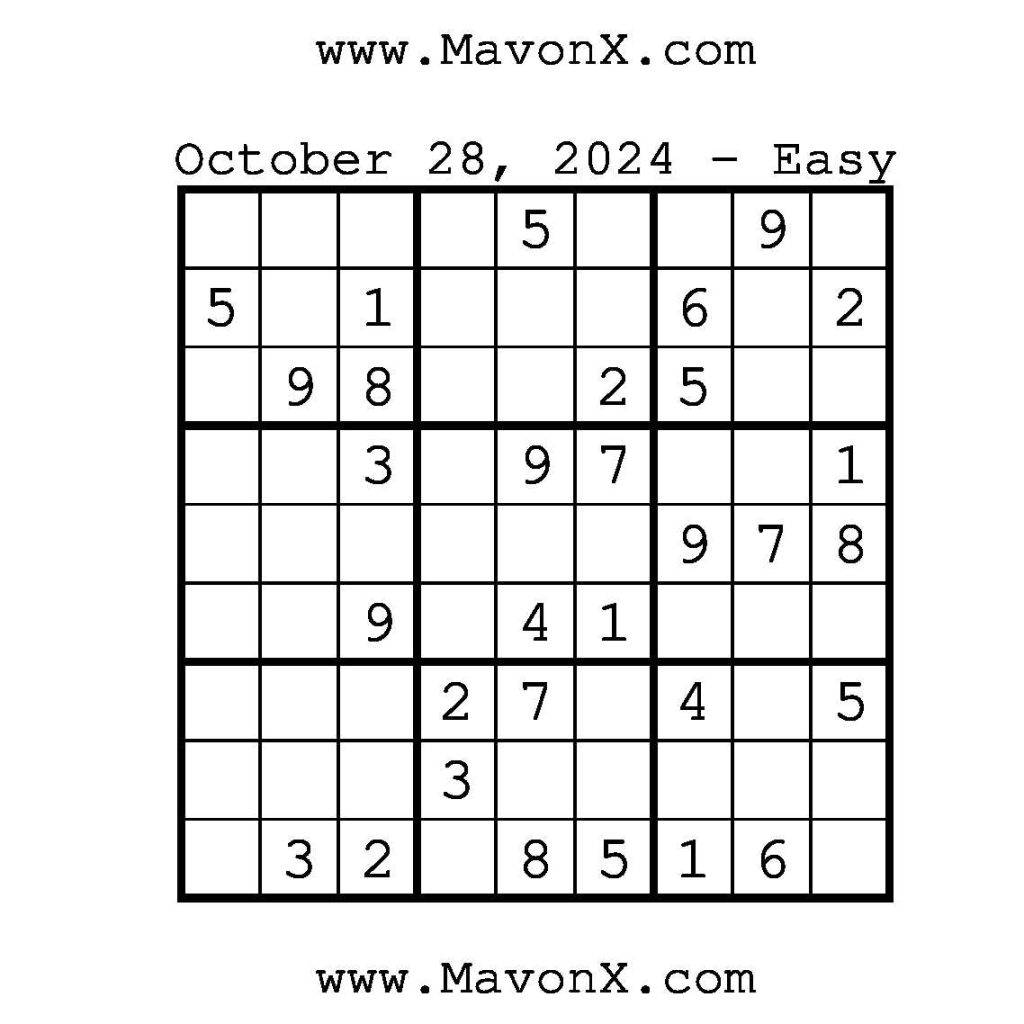 Puzzles of the Day – October 28, 2024 Post author:admin Post published:October 28, 2024 Post category:Free Stuff / Puzzle of the Day / Puzzle of the Day Solutions / Solutions Post comments:0 Comments Check out our books on Amazon!, Check out our books on Barnes and Noble!, Check out our books on Etsy! Easy Sudoku Coach Link Medium Sudoku Coach Link Hard Sudoku Coach Link Show Solution You Might Also Like Puzzles of the Day – December 27, 2025 December 27, 2025 Puzzles of the Day – March 24, 2026 March 23, 2026 Puzzles of the Day – April 11, 2026 April 11, 2026 Leave a Reply Cancel replyCommentEnter your name or username to comment Enter your email address to comment Enter your website URL (optional) Save my name, email, and website in this browser for the next time I comment.