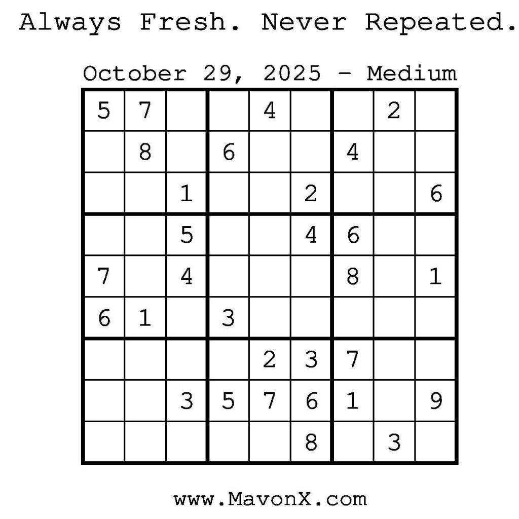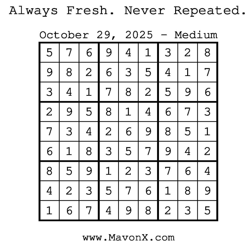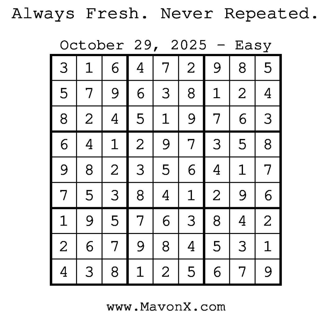 Puzzles of the Day – October 29, 2025 Post author:admin Post published:October 28, 2025 Post category:Free Stuff / Puzzle of the Day / Puzzle of the Day Solutions / Solutions Post comments:0 Comments Check out our books on Amazon! Check out our books on Barnes and Noble! Check out our books on Etsy! Easy Sudoku Coach Link Medium Sudoku Coach Link Hard Sudoku Coach Link Show Solution You Might Also Like Puzzles of the Day – February 14, 2026 February 14, 2026 Puzzles of the Day – November 13, 2025 November 12, 2025 Puzzles of the Day – September 1, 2025 August 31, 2025 Leave a Reply Cancel replyCommentEnter your name or username to comment Enter your email address to comment Enter your website URL (optional) Save my name, email, and website in this browser for the next time I comment.