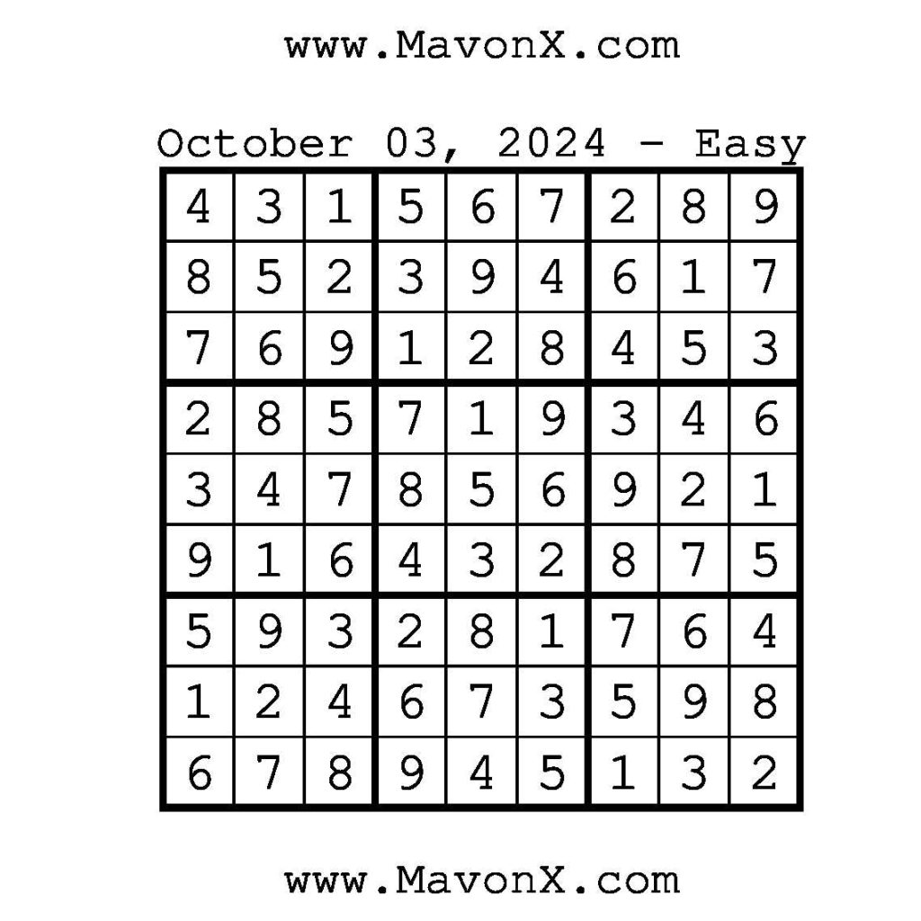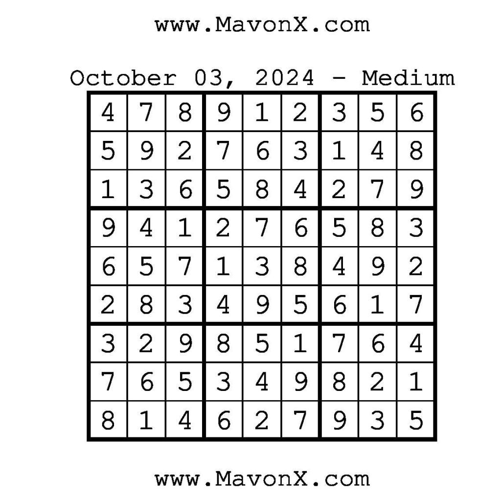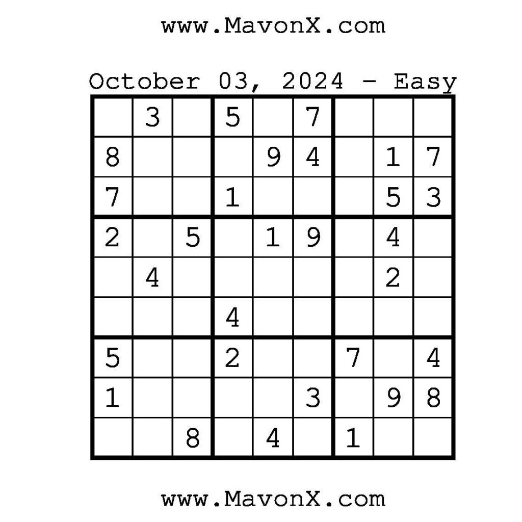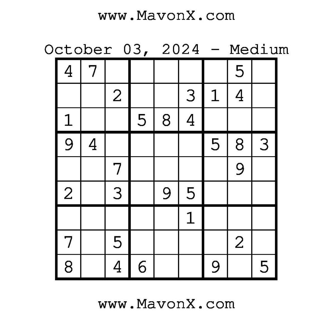 Puzzles of the Day – October 3, 2024 Post author:admin Post published:October 3, 2024 Post category:Free Stuff / Puzzle of the Day / Puzzle of the Day Solutions / Solutions Post comments:0 Comments Check out our books on Amazon!!!!! Easy Sudoku Coach Link Medium Sudoku Coach Link Hard Sudoku Coach Link Show Solution You Might Also Like Puzzles of the Day – May 8, 2025 May 7, 2025 Puzzles of the Day – November 21, 2024 November 21, 2024 Puzzles of the Day – February 10, 2026 February 10, 2026 Leave a Reply Cancel replyCommentEnter your name or username to comment Enter your email address to comment Enter your website URL (optional) Save my name, email, and website in this browser for the next time I comment.